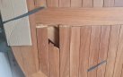 Uszkodzenie: uszkodzenie w transporcie: złamana 1 deseczka (jest w opakowaniu). Stół wymaga naprawy.