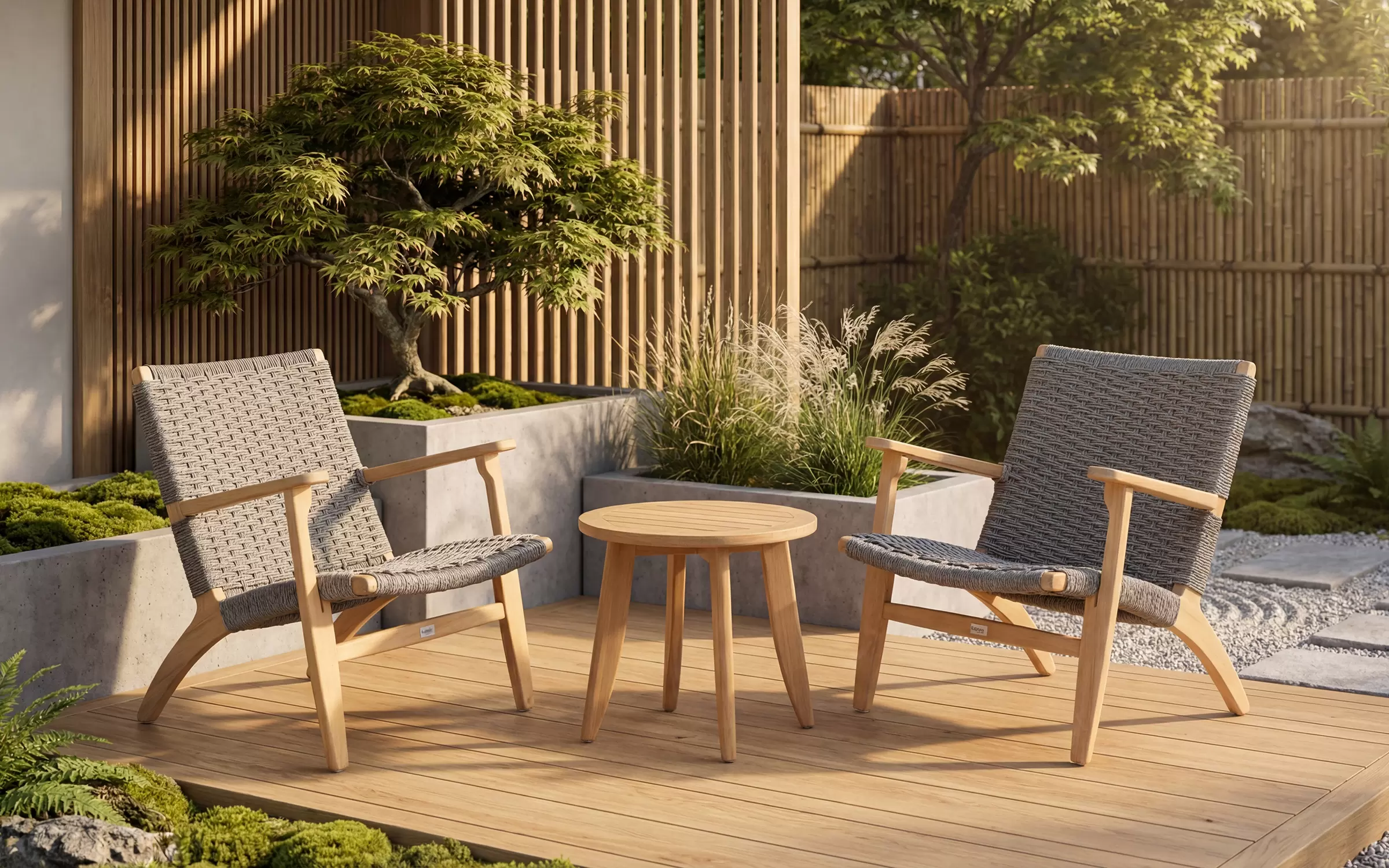 Drewno teak premium – naturalne, trwałe, odporne na warunki atmosferyczne; konstrukcja foteli i stolika.