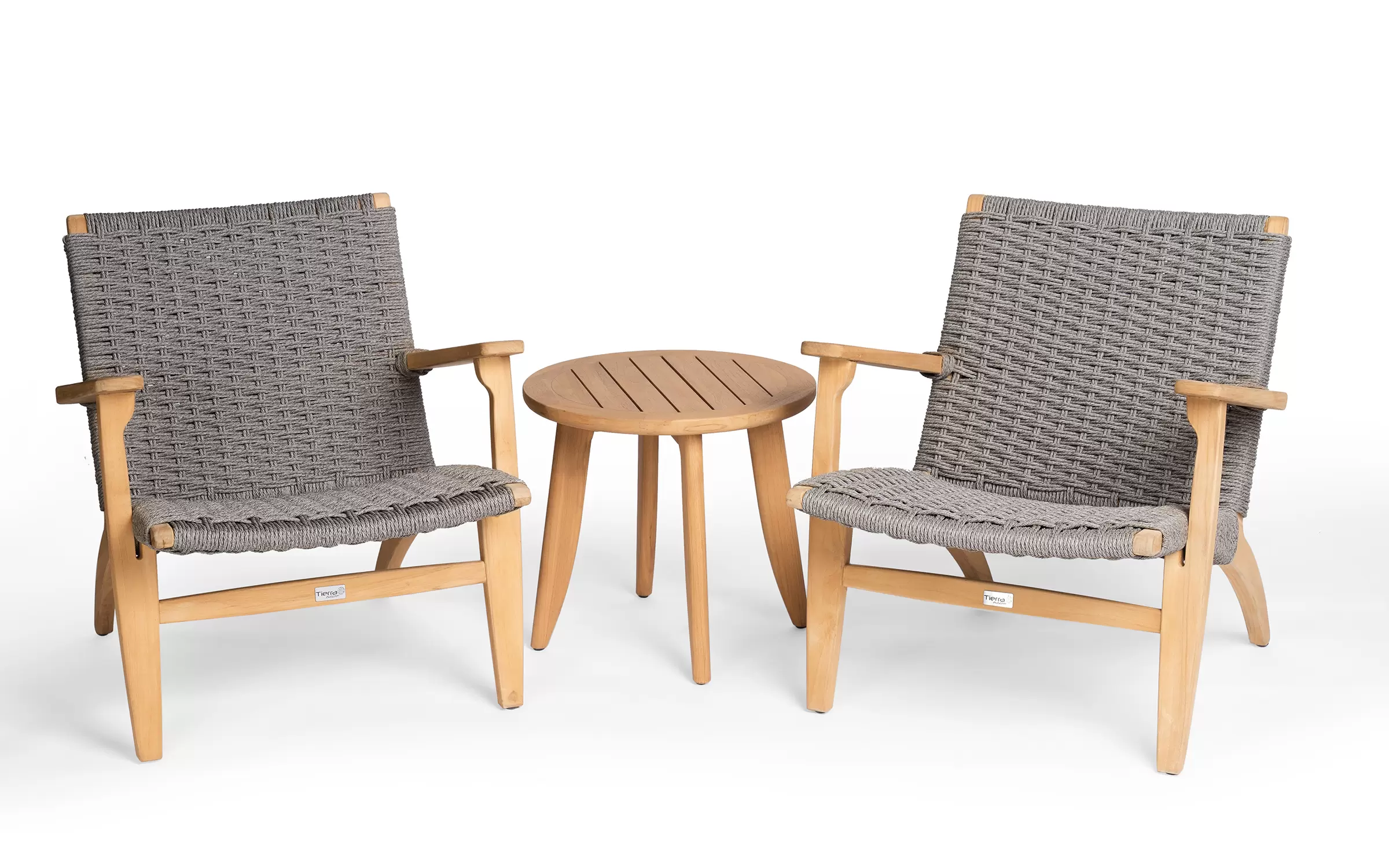 Fotele oparte na masywnej ramie tekowej oferują siedzisko i oparcie z odpornej na warunki zewnętrzne plecionki – materiału, który nie traci formy ani koloru przez lata użytkowania. Całość dopełnia okrągły stolik kawowy z blatem z drewna teak, gotowy na poranną kawę, letni drink czy wieczorne przekąski.