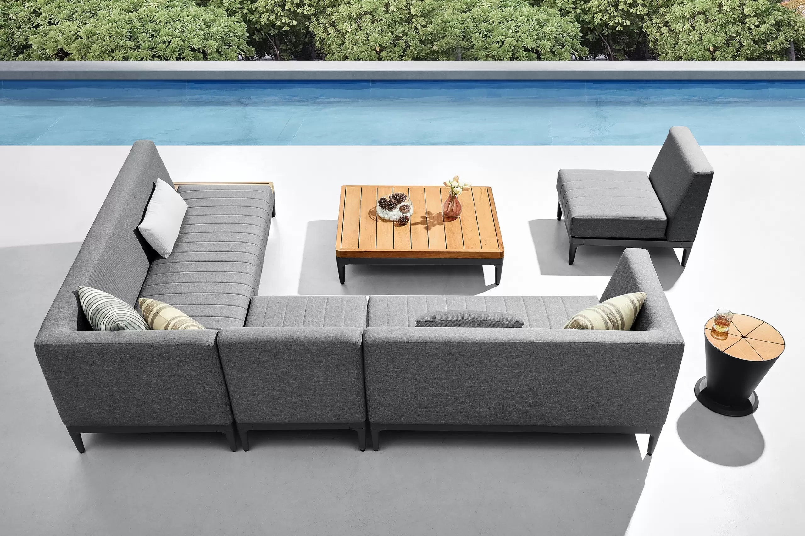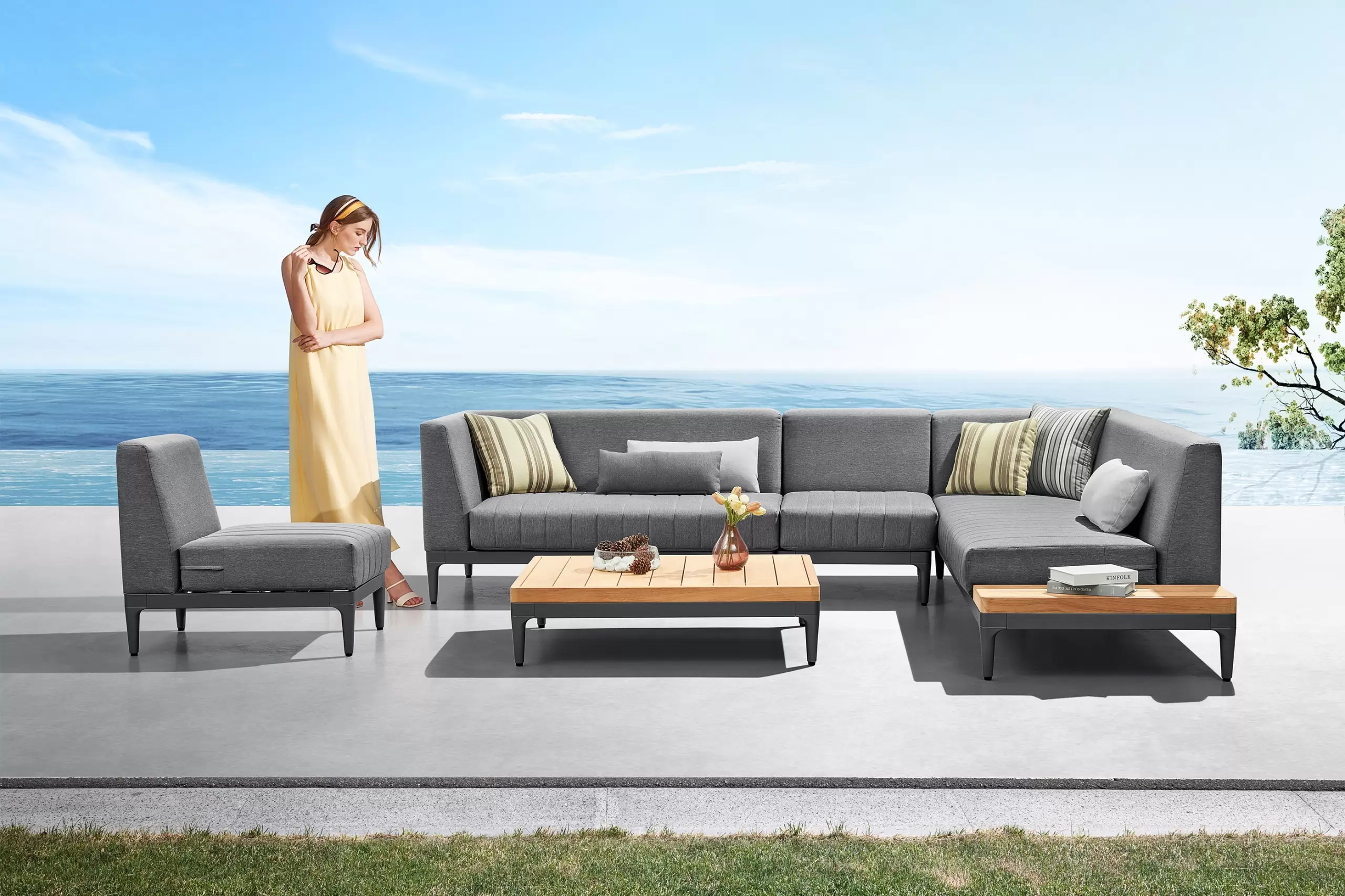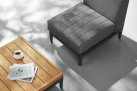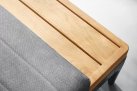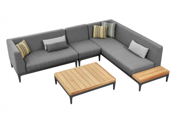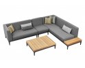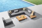 Aluminiowy modułowy narożnik ogrodowy na taras firmy HIGOLD w nowoczesnym stylu. Konstrukcja opiera się na spawanej ramie aluminiowej malowanej proszkowo, elementach dekoracyjnych z teaku i z wygodnych poduszek z obiciami z materiału Olefin. Oparcie także jest obite materiałęm Olefin w jaśniejszym kolorze. Narożnik Sira zawiera narożnik złożony z 3 elementów: podwójnej sofy po prawej stronie, potrójnej sofę po lewej stronie, element poszerzający, stolik kawowy i dekoracyjne poduszki. Konstrukcja mebli jest wykonana z profili aluminiowych malowanych proszkowo, która jest odporna na mechaniczne uszkodzenia i niekorzystne czynniki zewnętrzne. Konstrukcja jest połączona z eleganckimi elementami z drewna tekowego. Grube poduszki siedziska i oparcia - wygodne i wykonane z pianki o wysokiej gęstości, z wykorzystaniem wysokiej jakości obicia z tkaniny olefinowej, która jest odporna na działanie warunków atmosferycznych i przyjemna w dotyku.