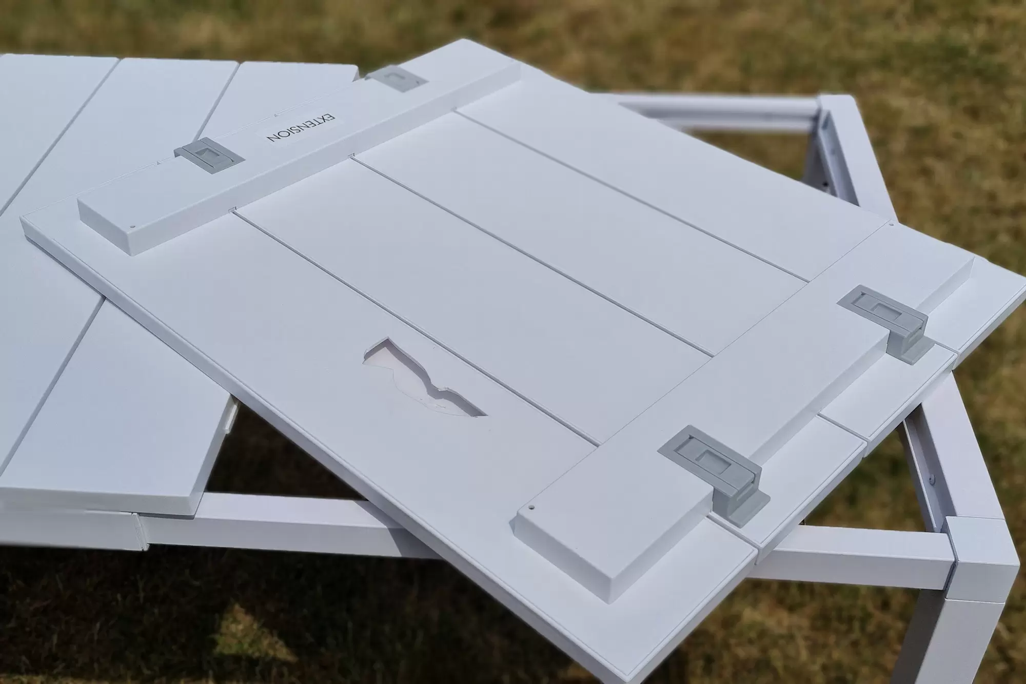 Blat stołu wykonany jest z żywicy polipropylenowej. To materiał wysokiej jakości, który jest odporny na promieniowanie UV oraz niekorzystne warunki atmosferyczne. Jest także nietoksyczny i antystatyczny. Dzięki takiej konstrukcji stół jest lekki i łatwy w przenoszeniu a także bardzo łatwo utrzymać go w czystości. Poszerzenie umieszczone pod blatem stołu. Rozsuwanie teleskopowe.