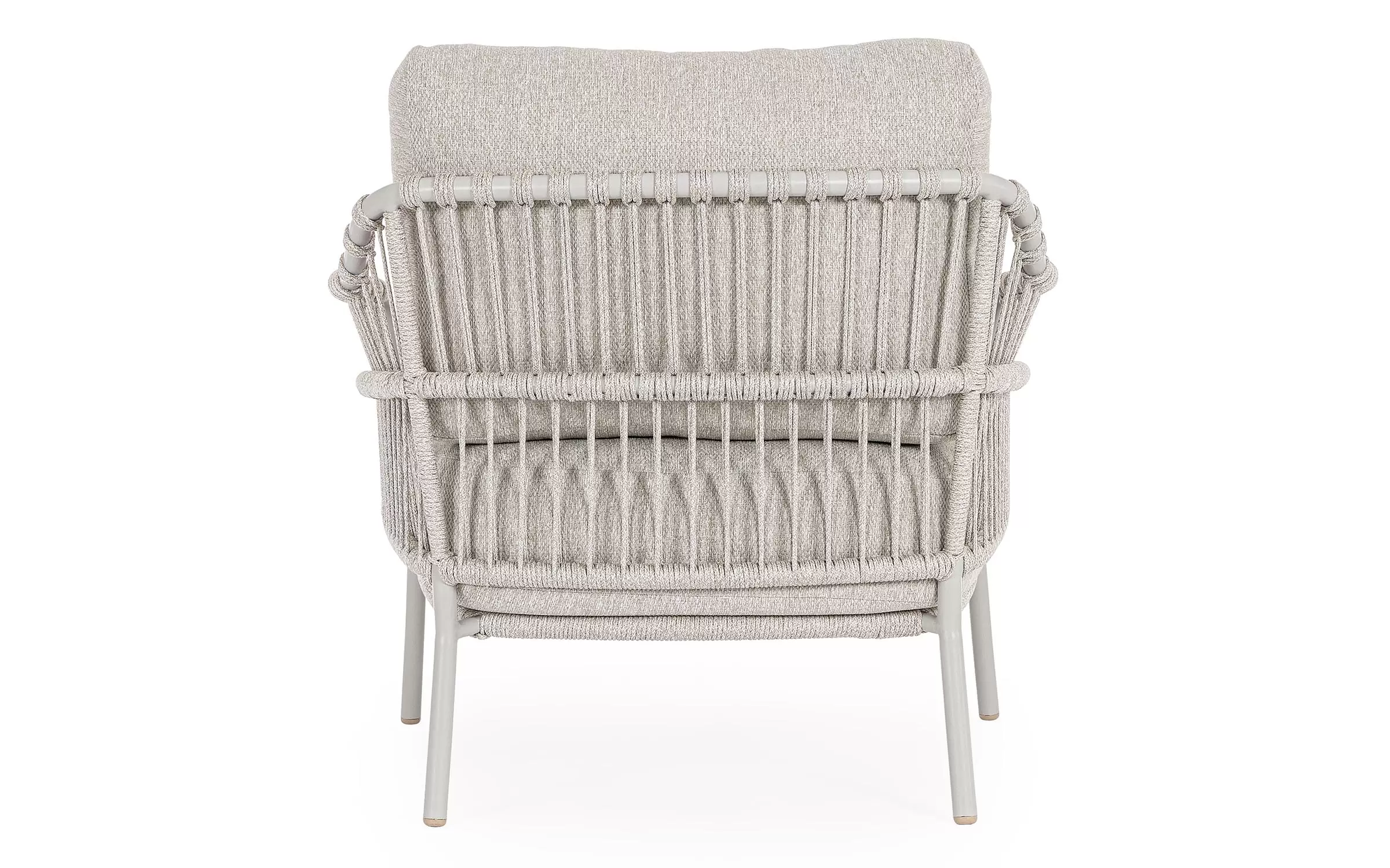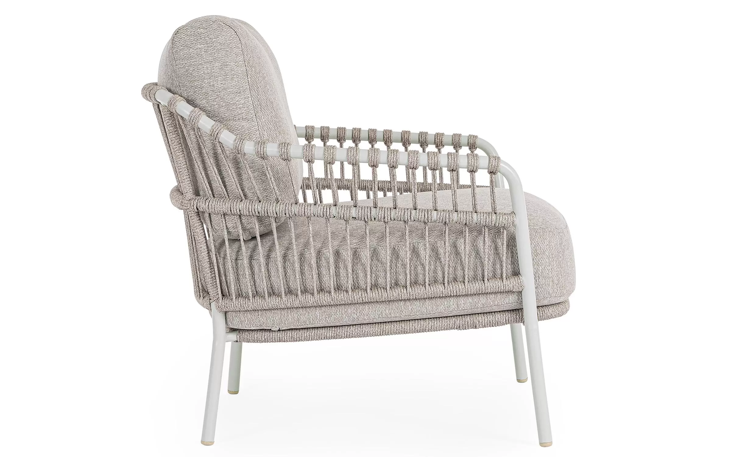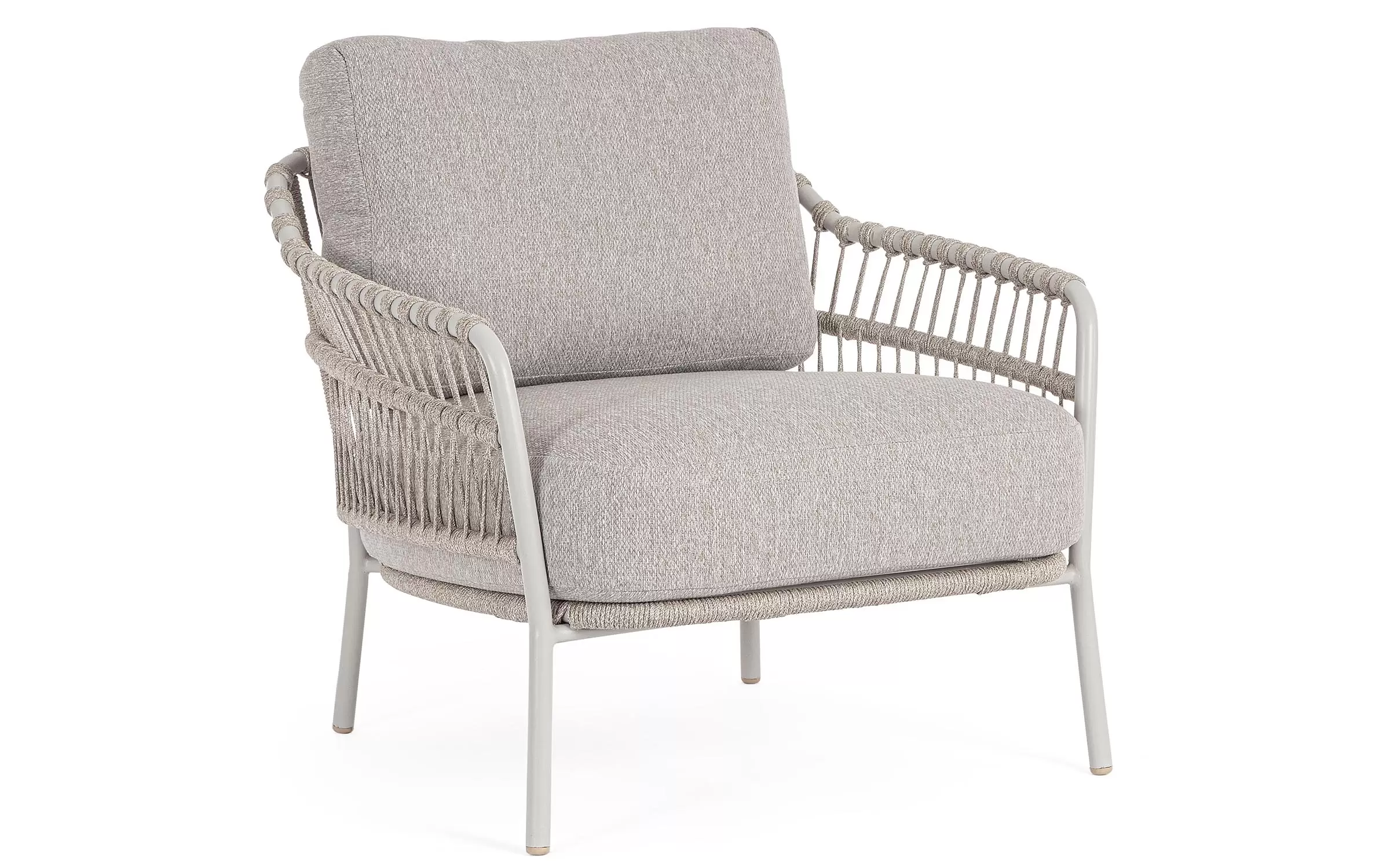 Nowoczesny fotel ogrodowy Talaia na nowoczesny taras. Konstrukcja ze stali nierdzewnej w malowaniu proszkowym opleciona lekkim oplotem z liny polipropylenowej.