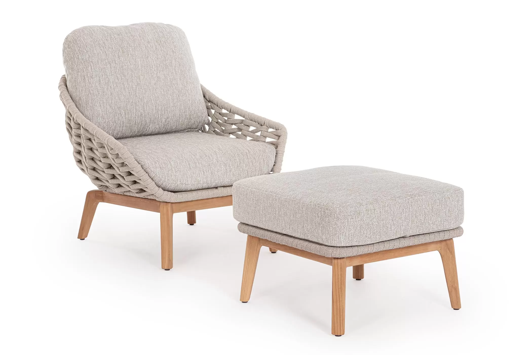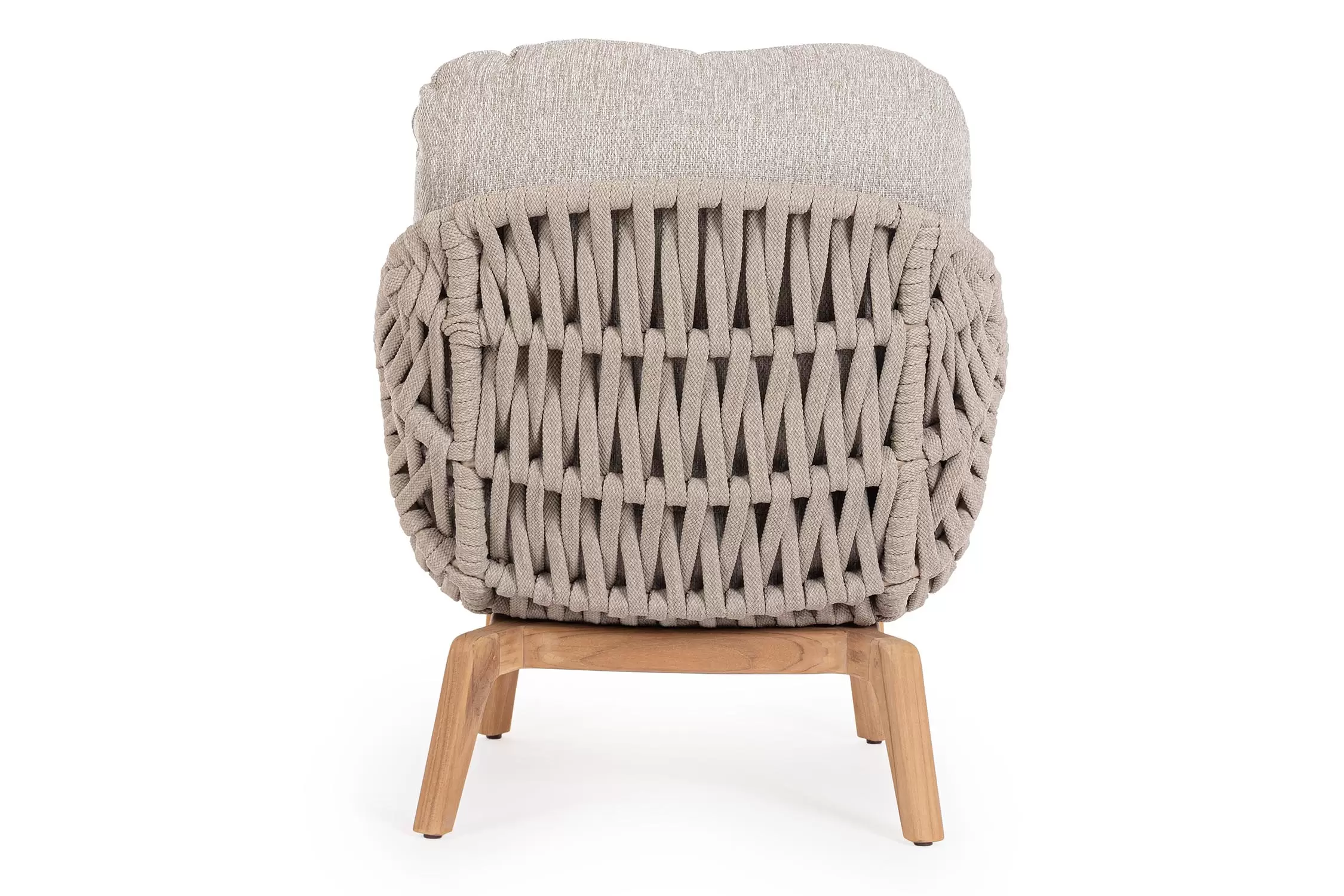 Luksusowy fotel wypoczynkowy na taras. Podstawa z drewna teak. Oparcie o konstrukcji aluminiowej z plecionką z liny polipropylenowej. Poduszki szybkoschnące z poszewkami z materiału Olefin.