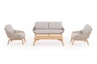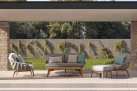 Luksusowa sofa wypoczynkowa na taras. Podstawa z drewna teak. Oparcie o konstrukcji aluminiowej z plecionką z liny polipropylenowej. Poduszki szybkoschnące z poszewkami z materiału Olefin.