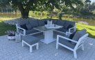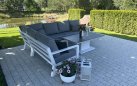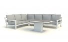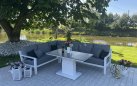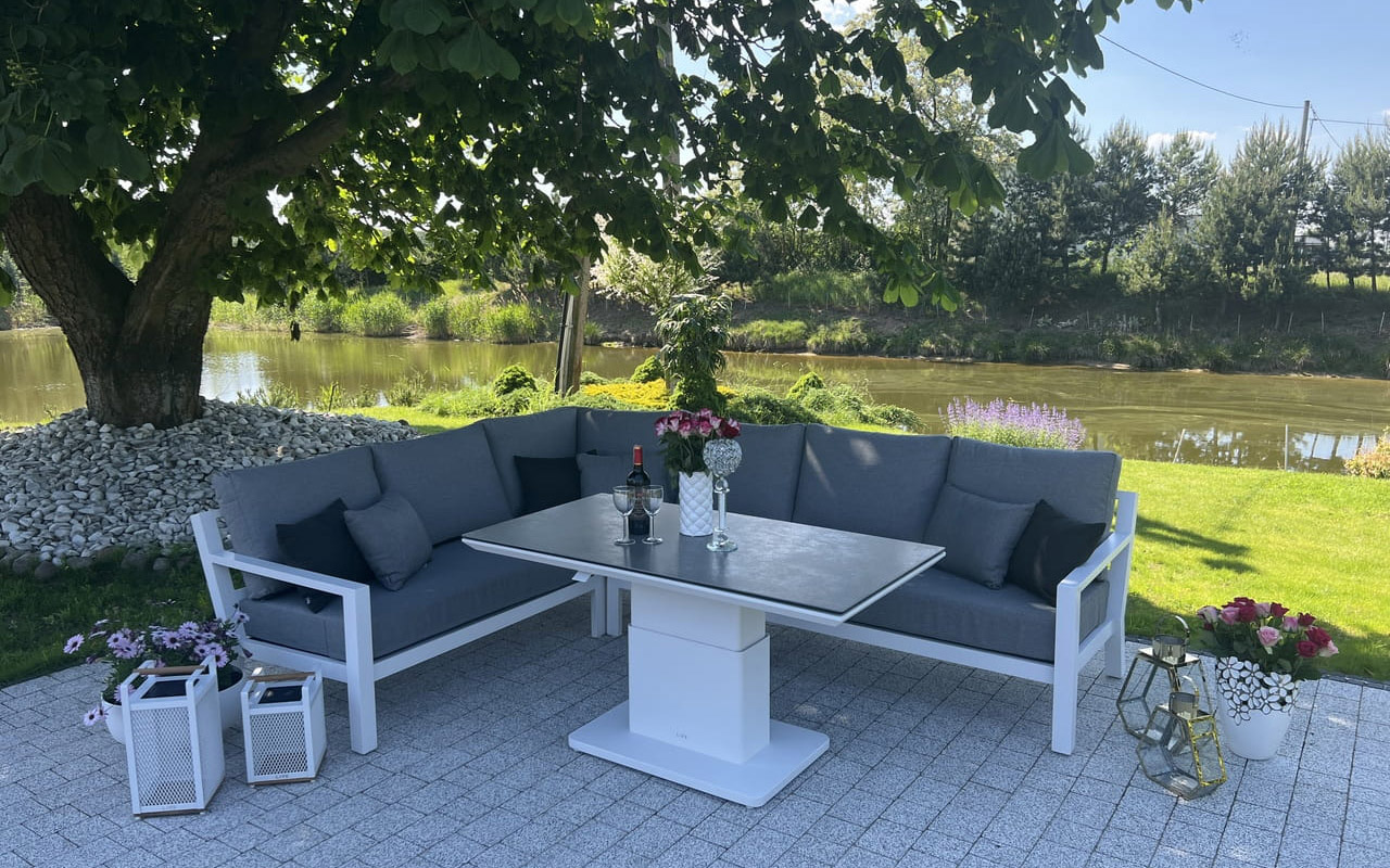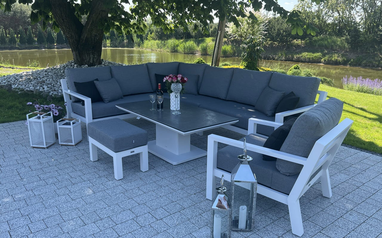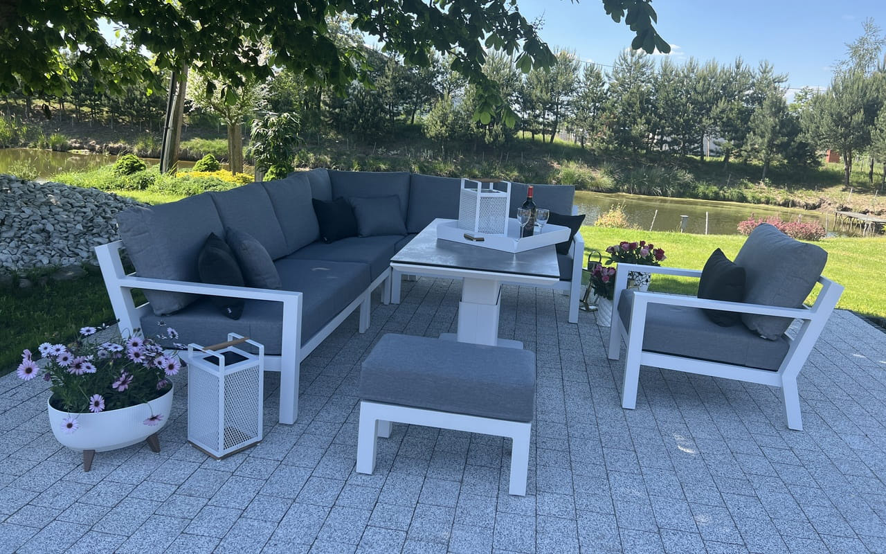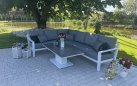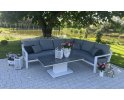 Zestaw wypoczynkowy narożny Timber to propozycja trwałych, nowoczesnych i wygodnych mebli ogrodowych of firmy LIFE. Konstrukcja wykonana jest z grubych profili aluminiowych spawana z wykończonymi starannie miejscami łączeń. Całość pokryta jest proszkowo matowym lakierem łatwym w utrzymaniu w czystości. Elementy mebli można łatwo połączyć zawartymi w komplecie łącznikami. Siedziska pod poduszkami pokryte gęstą tekstyliną.
