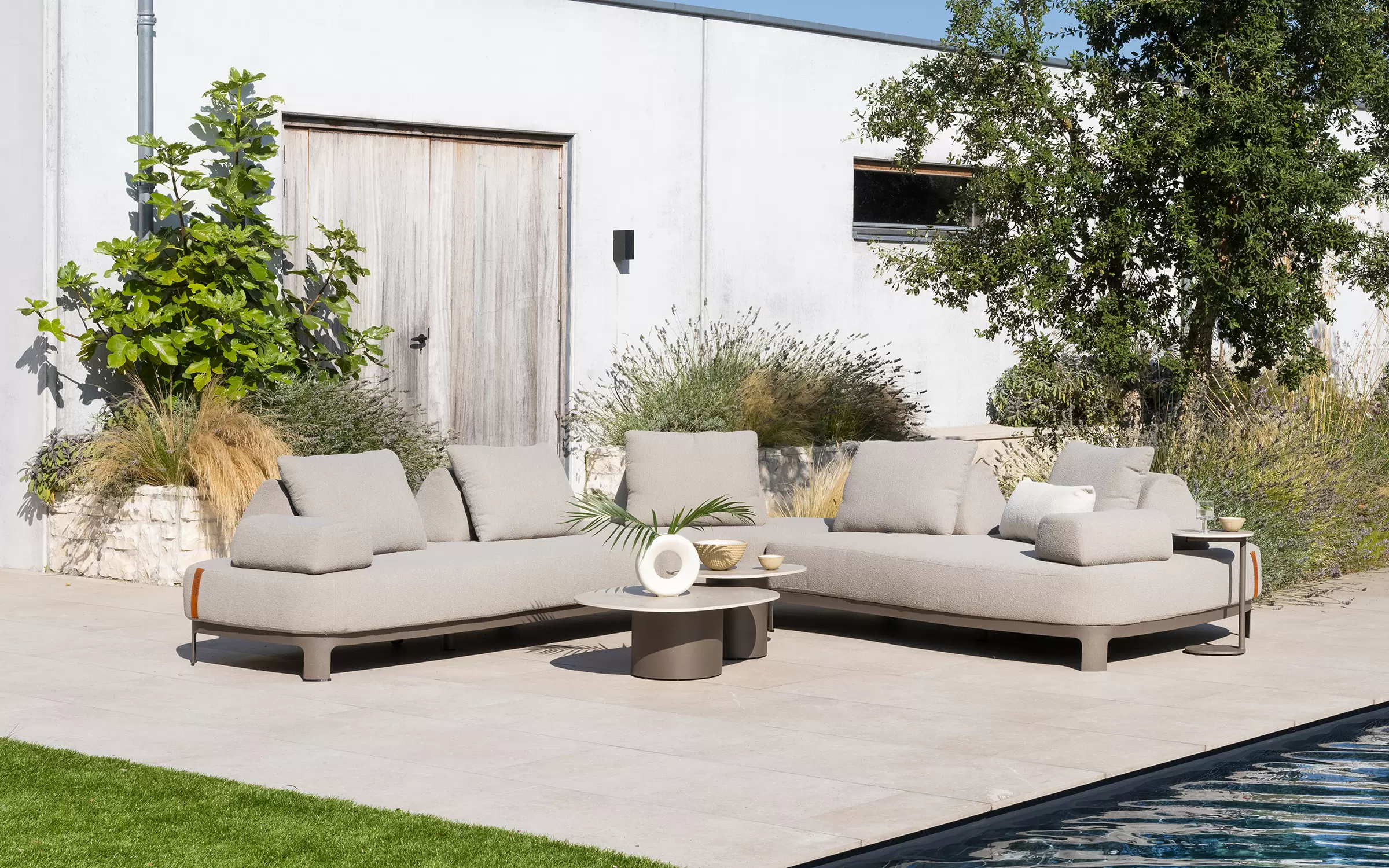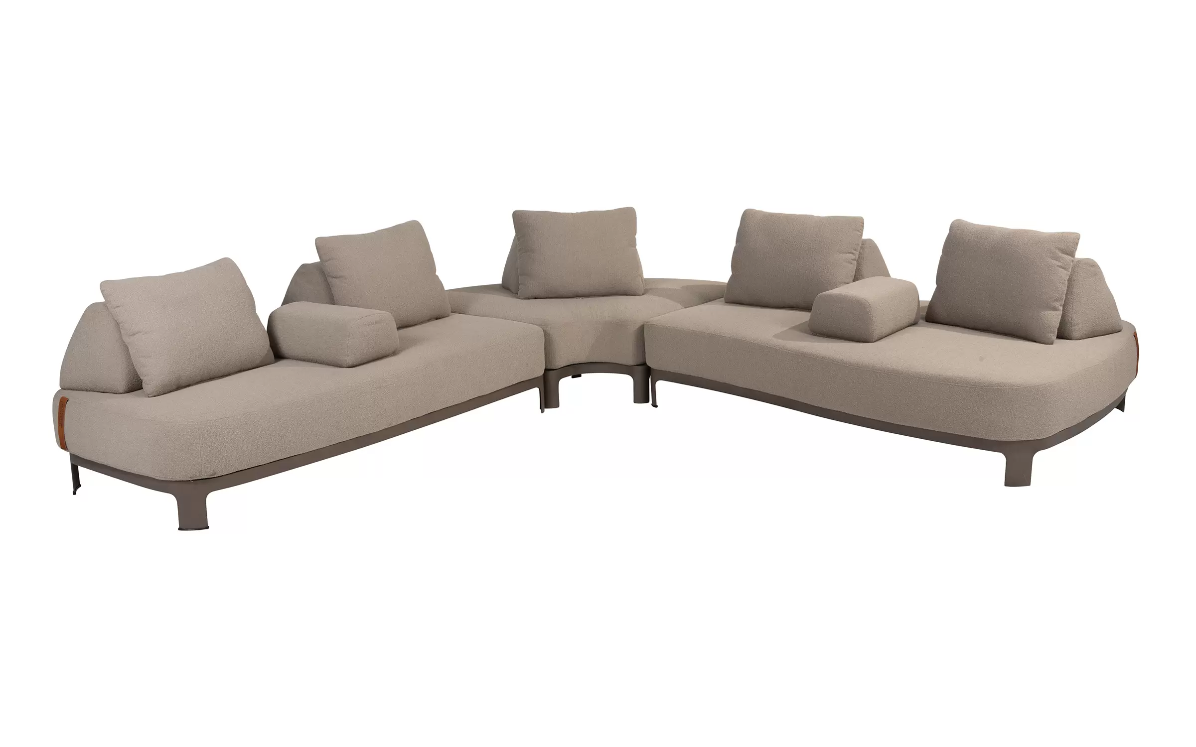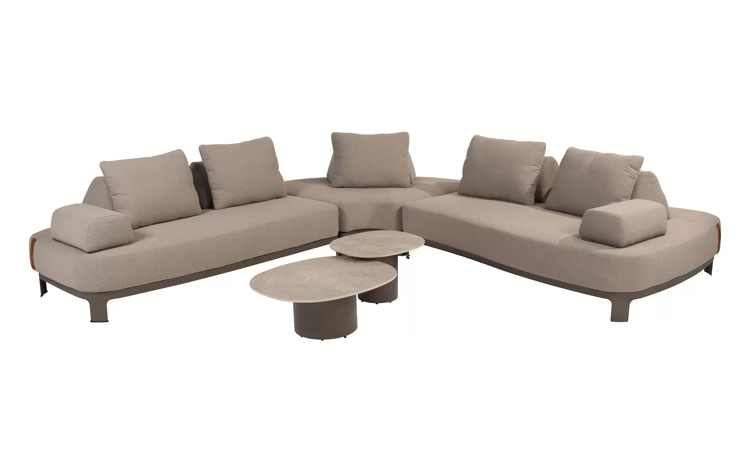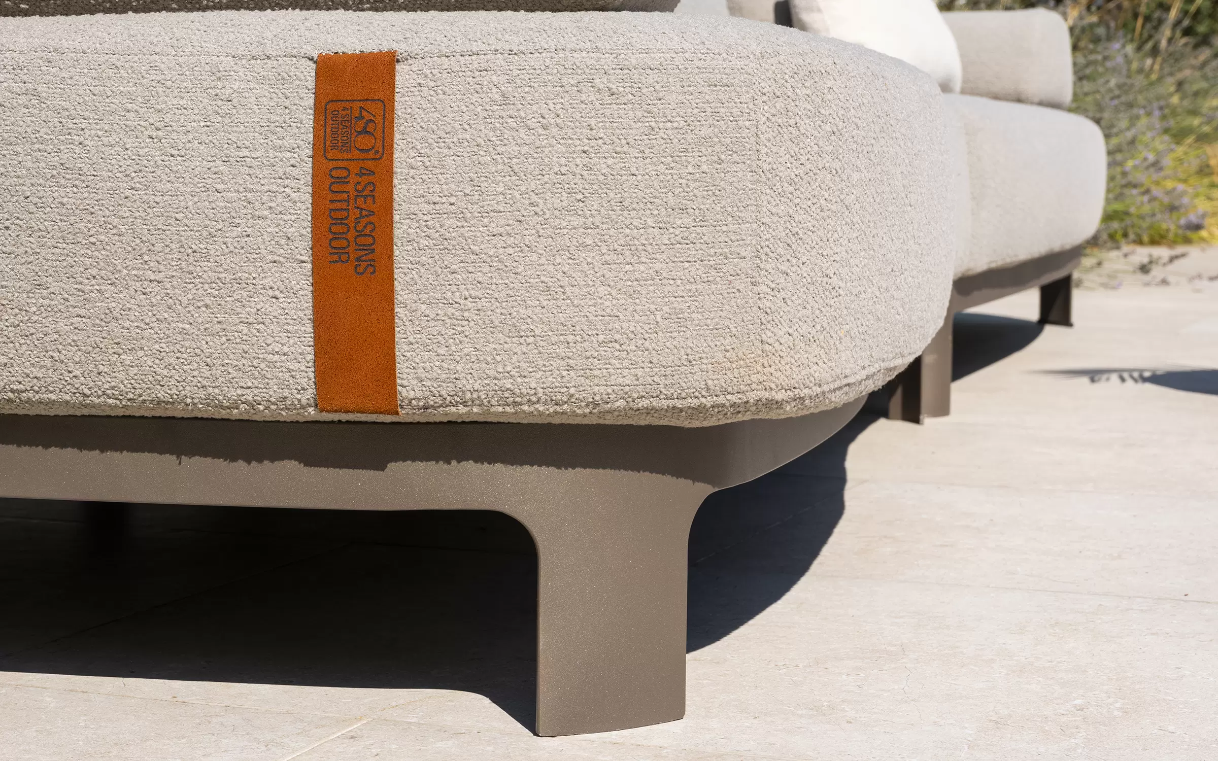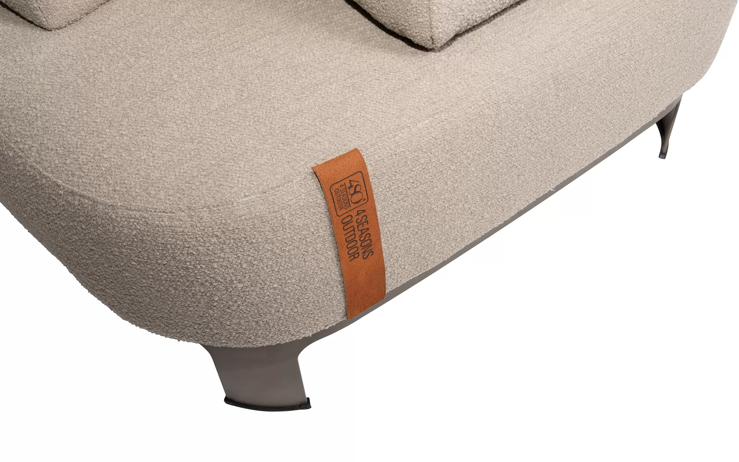 Narożnik Santorini od 4 Seasons Outdoor. To, co od razu rzuca się w oczy w sofie wypoczynkowej Santorini, to duże wymiary i luksusowa tkanina poduszkowa Bouclé w delikatnym, stylowym kolorze szarobeżowym.