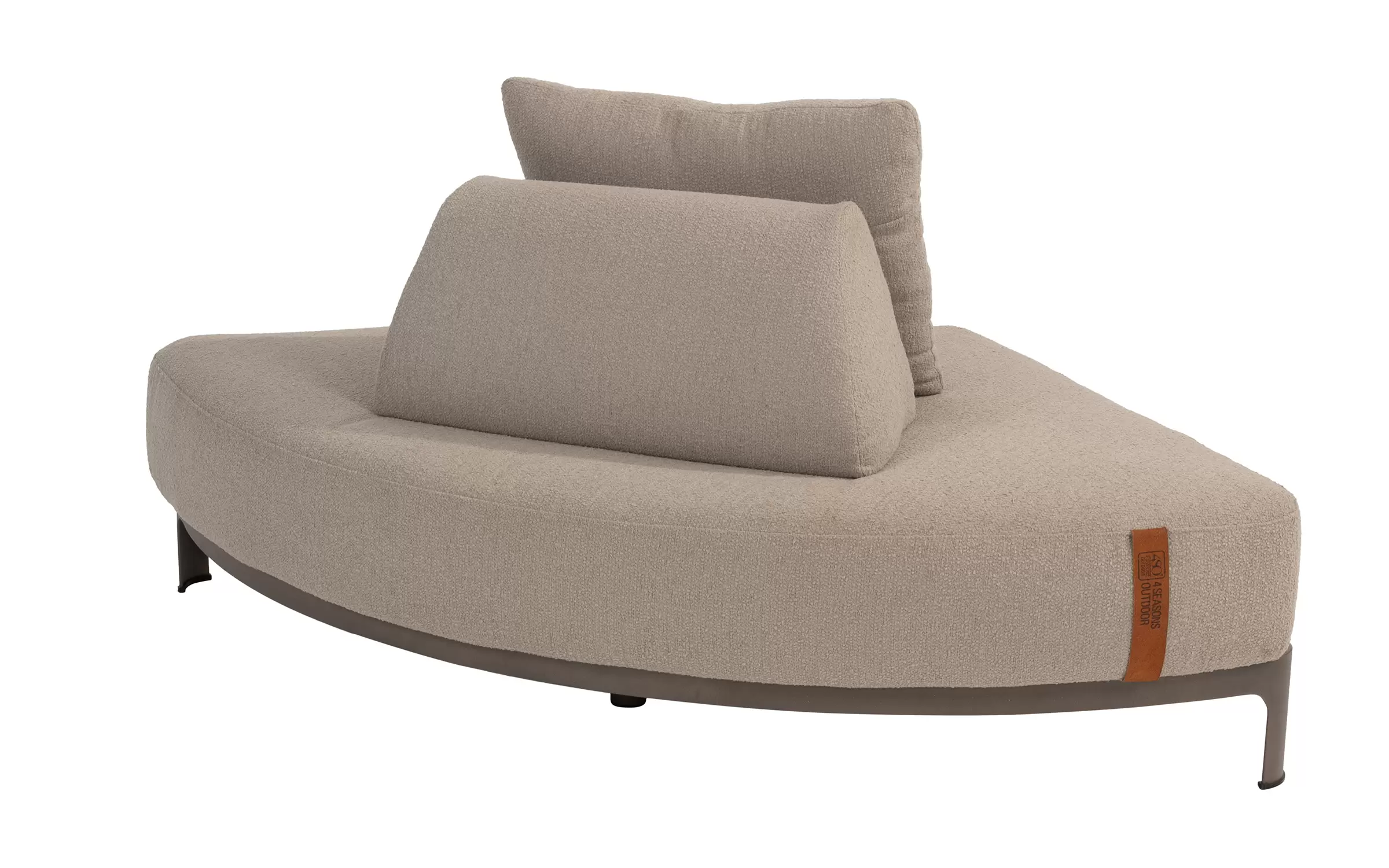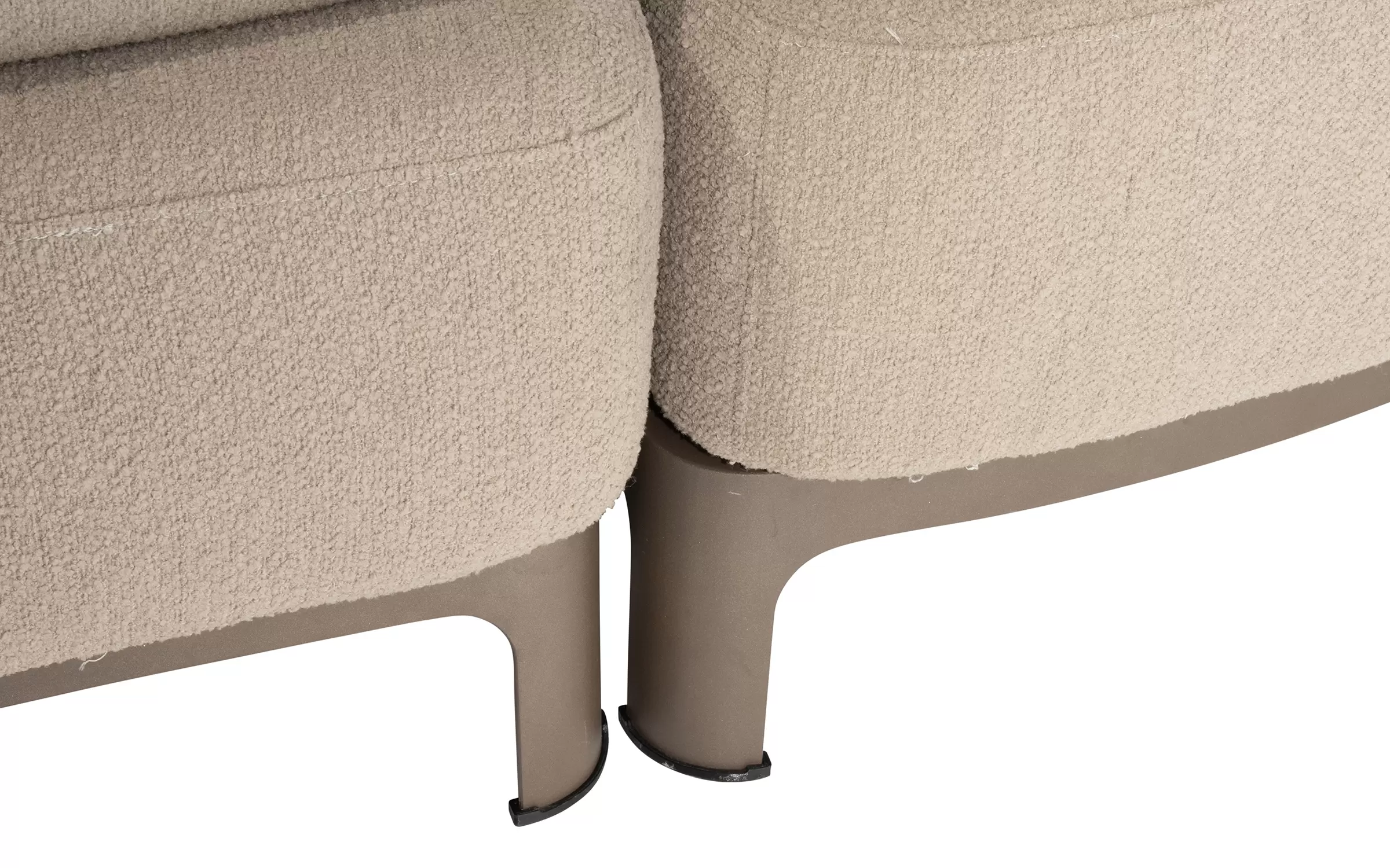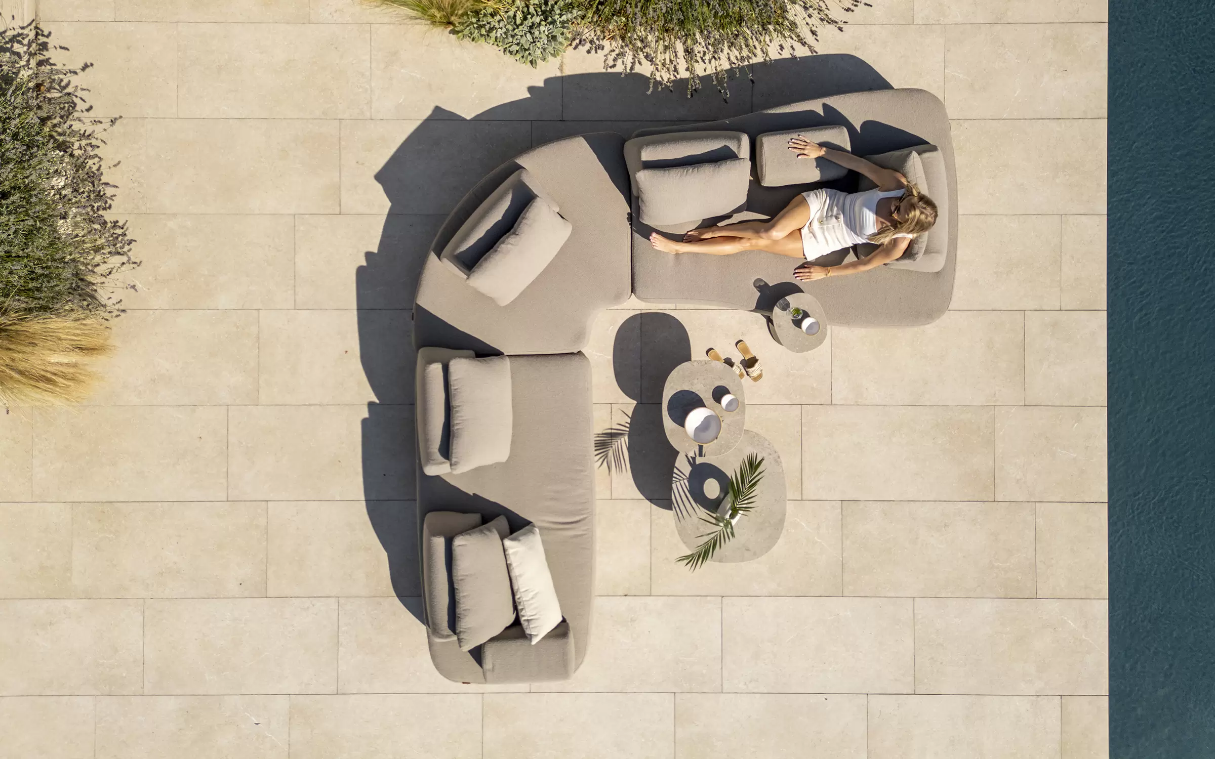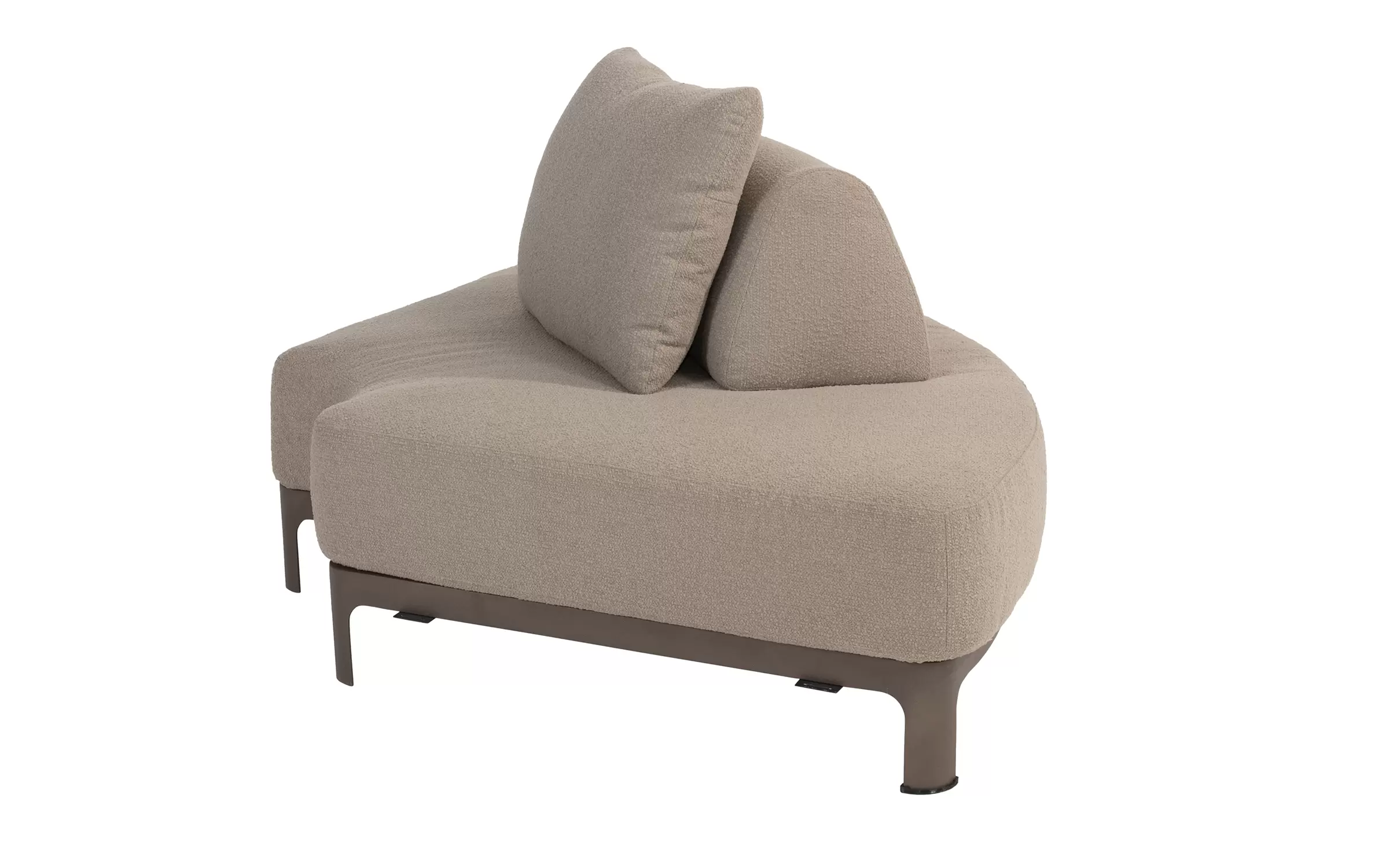 Narożnik Santorini od 4 Seasons Outdoor. To, co od razu rzuca się w oczy w sofie wypoczynkowej Santorini, to duże wymiary i luksusowa tkanina poduszkowa Bouclé w delikatnym, stylowym kolorze szarobeżowym.
