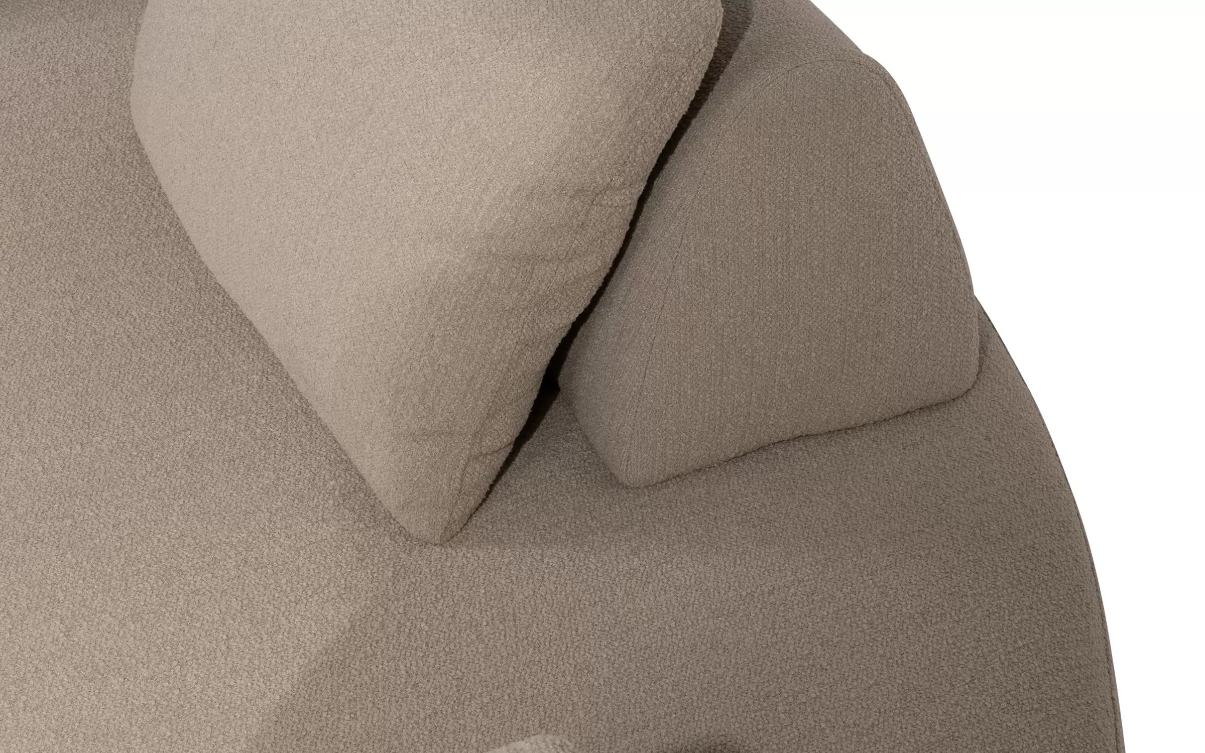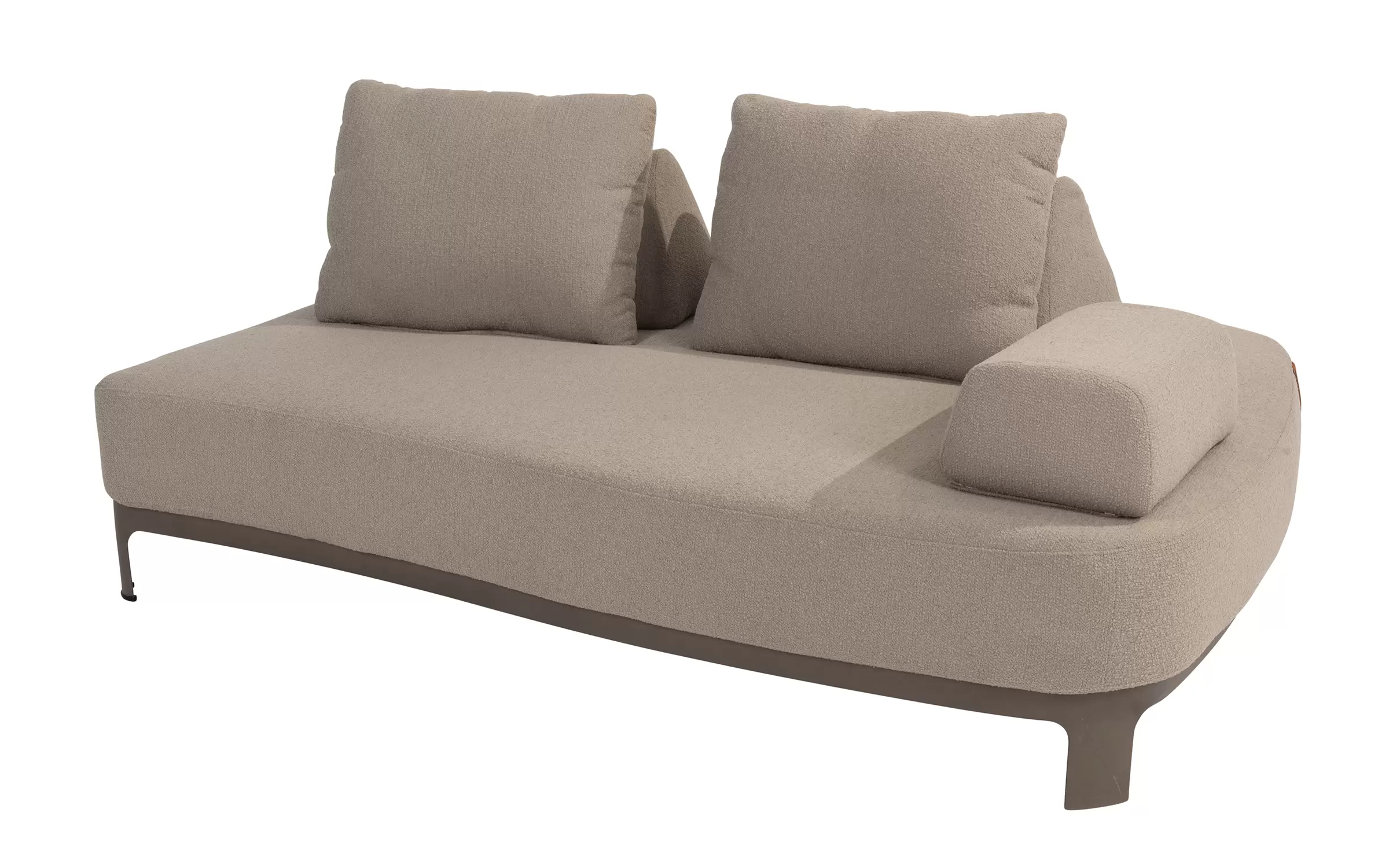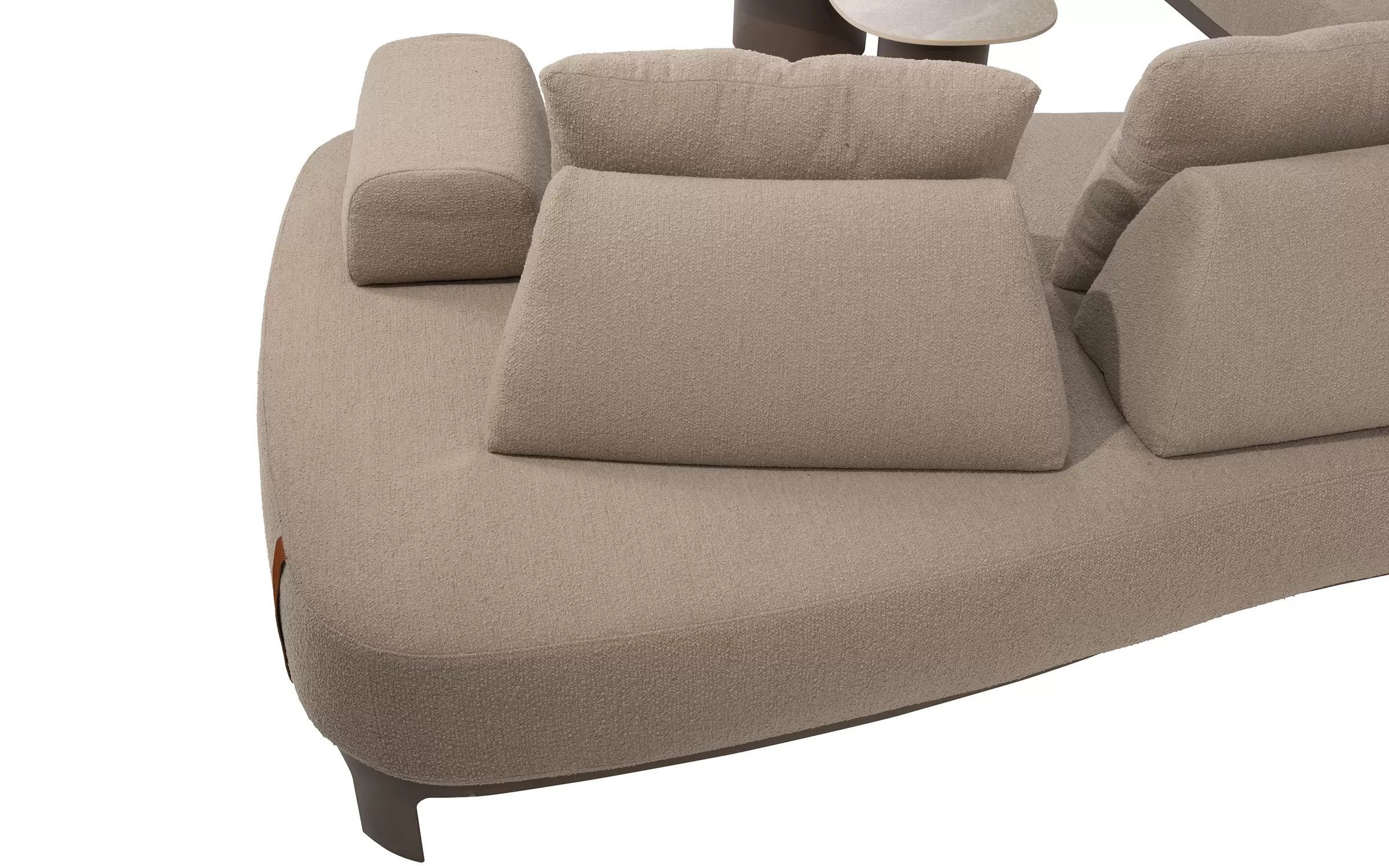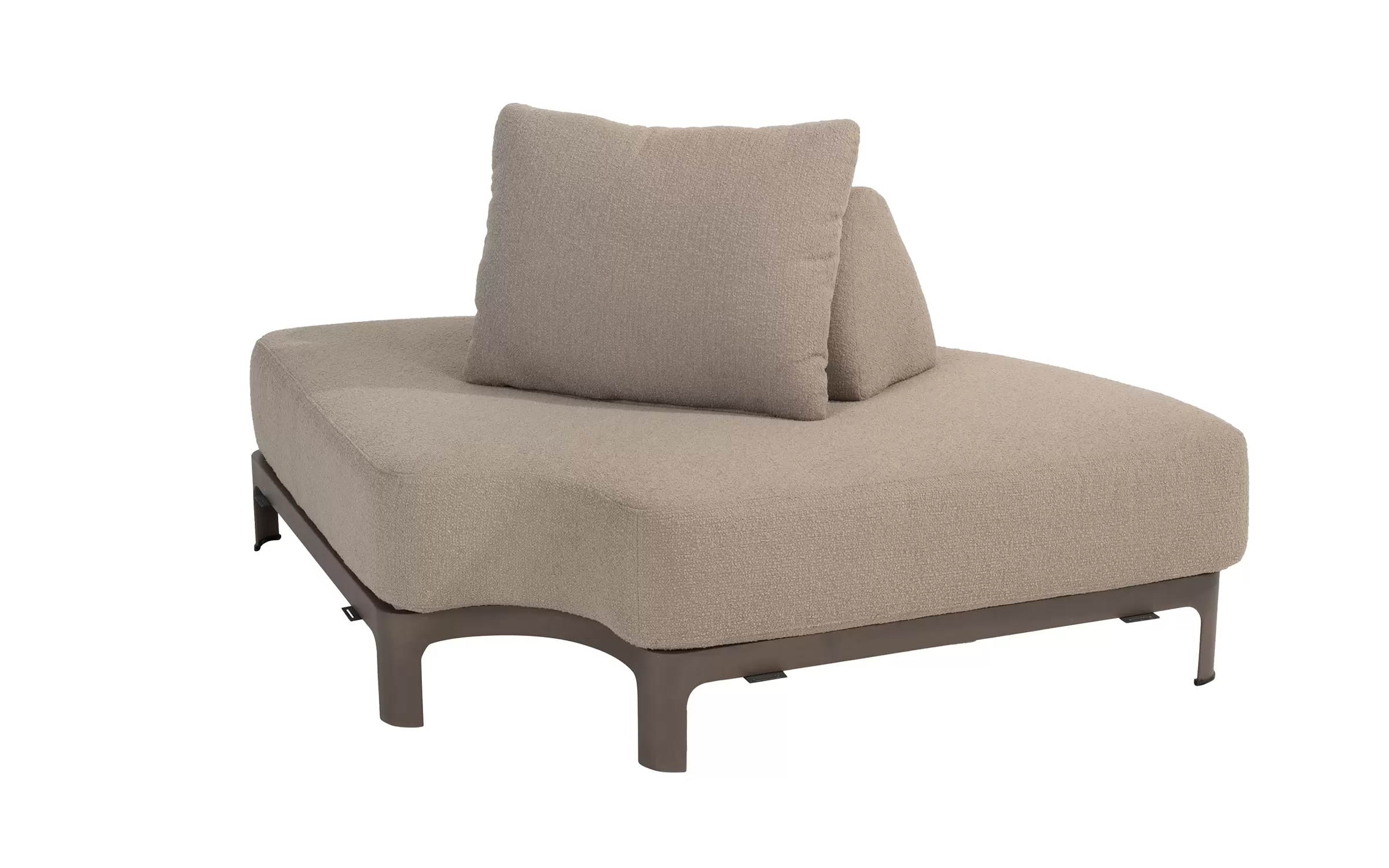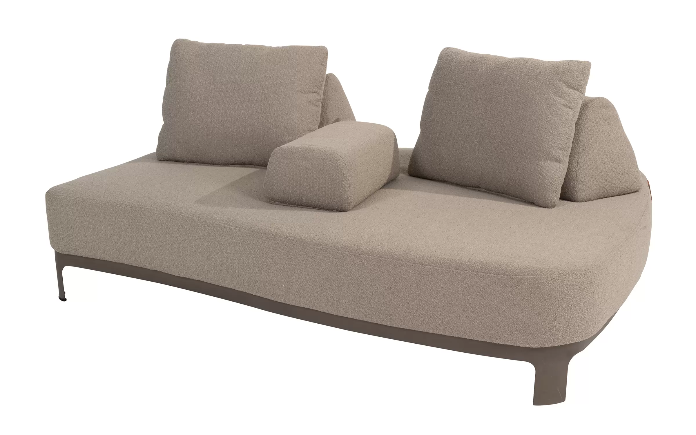 Narożnik Santorini od 4 Seasons Outdoor. To, co od razu rzuca się w oczy w sofie wypoczynkowej Santorini, to duże wymiary i luksusowa tkanina poduszkowa Bouclé w delikatnym, stylowym kolorze szarobeżowym.