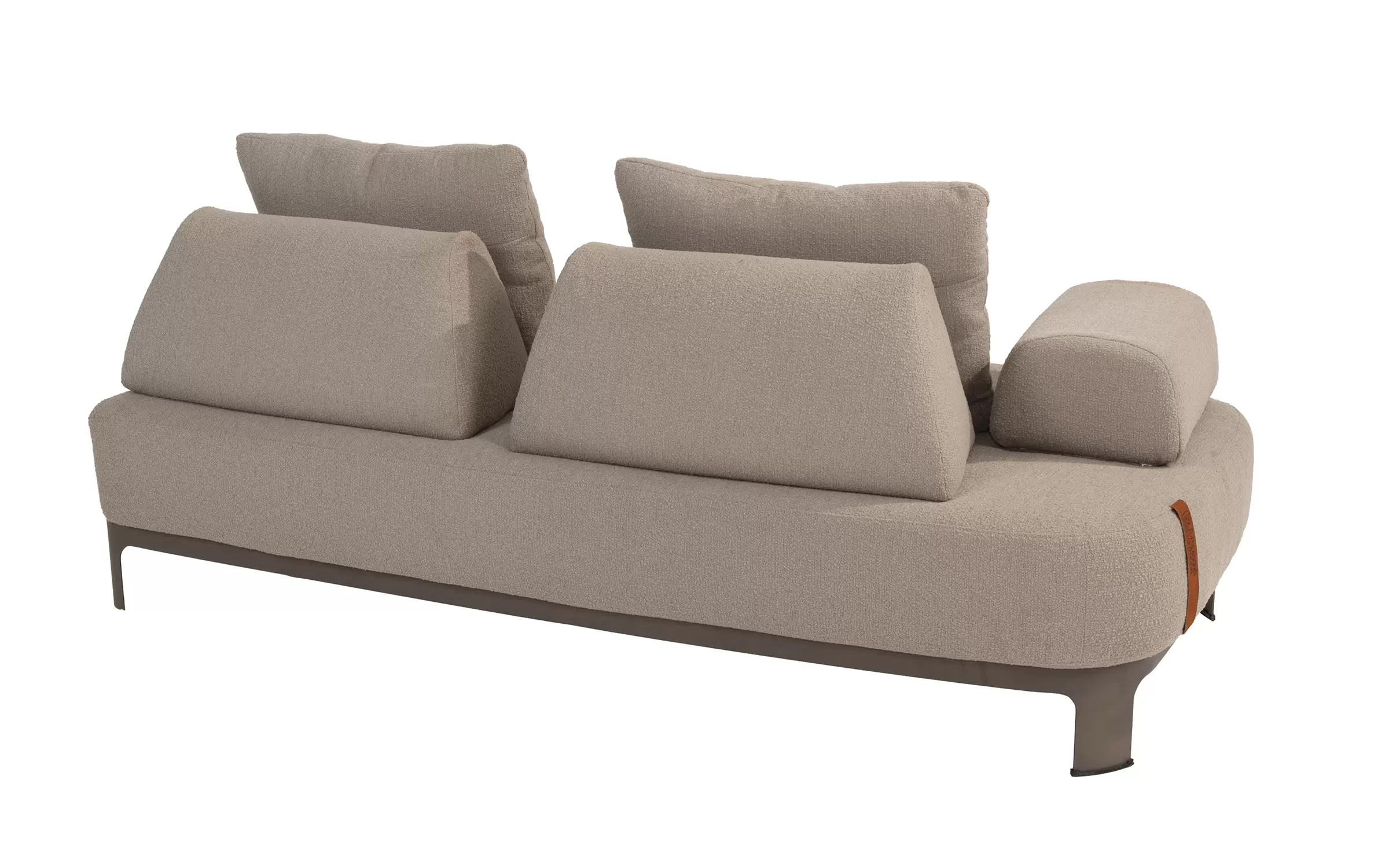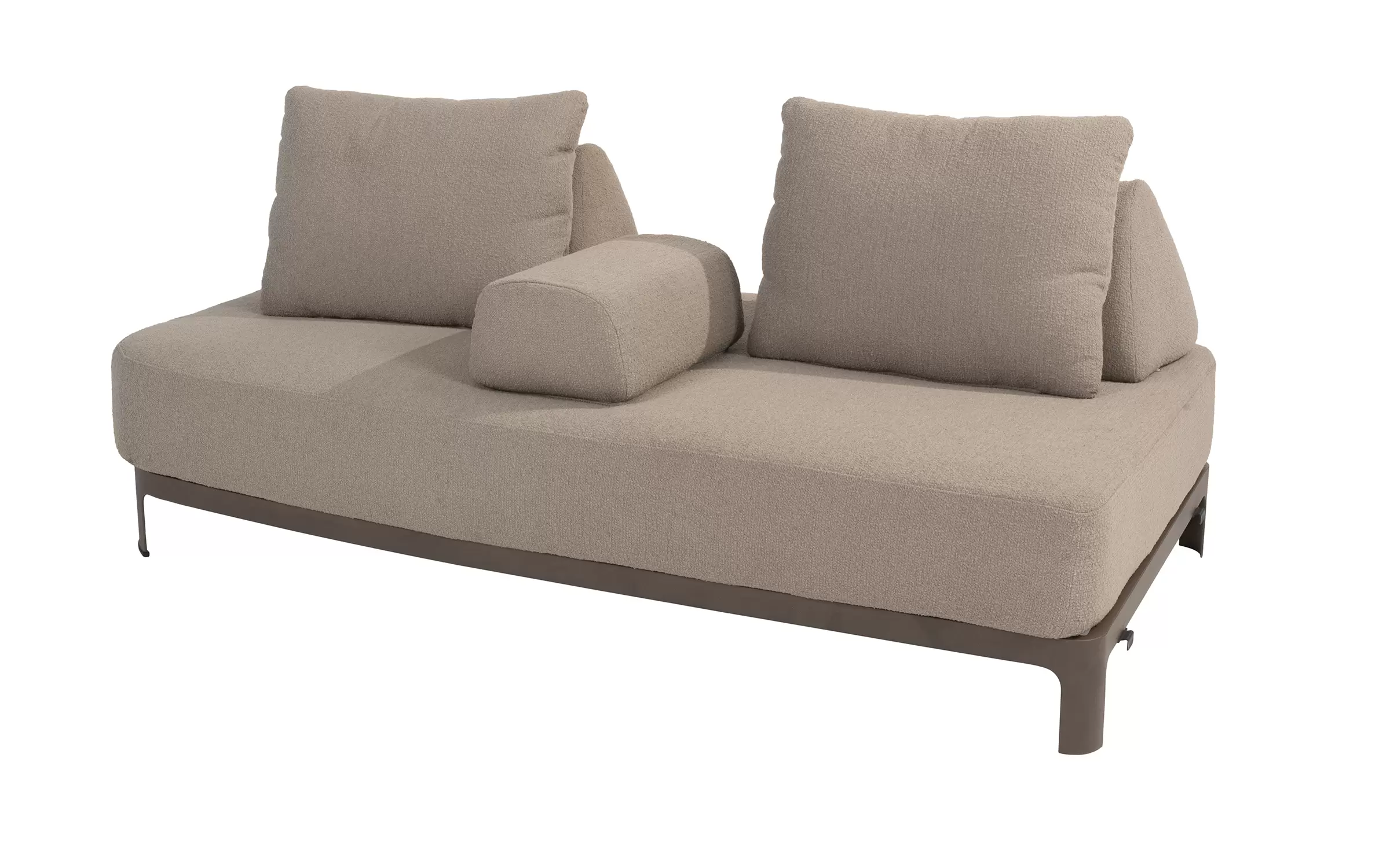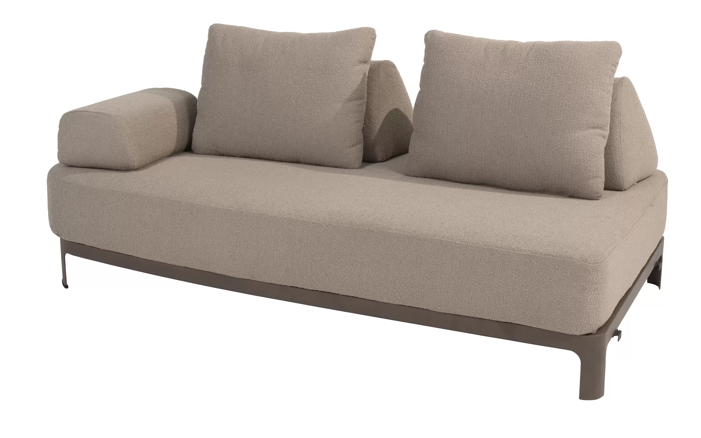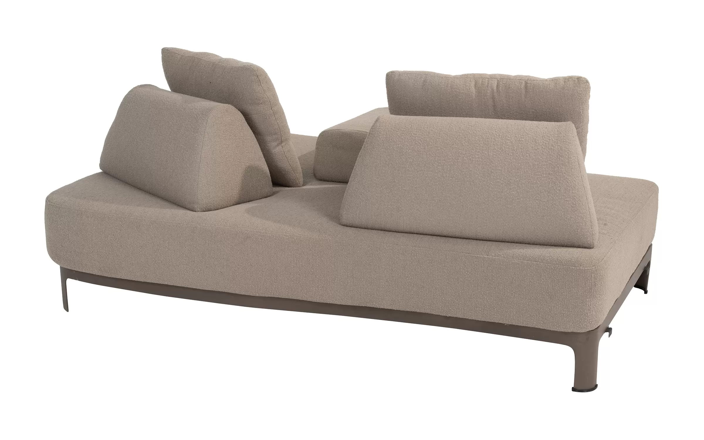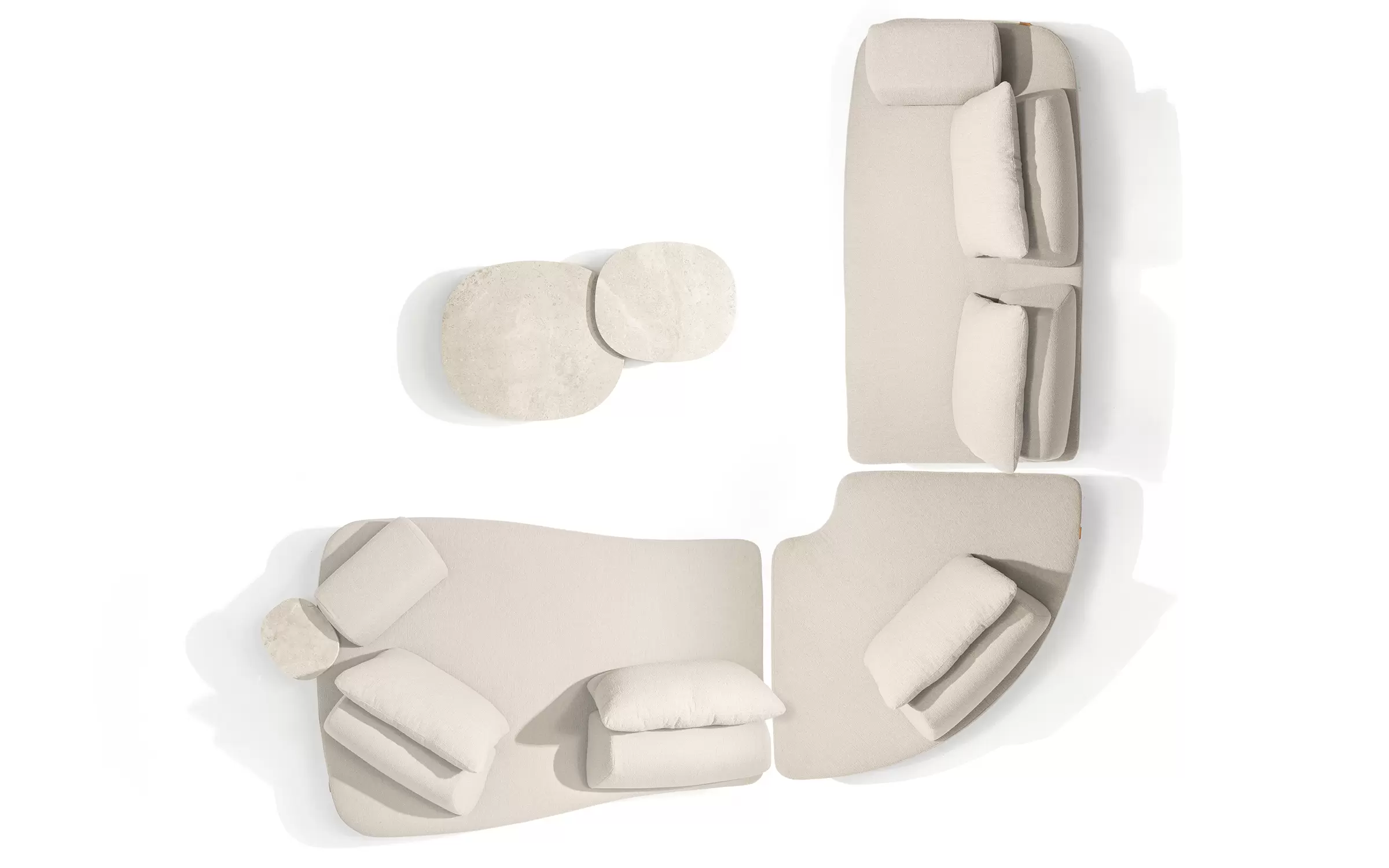 Narożnik Santorini od 4 Seasons Outdoor. To, co od razu rzuca się w oczy w sofie wypoczynkowej Santorini, to duże wymiary i luksusowa tkanina poduszkowa Bouclé w delikatnym, stylowym kolorze szarobeżowym.