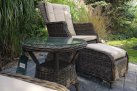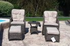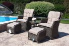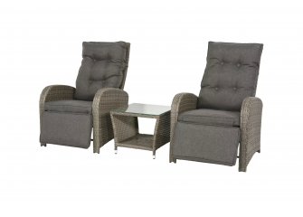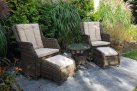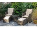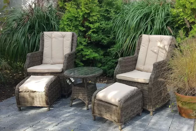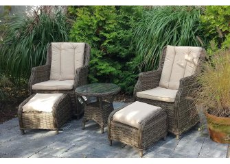 Klasyczne fotele ogrodowe z wysokimi oparciami, z wygodnymi poduszkami wykonane z technorattanu. Idealny zestaw na poranną kawę na balkonie lub tarasie.