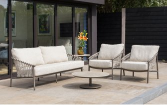 Konstrukcja aluminiowa i tkanina bouclé płynnie wtapiają się w Twój ogród, tworząc zachęcającą i nastrojową jadalnię.