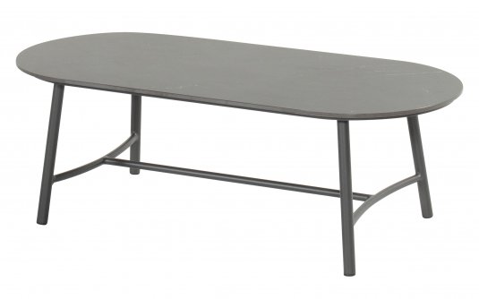 Niski owalny stół ogrodowy Flora Hartman o wymiarach 130×60×42 cm. Ceramiczny blat i aluminiowa rama w kolorze antracytowym lub jasnobeżowym. Stylowy i trwały mebel do strefy wypoczynkowej na tarasie
