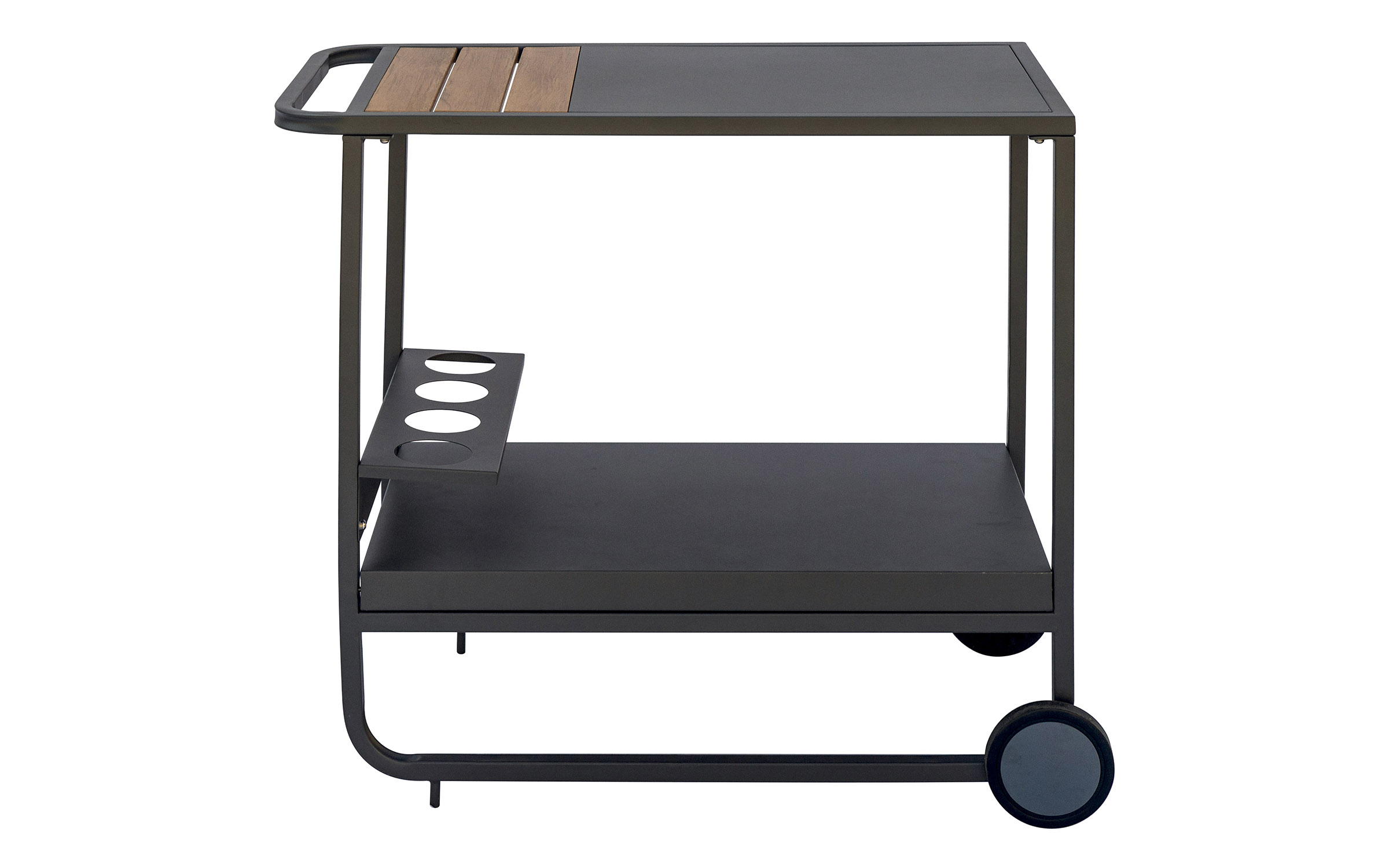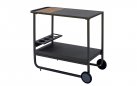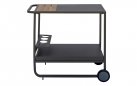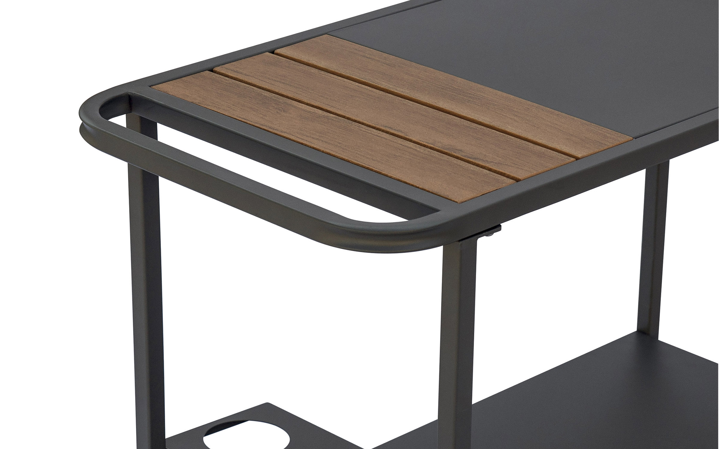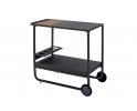 Elegancki wózek serwisowy do użytku zewnętrznego i wewnętrznego, wykonany z metalu malowanego proszkowo w kolorze antracytowym. Górna półka wyposażona w deseczki z kompozytu drewnianego, które nadają naturalny wygląd i są odporne na warunki atmosferyczne. Dolna półka posiada uchwyty na butelki, a całość osadzona jest na dużych kołach transportowych dla łatwego przemieszczania.