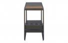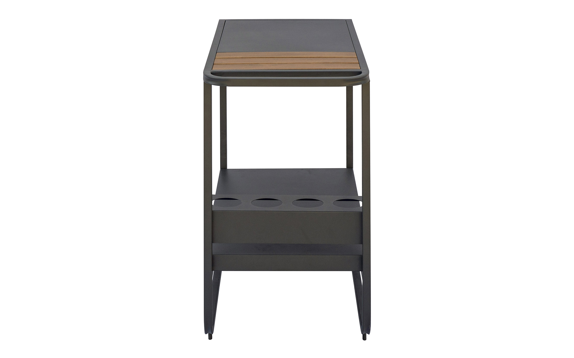 Rama z malowanego proszkowo metalu w kolorze antracytowym. Górny blat z deseczek z kompozytu drewnianego. Dolna półka z uchwytami na butelki z tworzywa sztucznego.