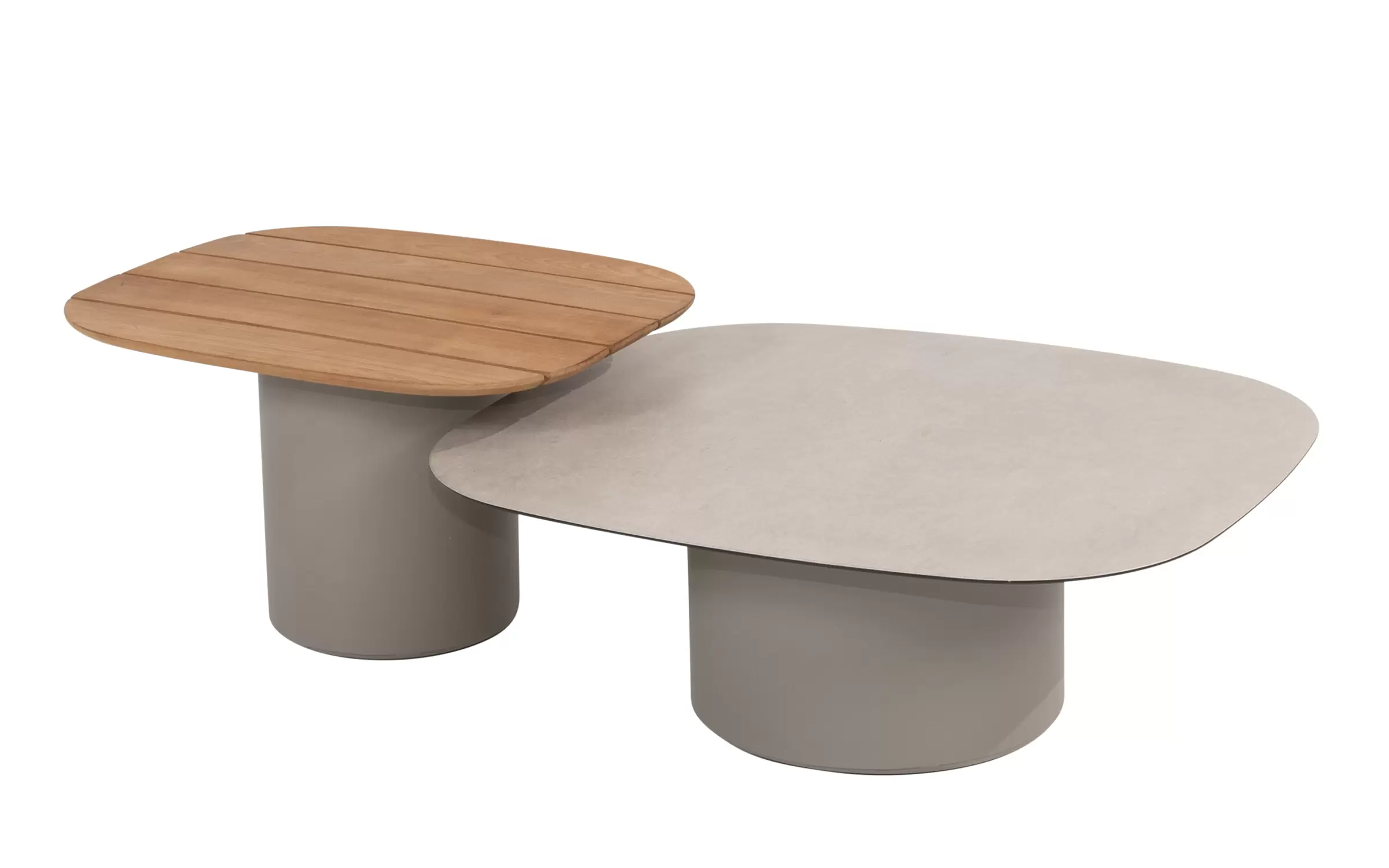 Zestaw stolików kawowych Demi od Taste by 4 Seasons. Soliki kaowowe n a taras mają malowaną proszkowo szarą podstawę oraz blaty z ceramiki i drewna tekowego z zaokrąglonymi rogami.