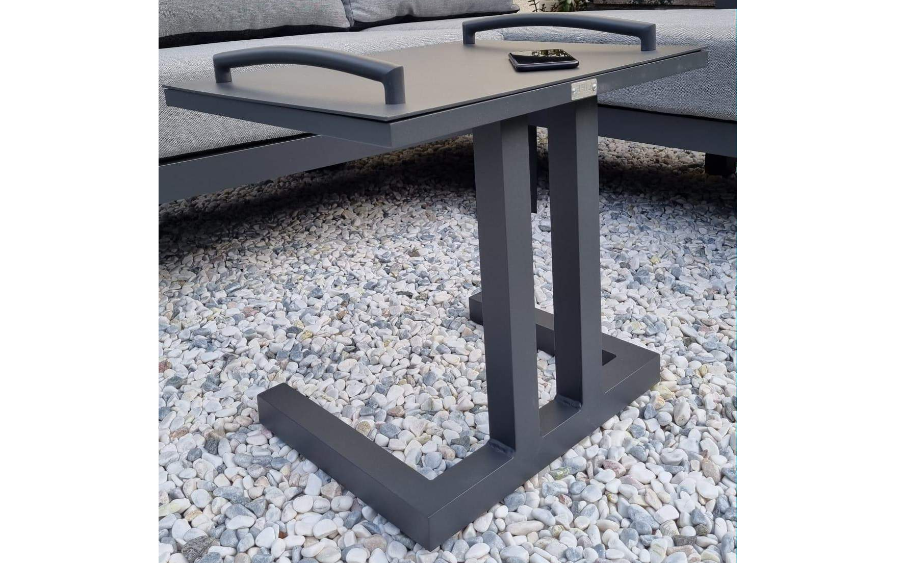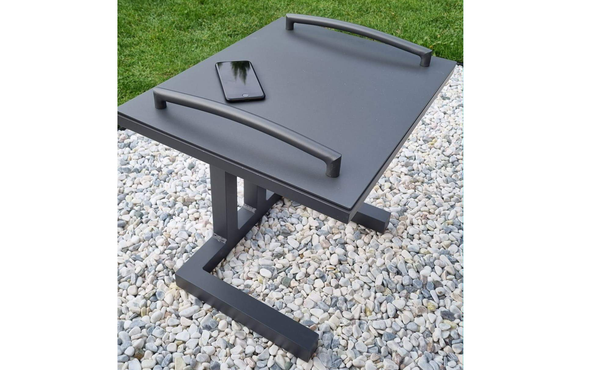 Stolik o podstawie aluminiowej malowanej proszkowo ze zdejmowaną tacą z uchwytami.