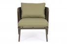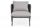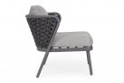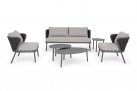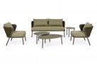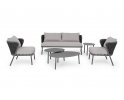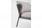Komplet mebli wypoczynkowych na taras w oryginalnym i co najważniejsze odpornym na warunki atmosferyczne wykonaniu. Delikatnie wygięte "skrzydełka', wygodne oparcie oraz siedzisko z wygodnymi poduszkami zostało wykonane z wodoodpornej tkaniny Olefin. Ciekawą formą urozmaicenia konstrukcji mebli jest zastosowanie warkoczowego splotu po bokach i z tyłu stelaża. Stelaż sofy oraz fotela wykonano z aluminium w malowaniu proszkowym. Wypełnienie poduszek z wysokiej jakości szybkoschnącej pianki tapicerskiej Quick Dry Foam o właściwościach antybakteryjnych. Wytrzymałość materiałów, a także odporność na korozję, umożliwiają zastosowanie zarówno w domu jak i na zewnątrz - w ogrodzie lub na tarasie. Meble należy czyścić nie wykorzystując silnych środków chemicznych.