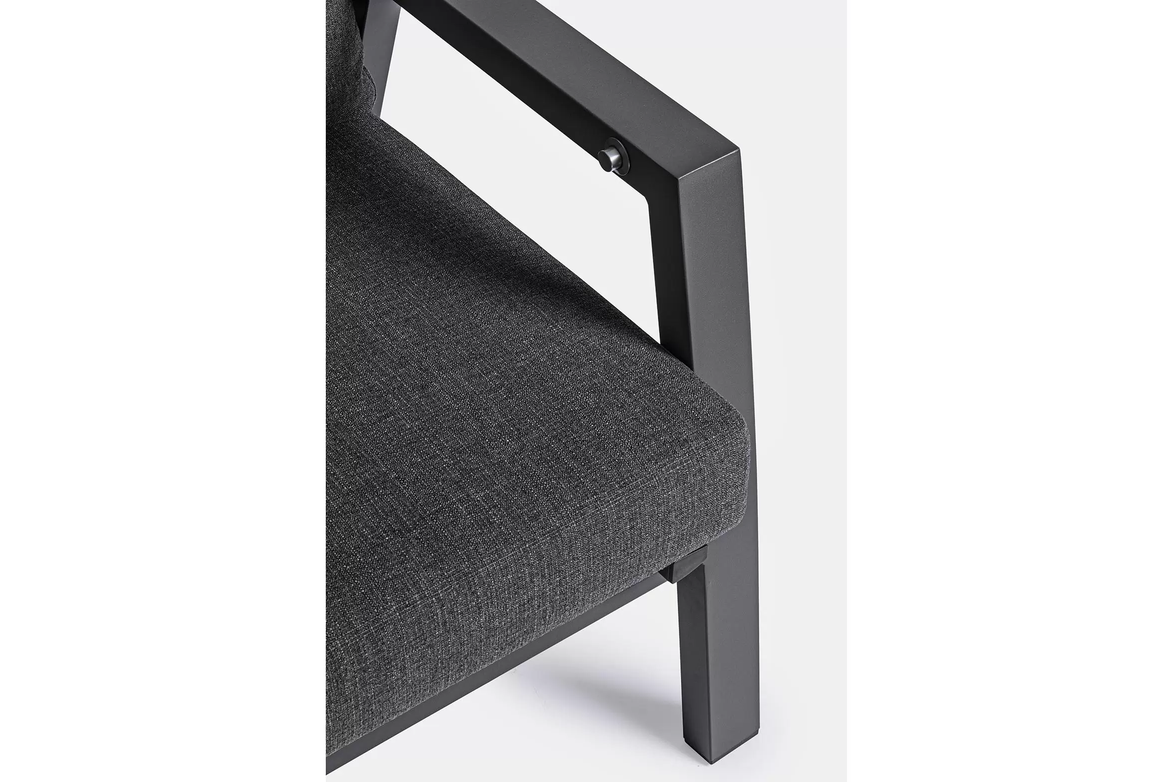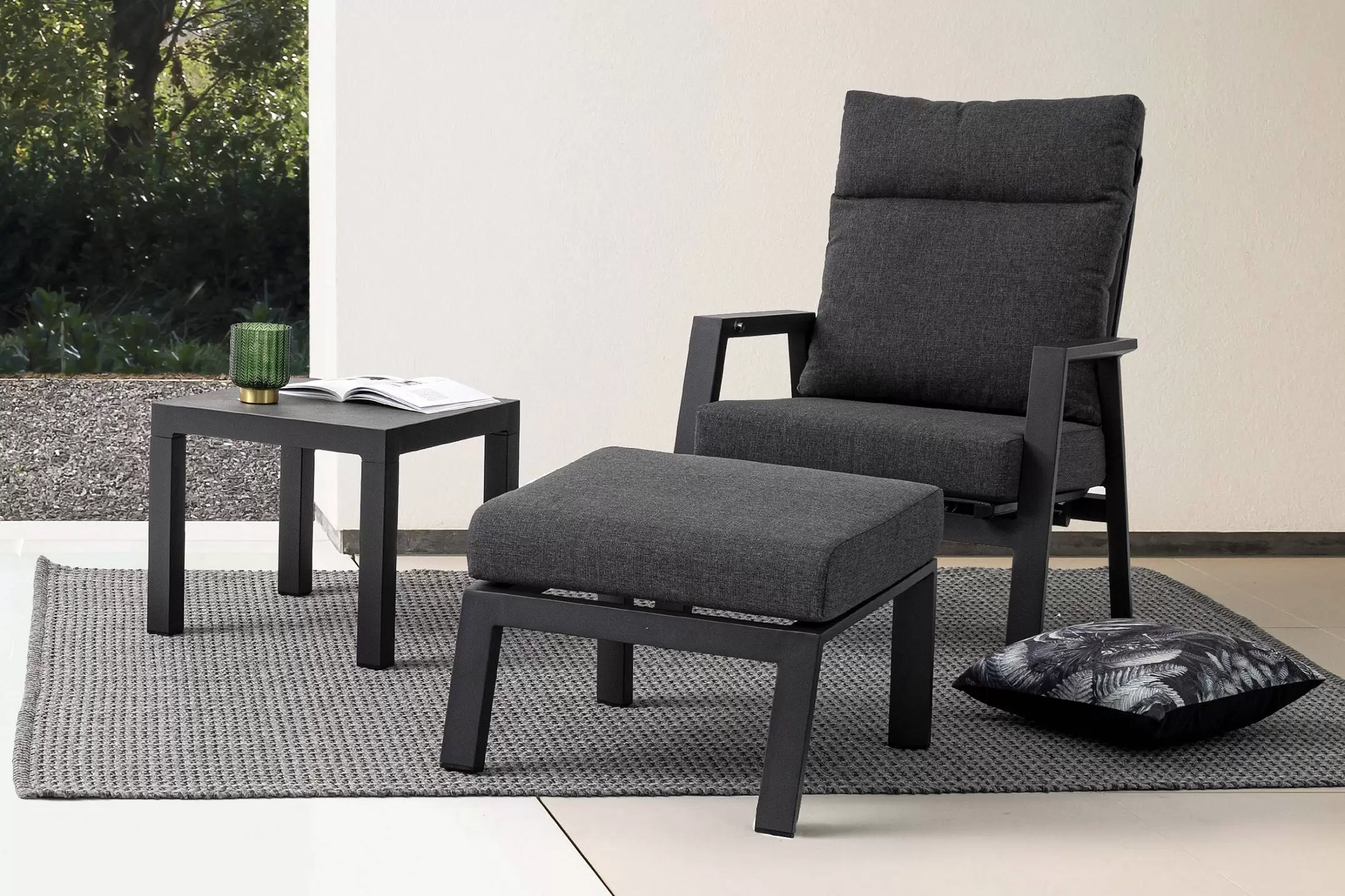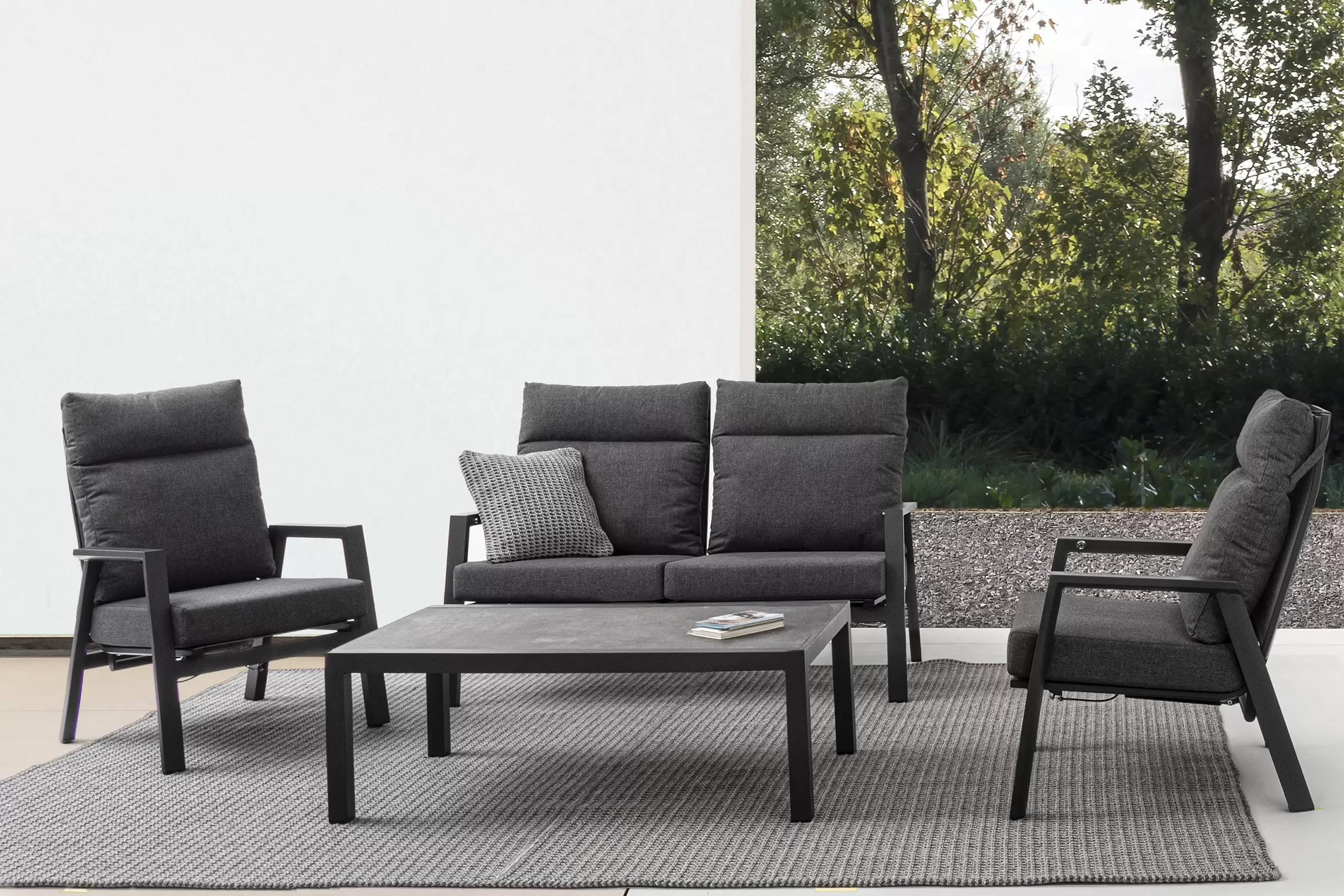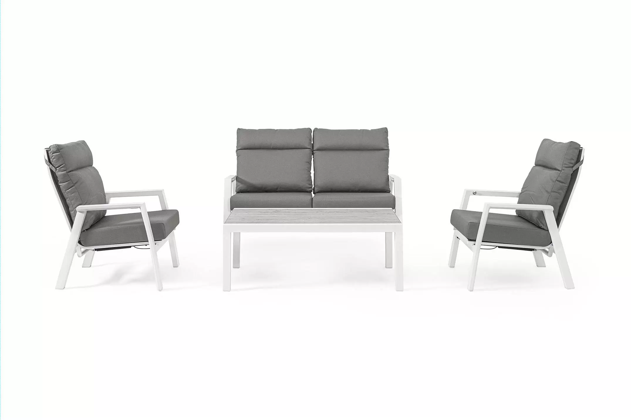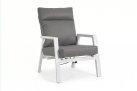 Aluminiowe meble ogrodowe z wysokimi oparciami z płynnie pochylanymi oparciami.