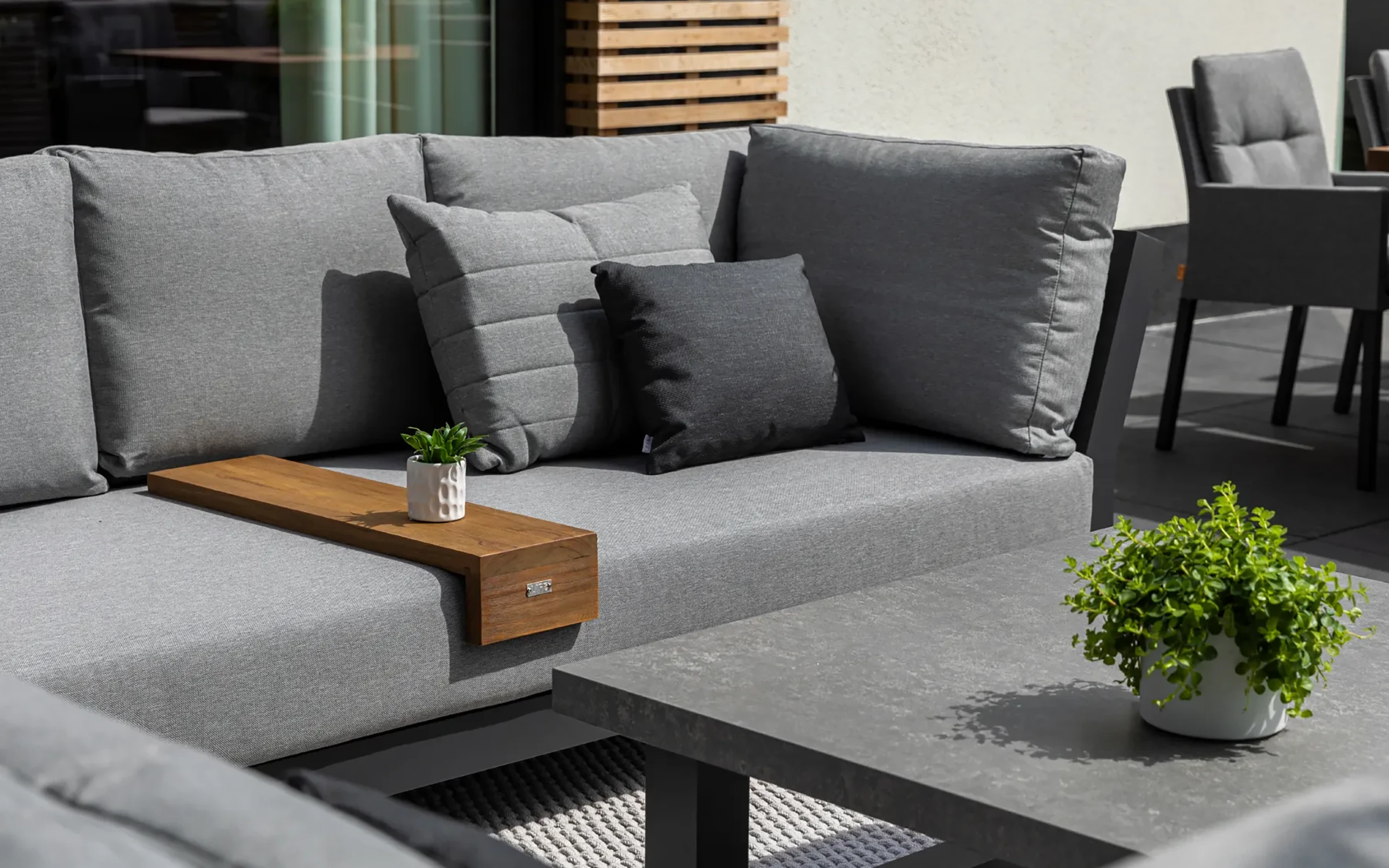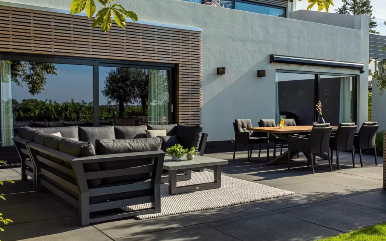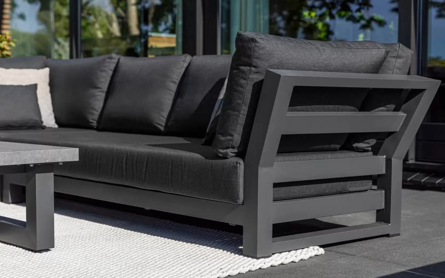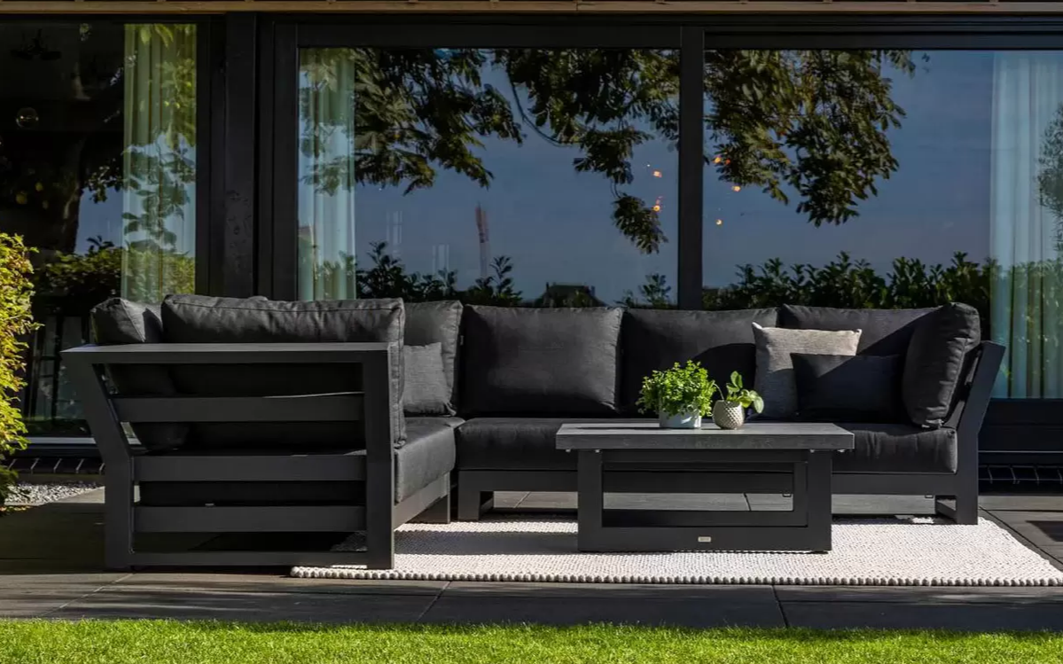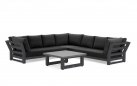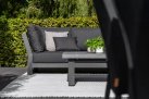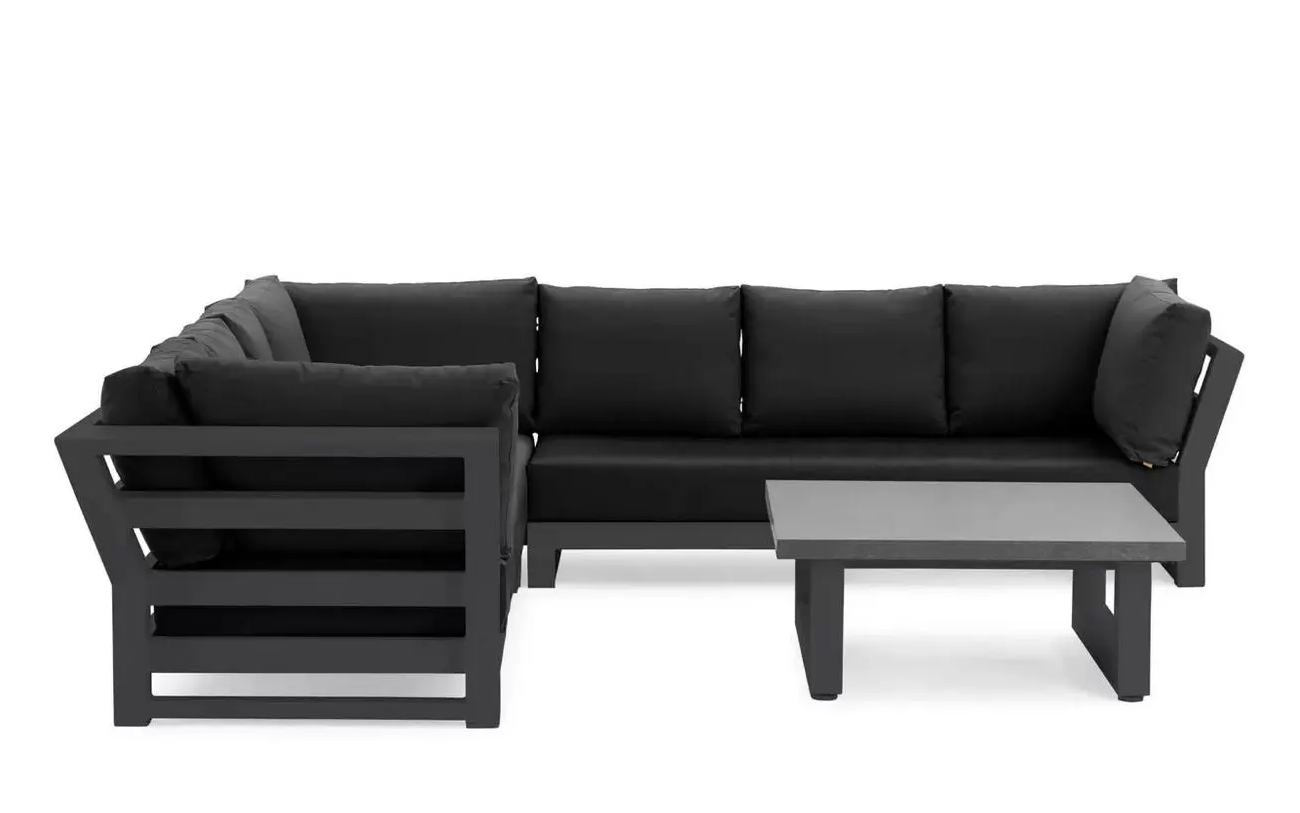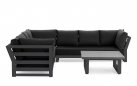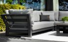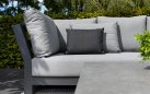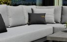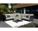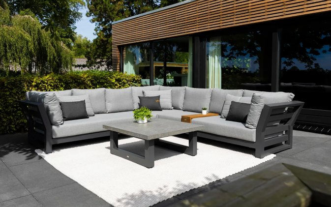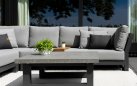 Zestaw narożnikowy Nevada przyciąga wzrok w ogrodzie. Daje bardzo dużo dużo komfortu dzięki poduszkom o aż 16 cm grubości na siedziskach i 20 cm na oparciach oraz przede wszystkim ogromnym wymiarom. Wytrzymały blat z drewna tekowego pasuje idealnie do tego narożnika. Nowoczesne meble zostały zaprojektowane tak, aby przetrwać próbę czasu a drewno tekowe z czasem będzie się starzeć jak dobre wino nabierając srebrzystego koloru. Stolik wykonany jest z aluminium i drewna tekowego i ma głęboki kolor drewna. Wygląd materiału dobrze pasuje do zestawu wypoczynkowego.