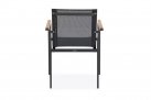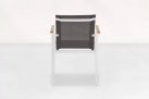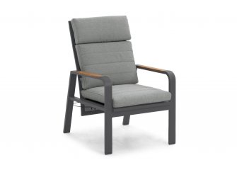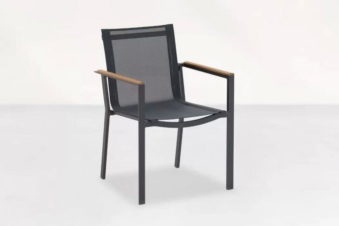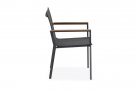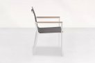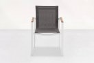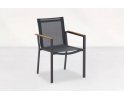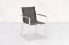 Krzesło ogrodowe o konstrukcji aluminiowej z siedziskiem przechodzącym płynnie w oparcie z tekstyliny. Podłokietniki z wstawkami teak. Konstrukcja fotela umożliwia sztaplowanie. Do fotela można dokupić poduszki na siedzisko i oparcie z materiału AllWeather.