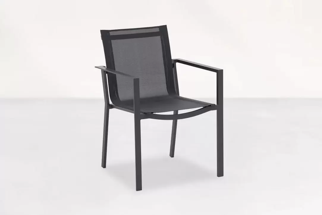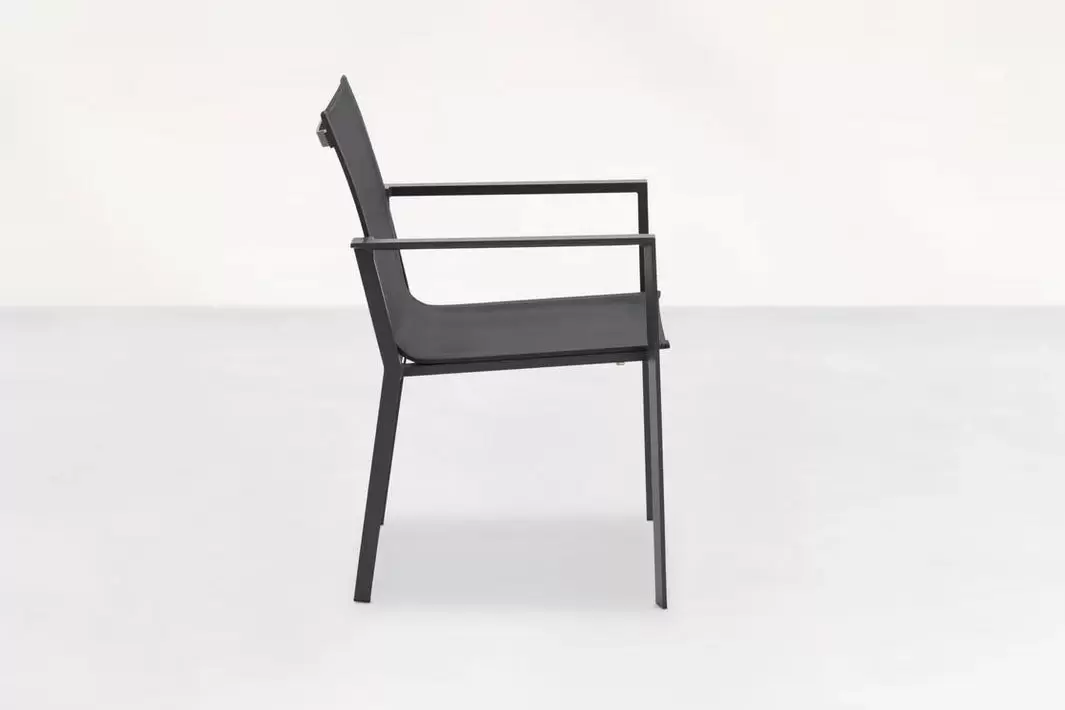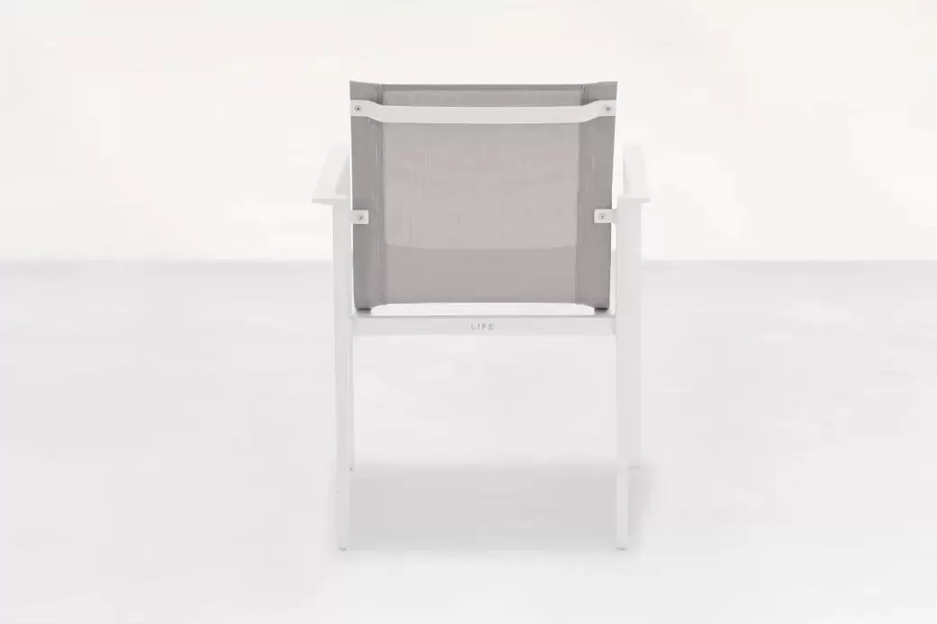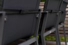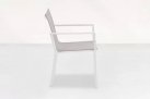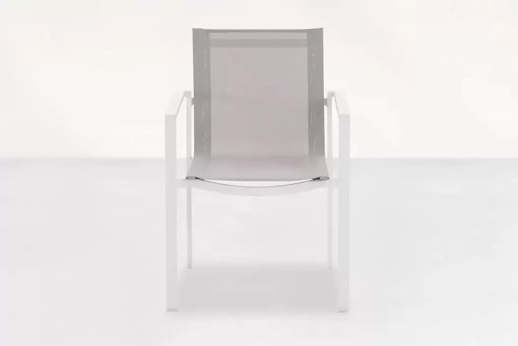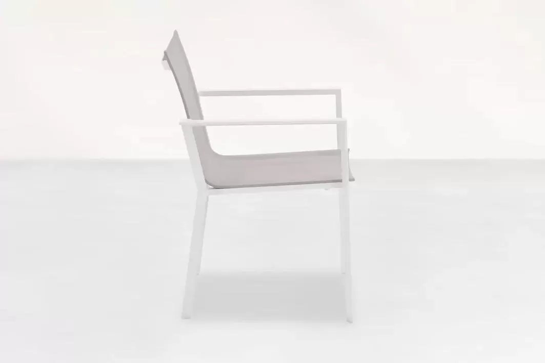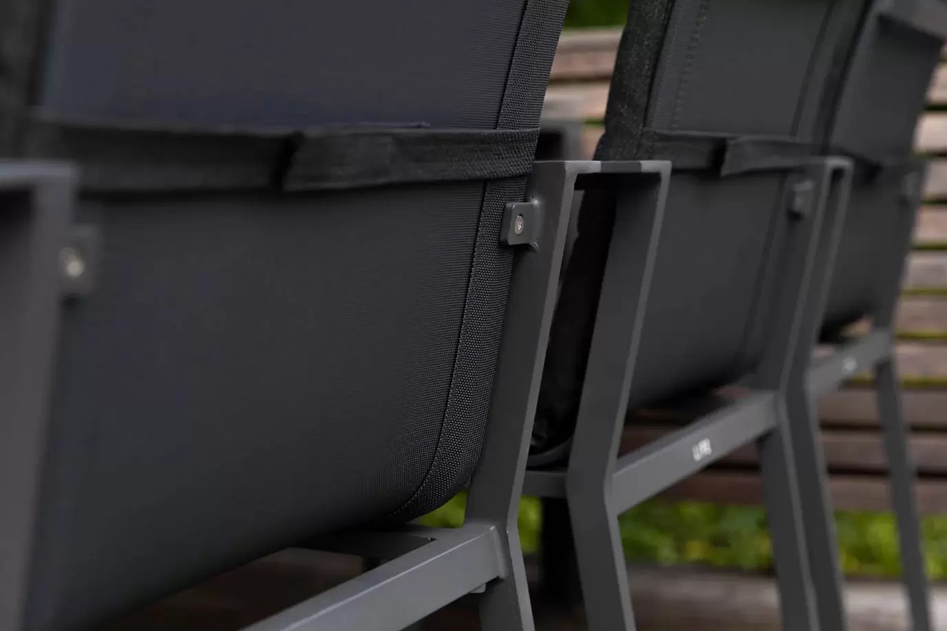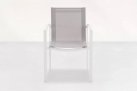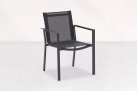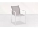 Krzesło ogrodowe o konstrukcji aluminiowej z siedziskiem przechodzącym płynnie w oparcie z tekstyliny. Konstrukcja fotela umożliwia sztaplowanie. Do fotela można dokupić poduszki na siedzisko i oparcie z materiału AllWeather.