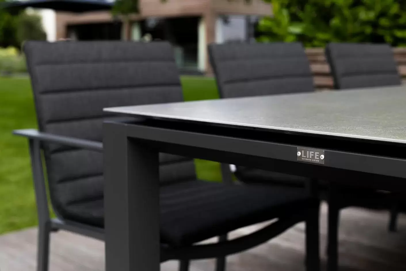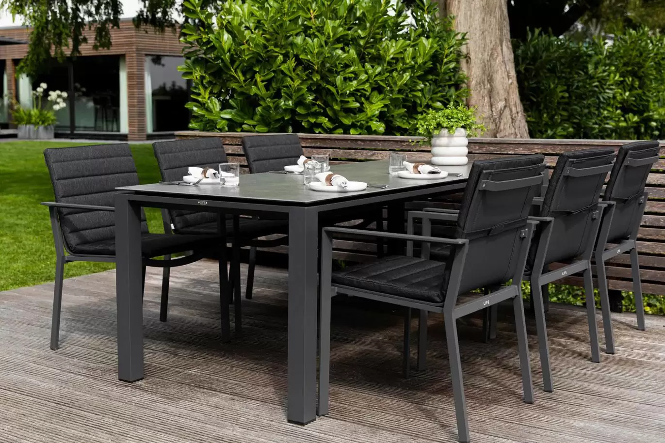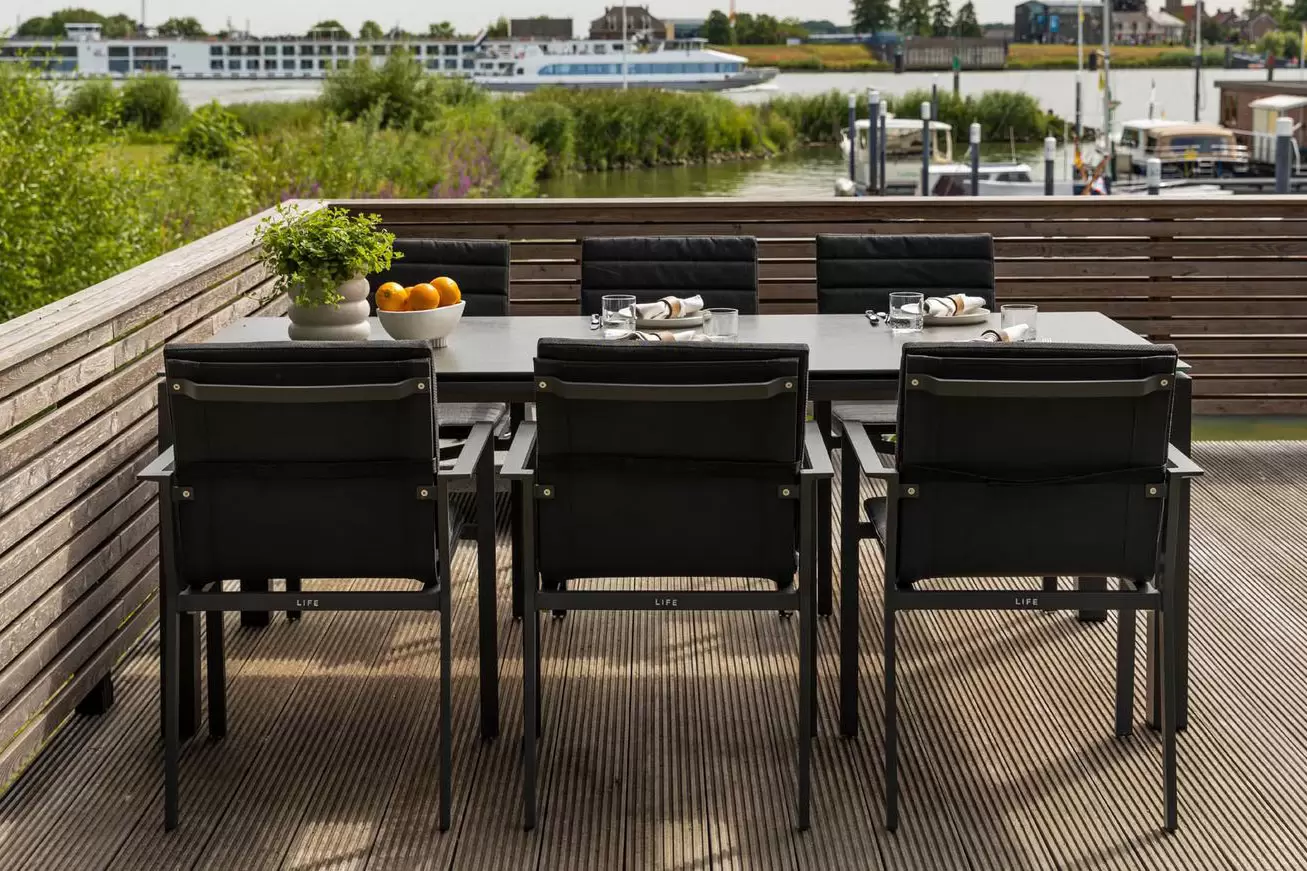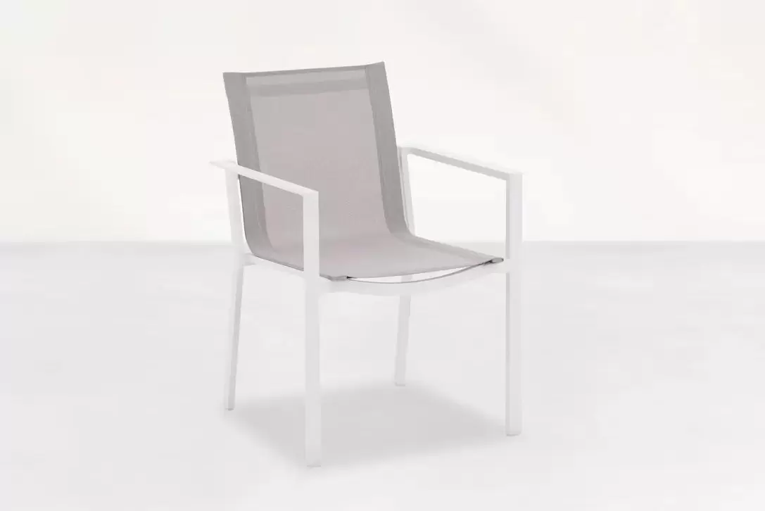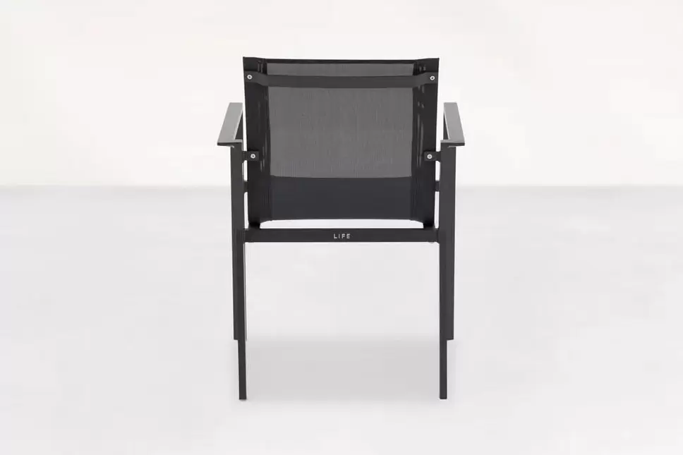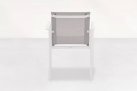 Krzesło ogrodowe o konstrukcji aluminiowej z siedziskiem przechodzącym płynnie w oparcie z tekstyliny. Konstrukcja fotela umożliwia sztaplowanie. Do fotela można dokupić poduszki na siedzisko i oparcie z materiału AllWeather.