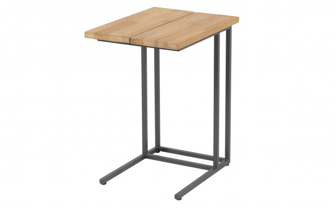 Poręczny stolik boczny 4 Seasons Outdoor Solido ma mocną aluminiową ramę malowaną proszkowo i blat z drewna tekowego.