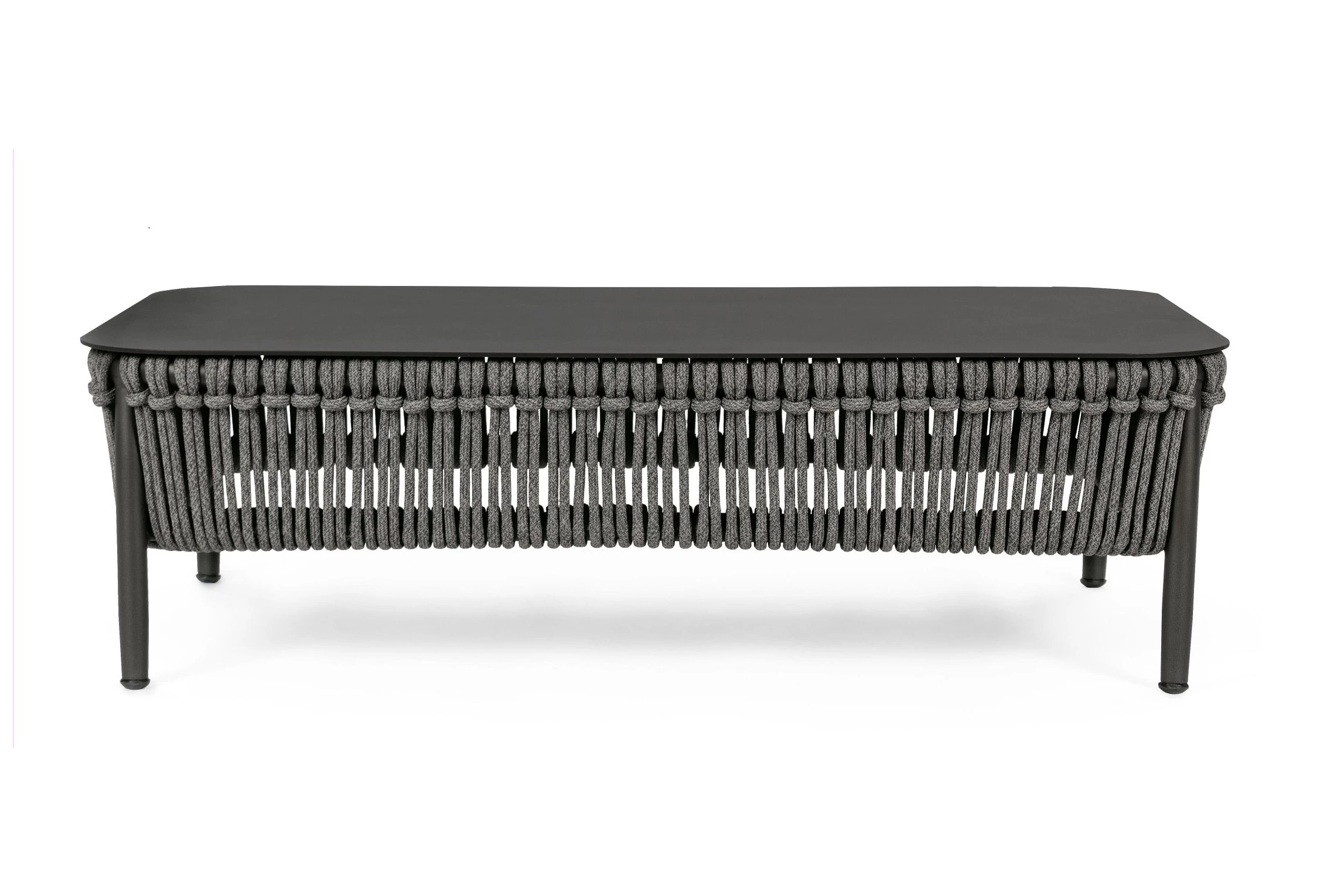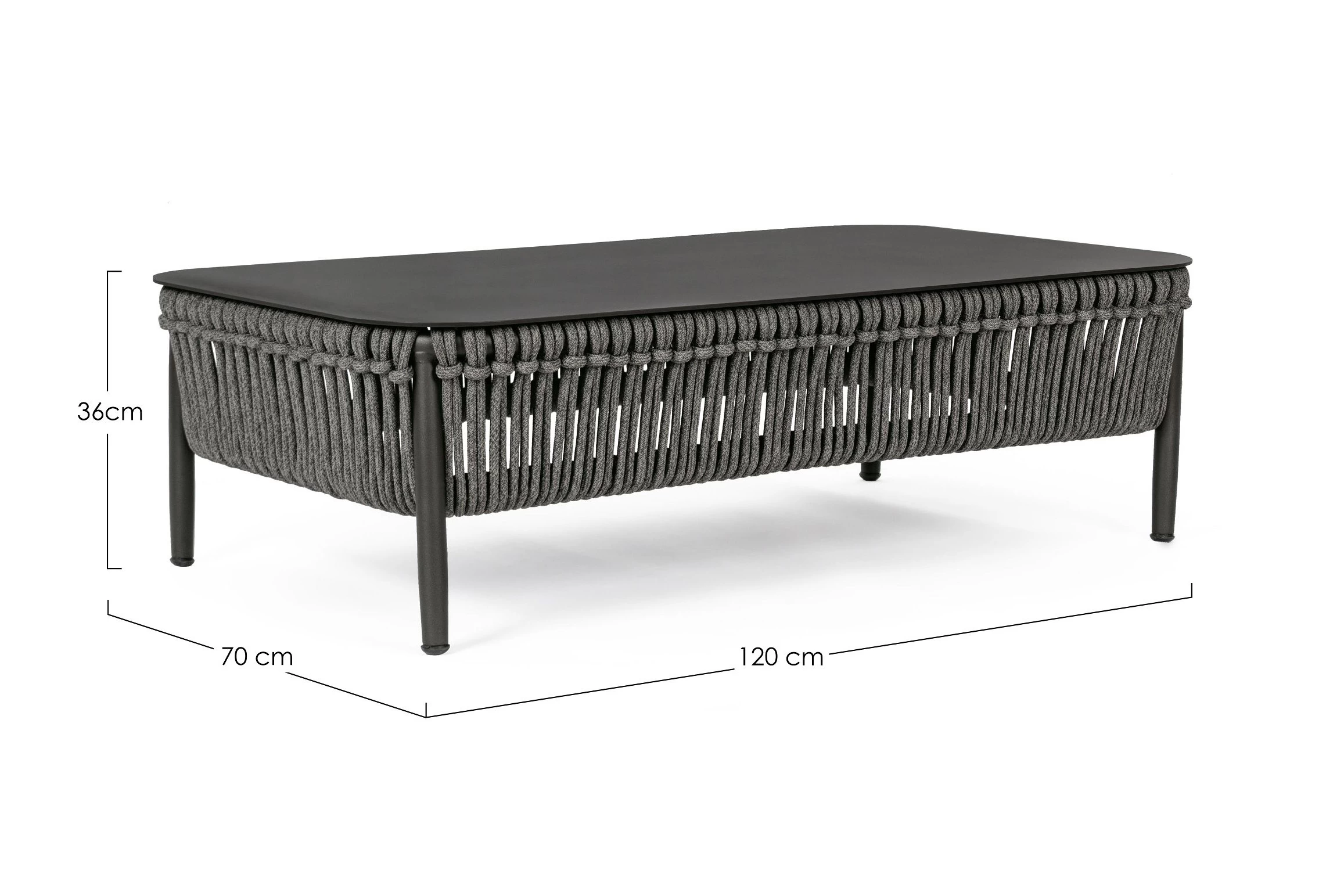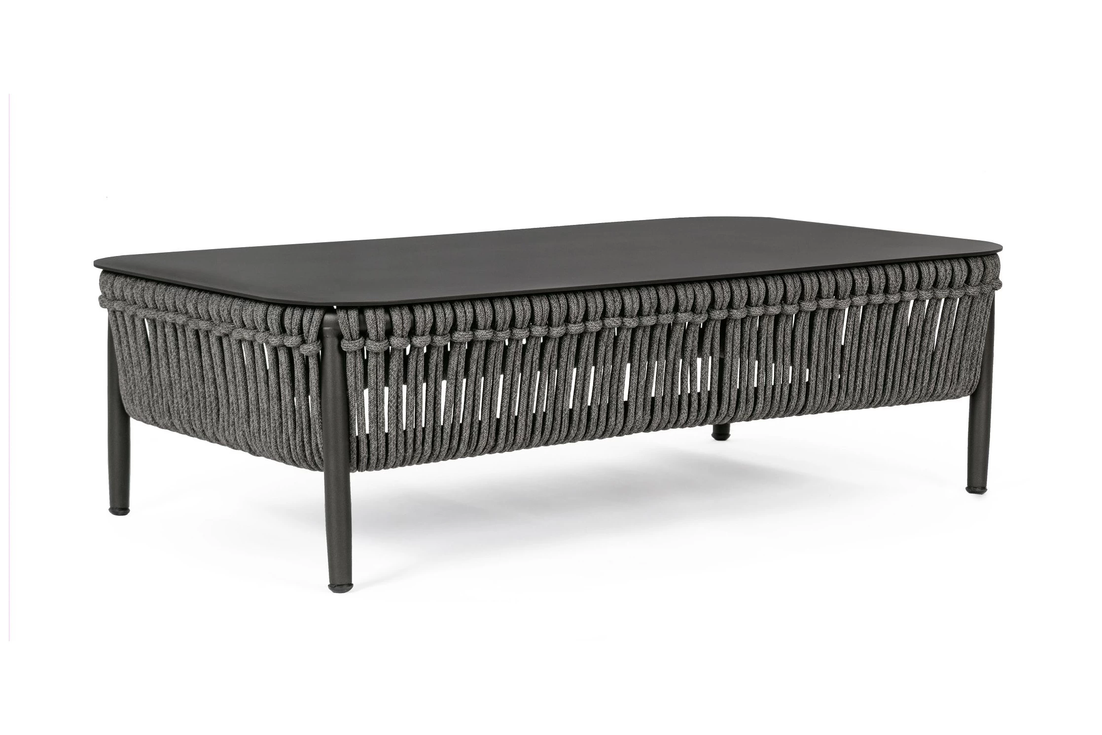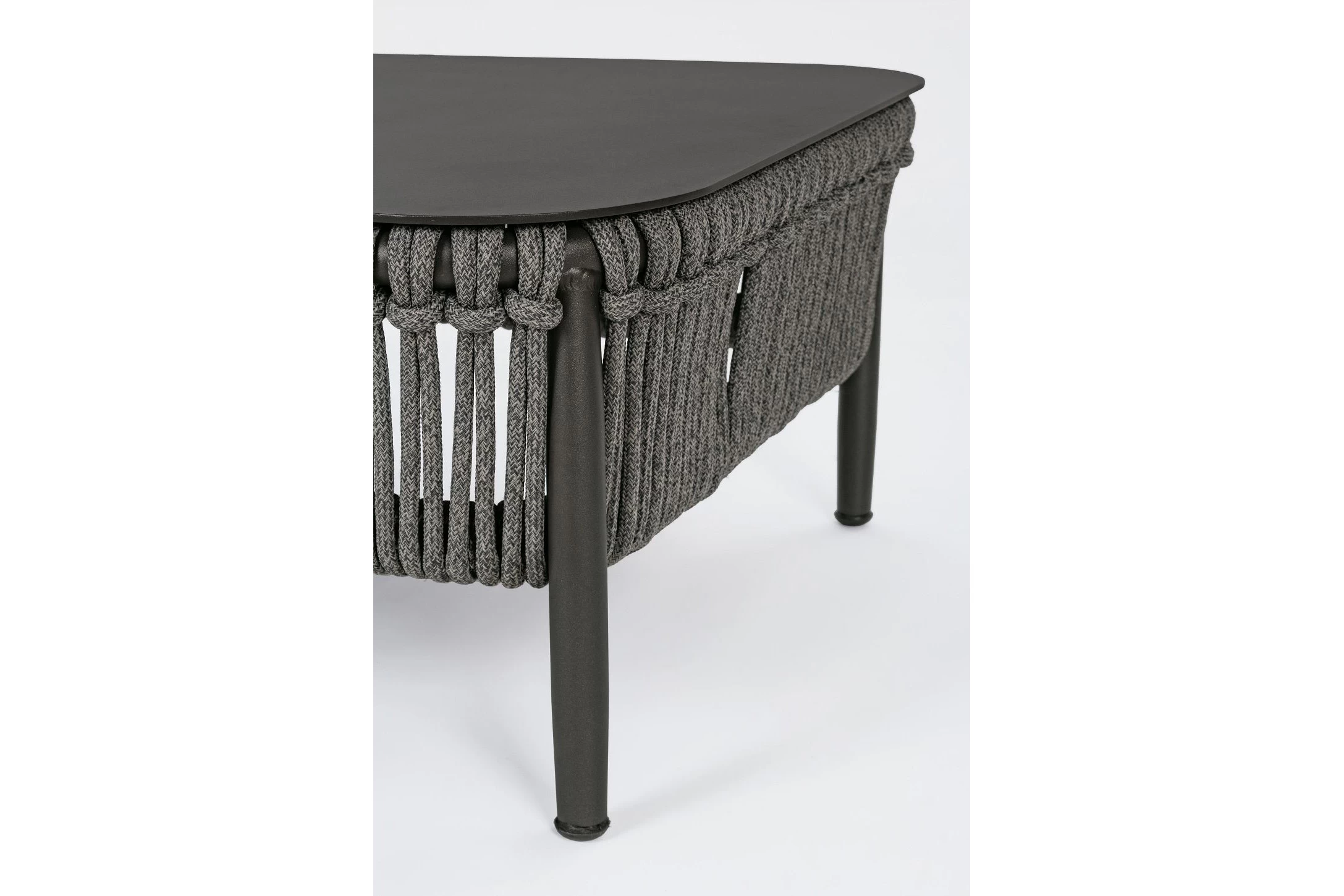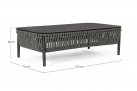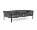 Nowoczesny stolik kawowy aluminiowy na taras z bokami wyplecionymi z liny polipropylenowej. Blat stolika ze szkła hartowanego pokrytego powłoką kamienną.