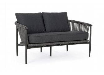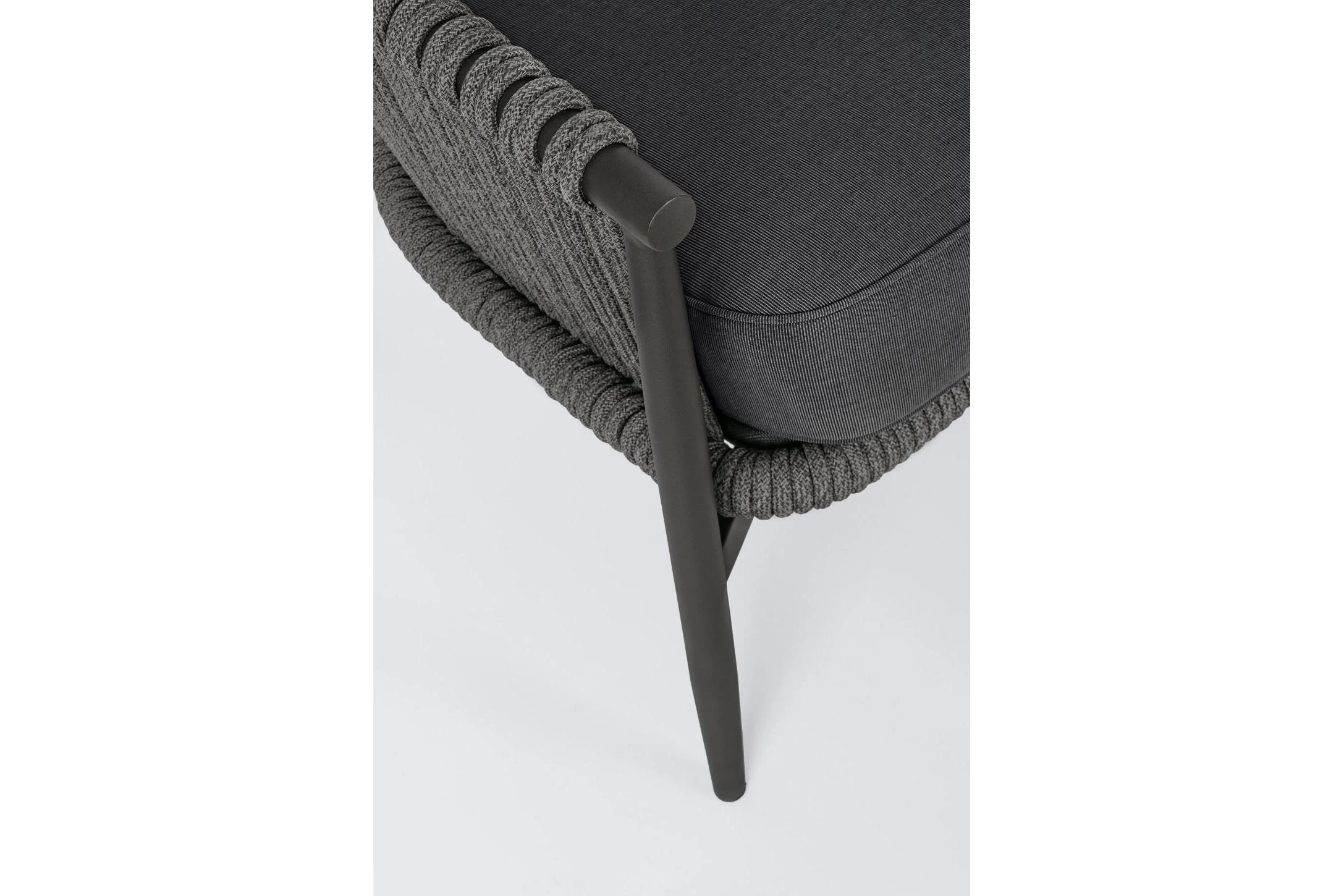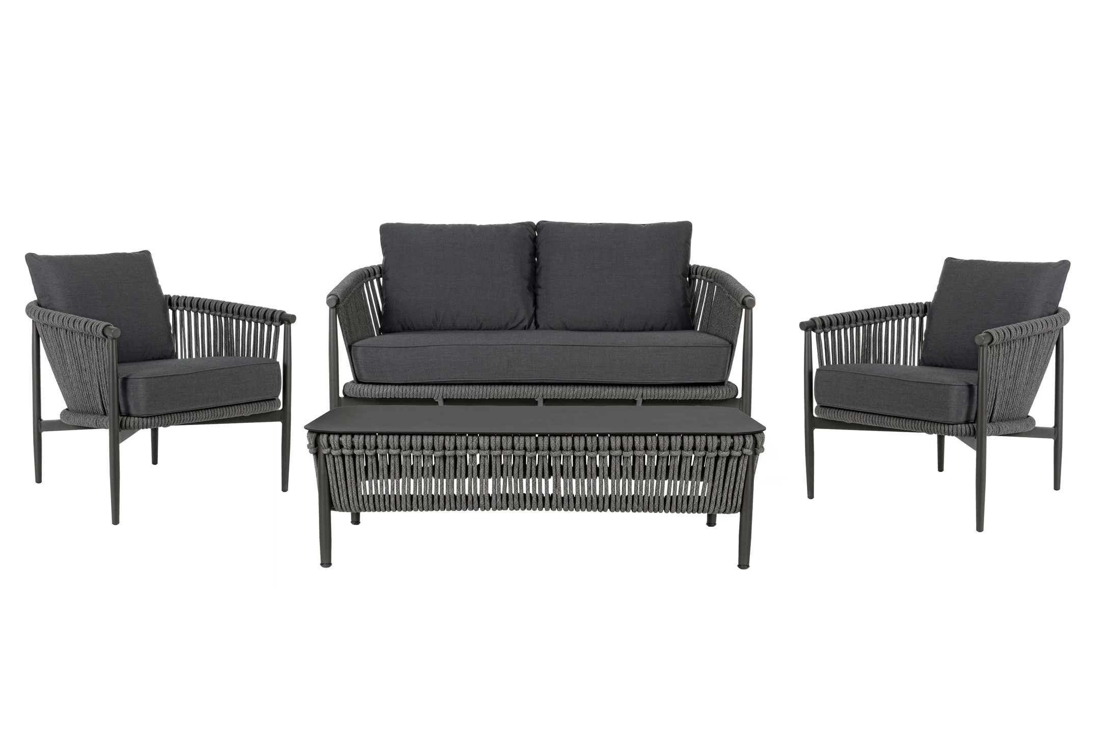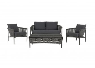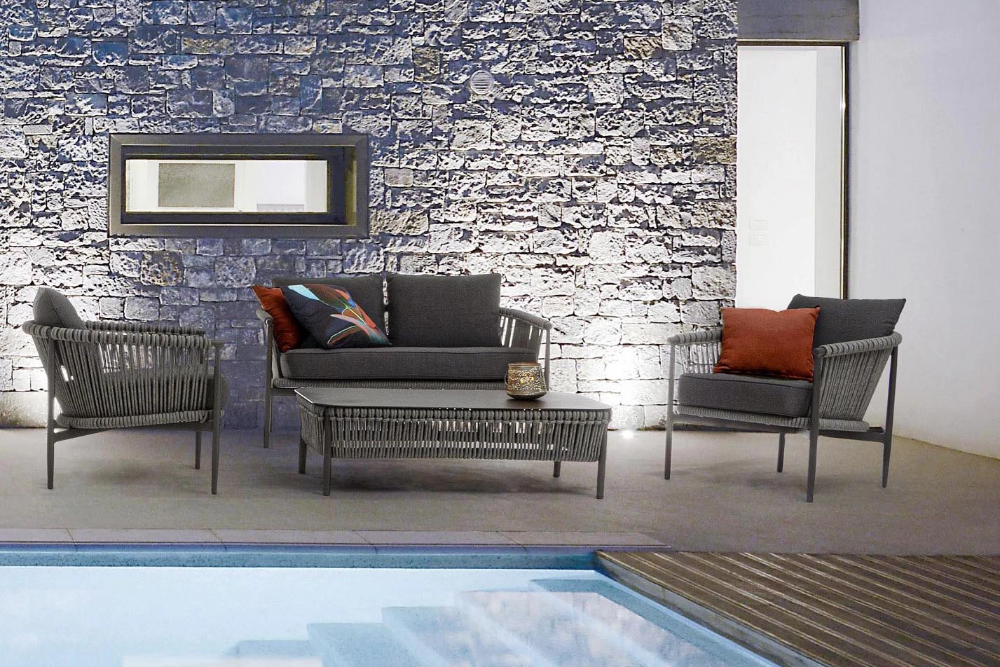 Nowoczesny stolik kawowy aluminiowy na taras z bokami wyplecionymi z liny polipropylenowej. Blat stolika ze szkła hartowanego pokrytego powłoką kamienną.