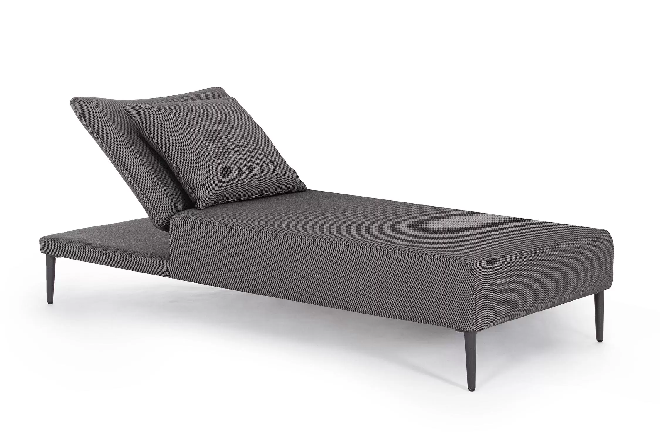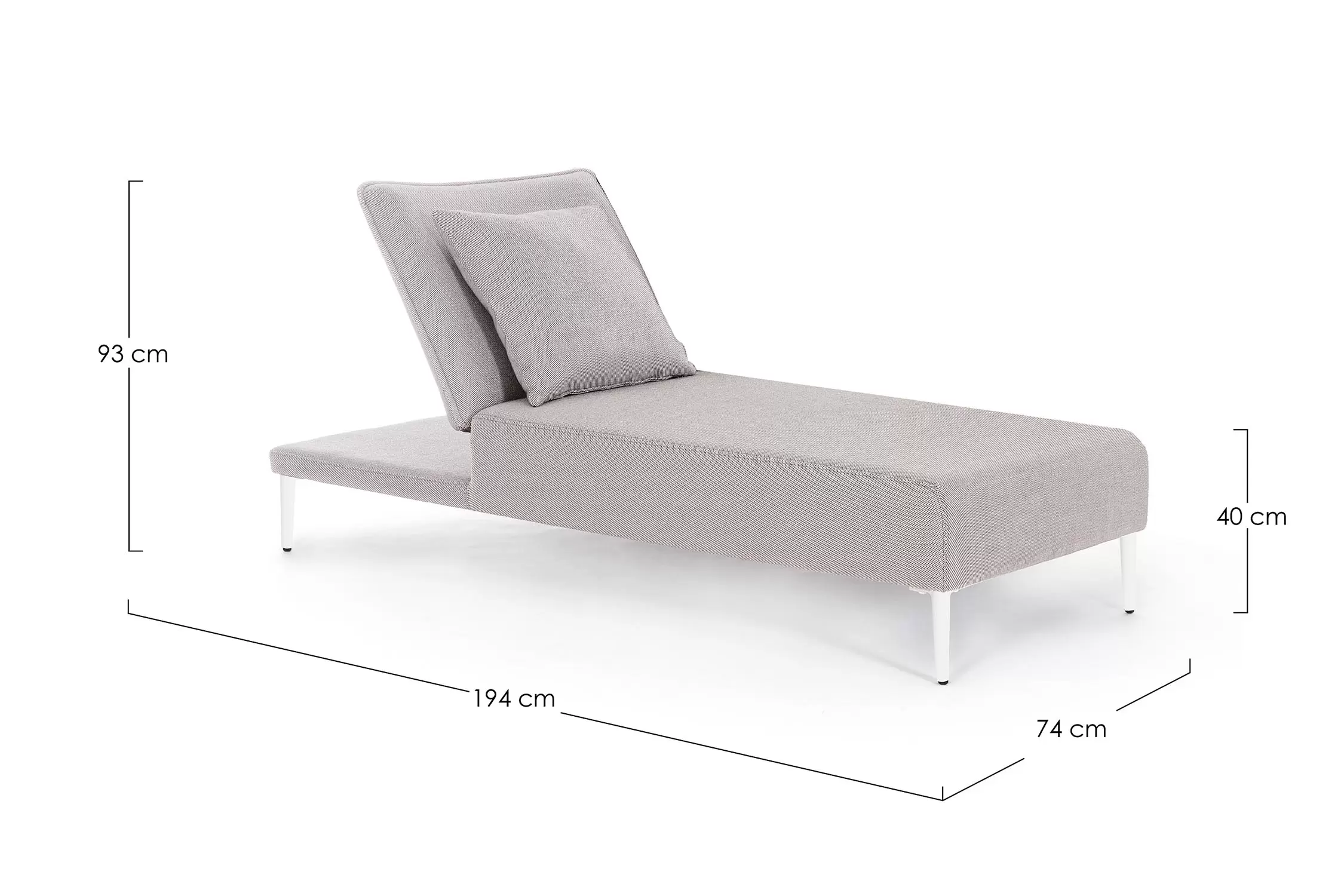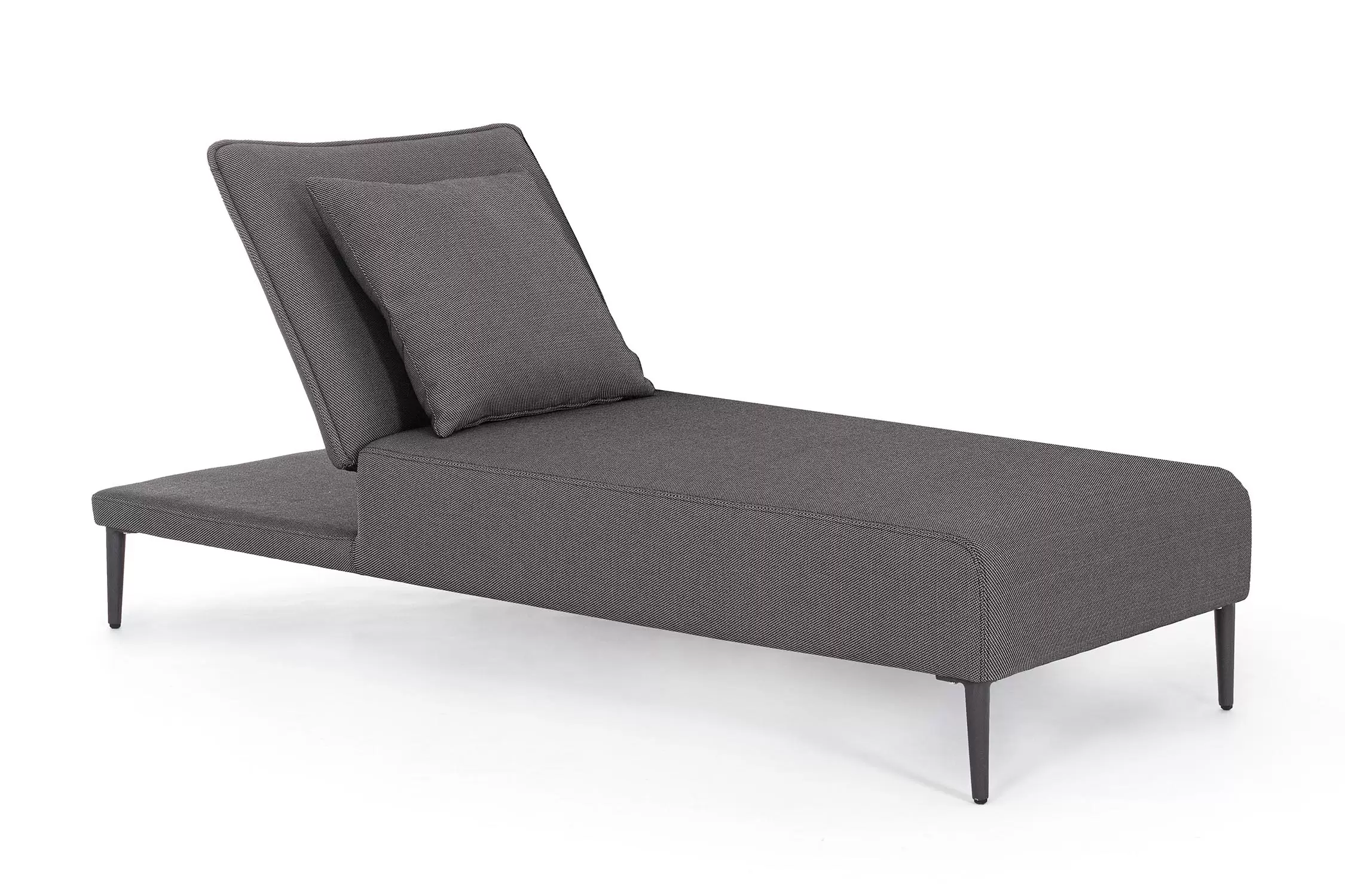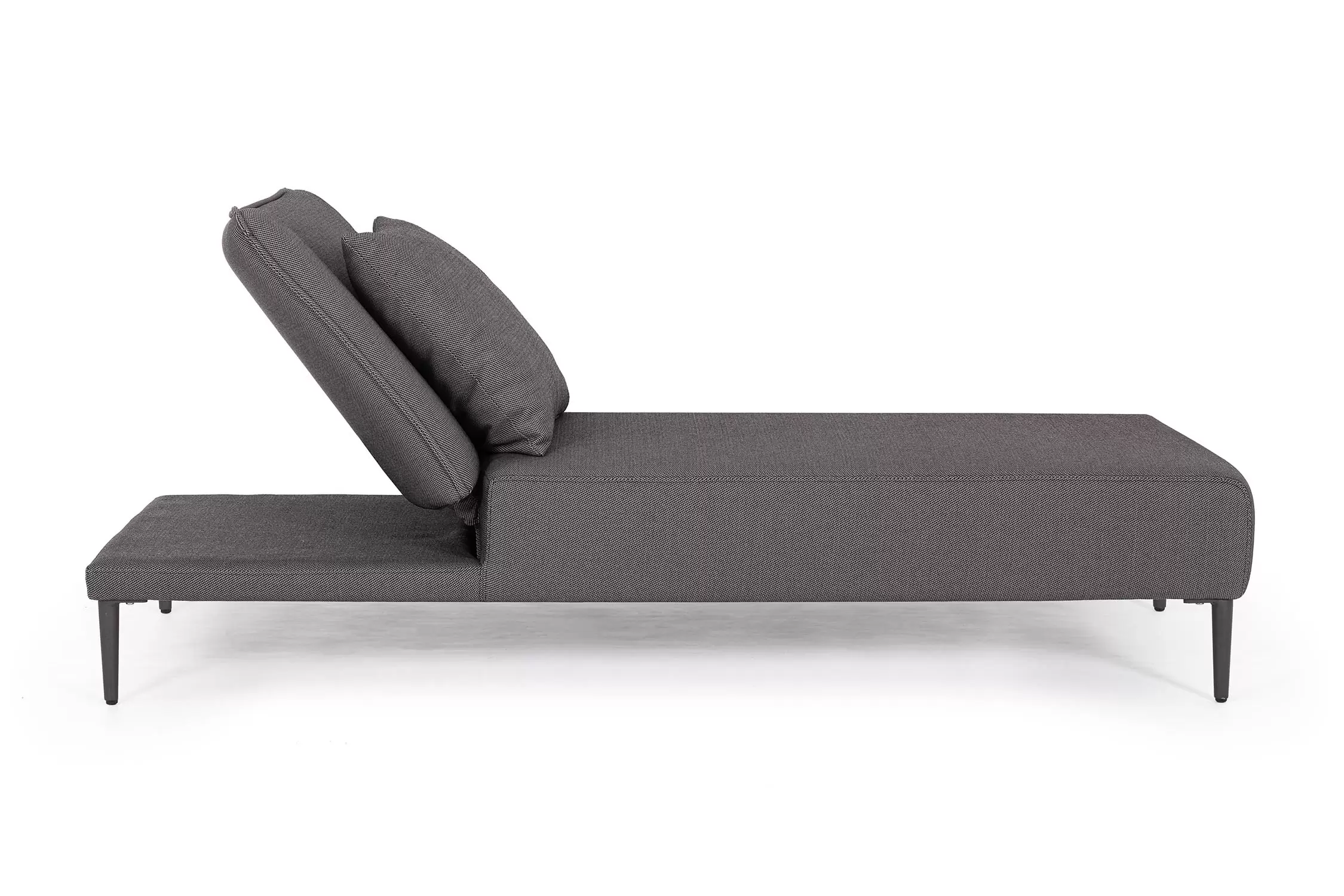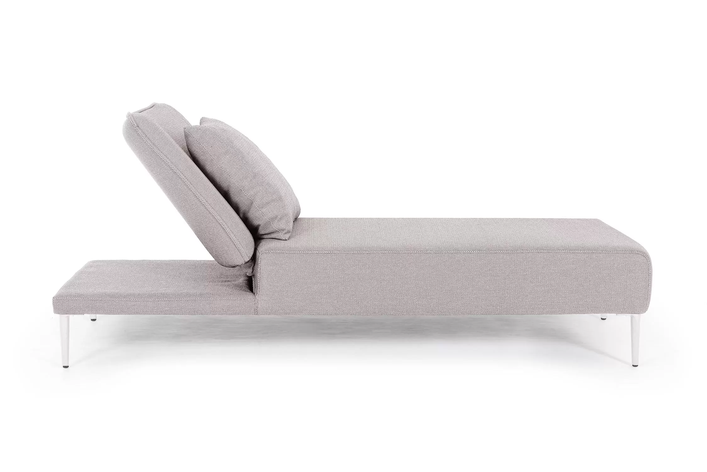 Nowoczesny leżak wykonany w całości z aluminium z regulowanym pochyleniem oparcia.