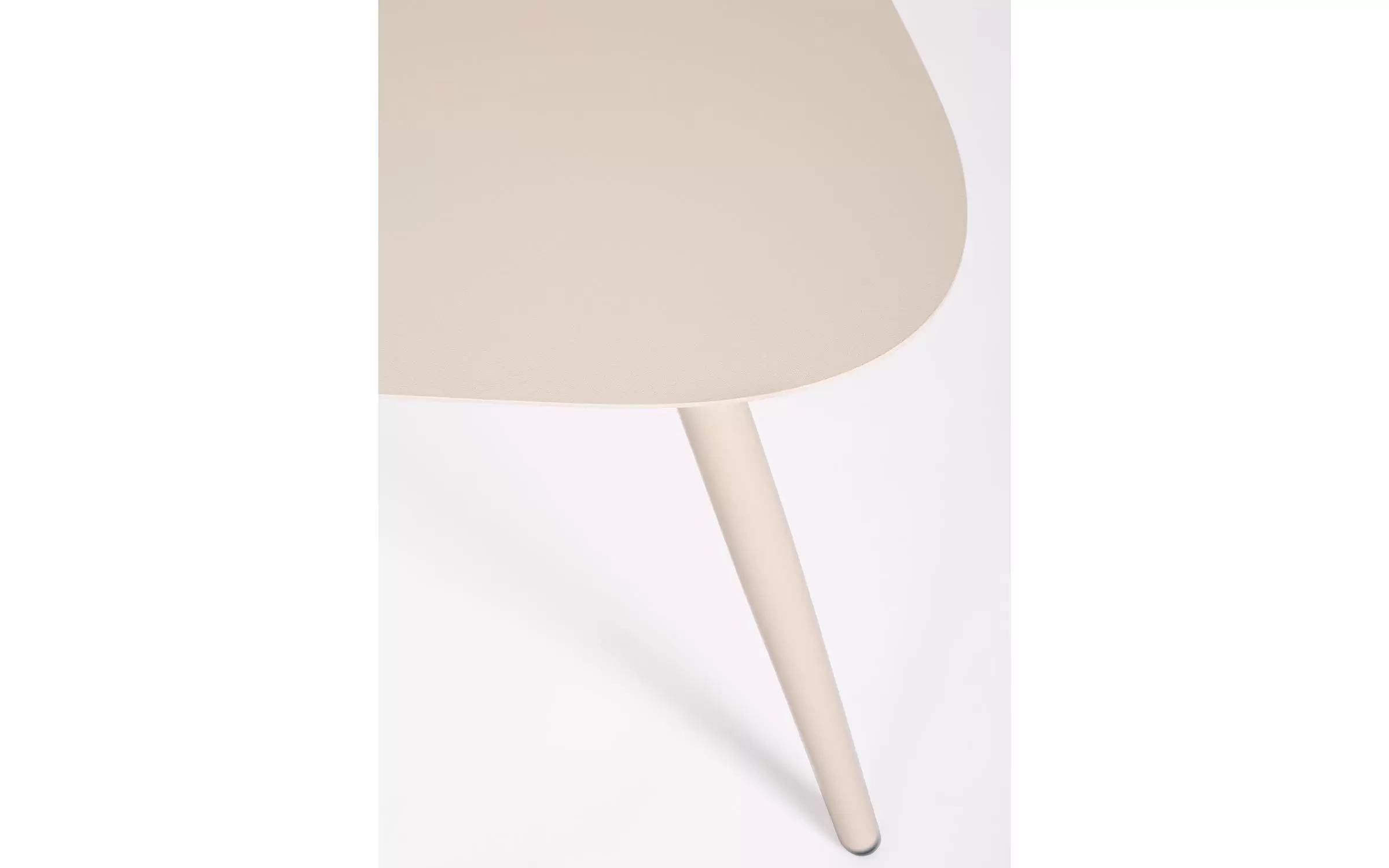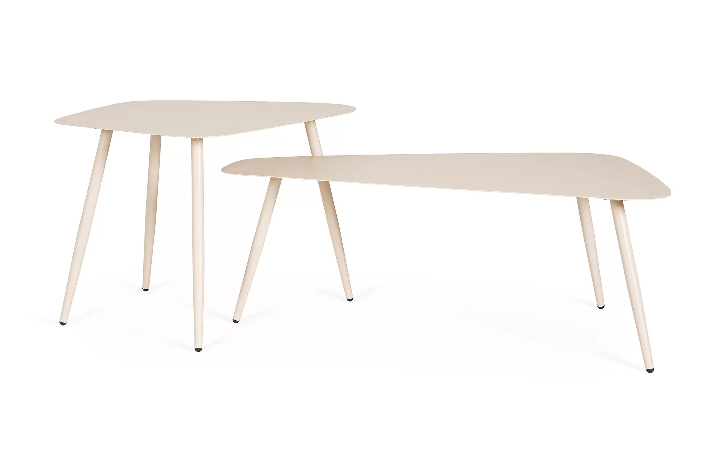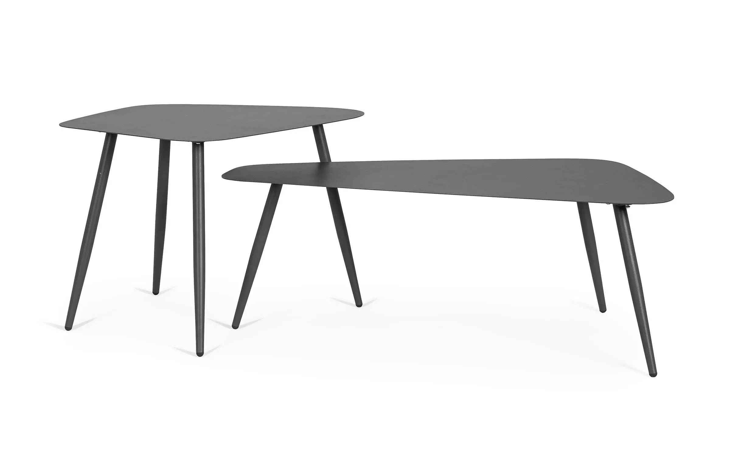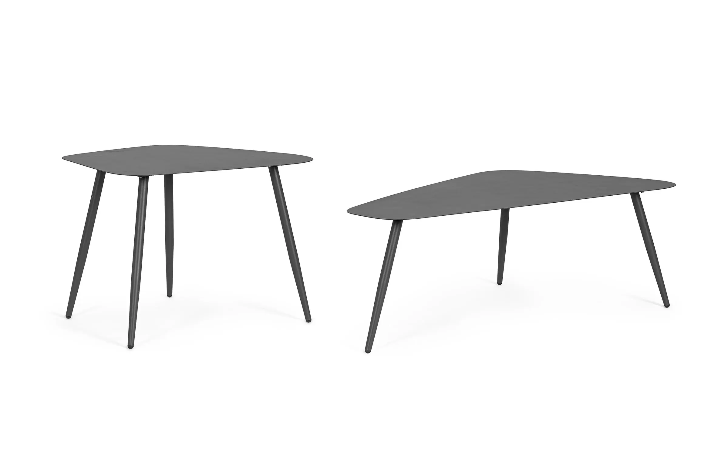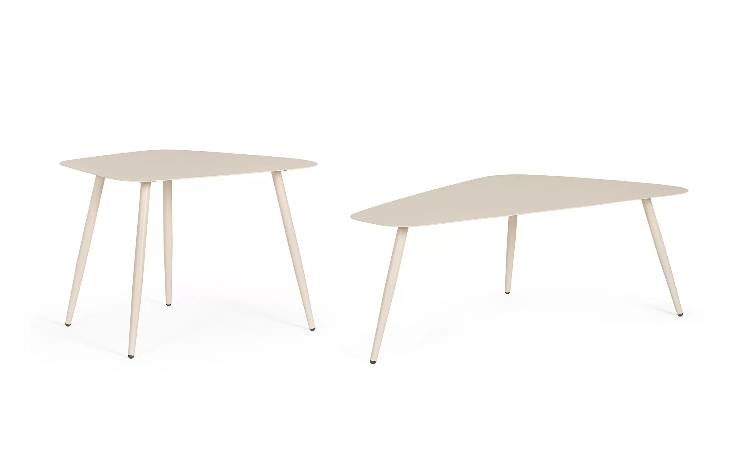 Zestaw 2 stolików kawowych do użytku na zewnątrz na 3 nogach z czworokątnymi blatami.