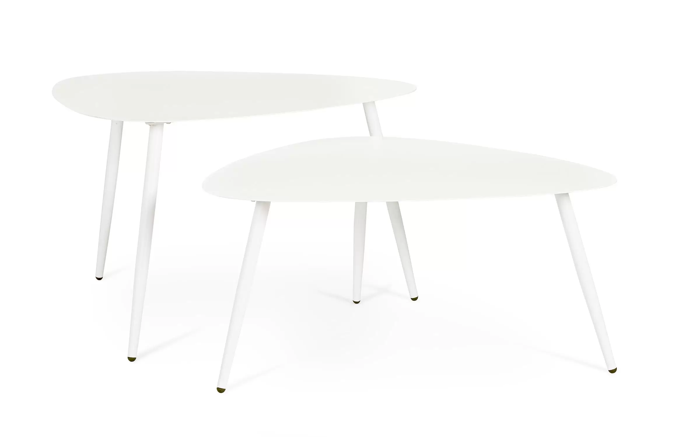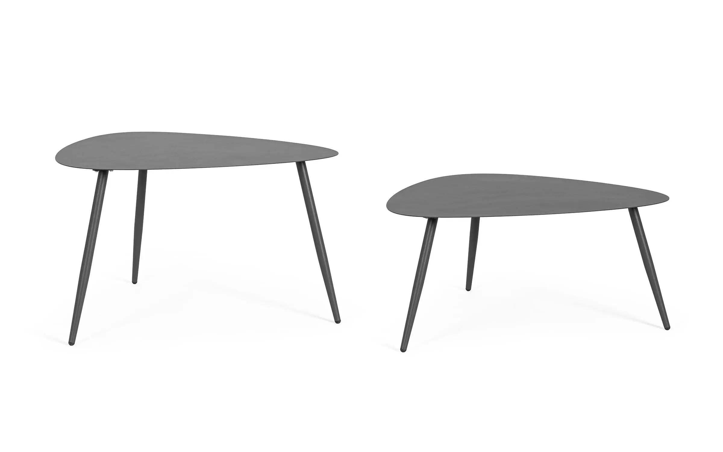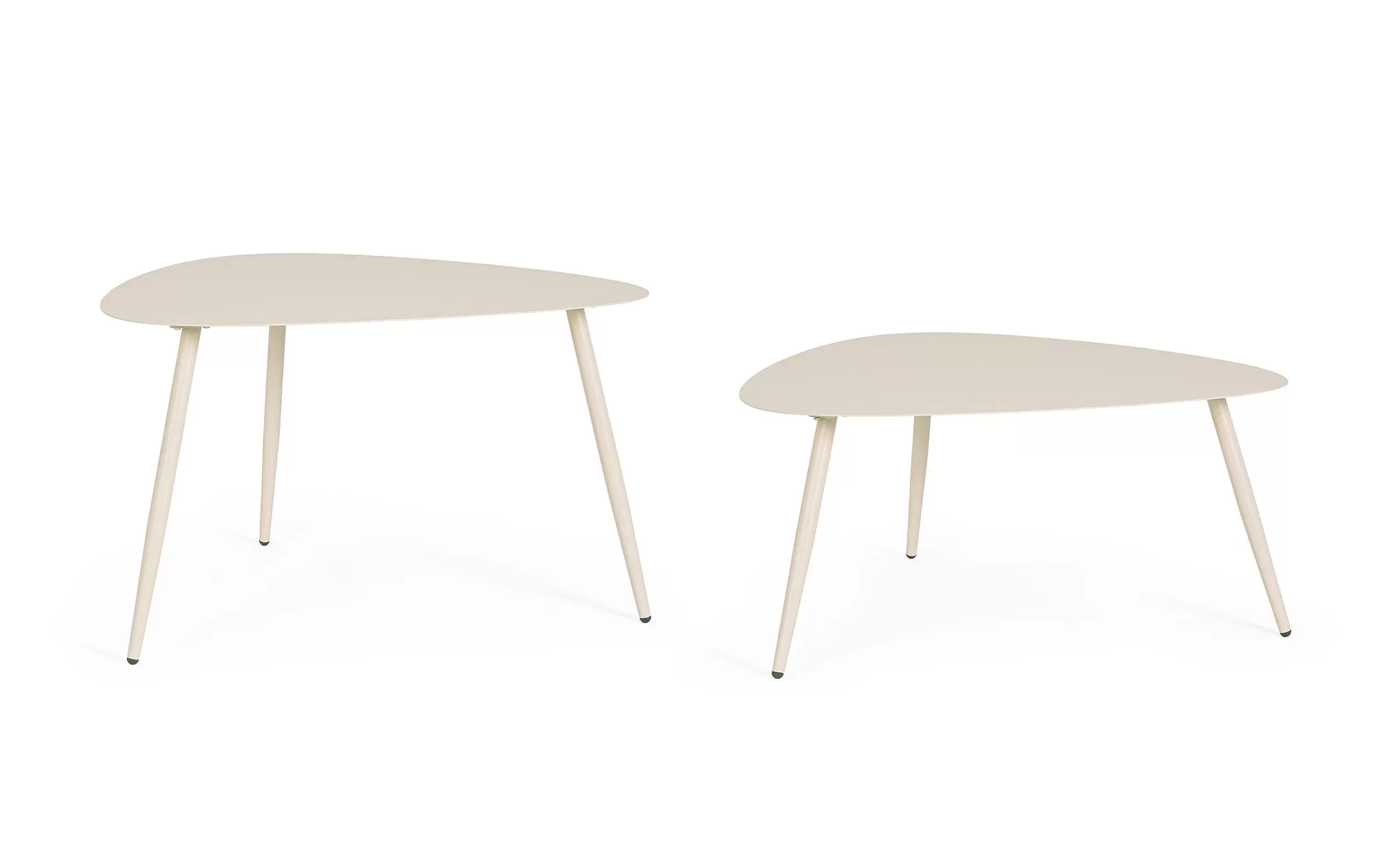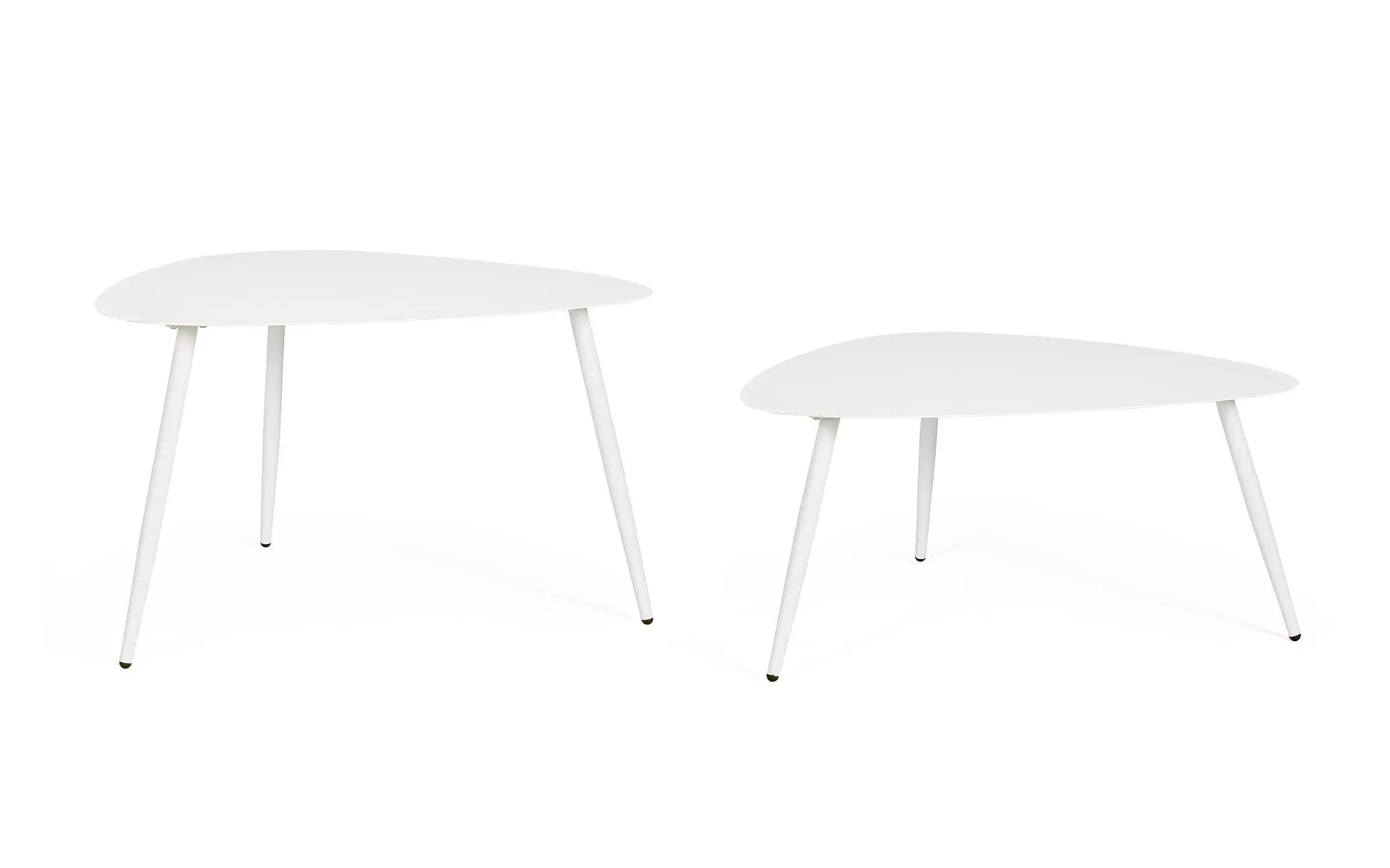 Zestaw 2 stolików kawowych do użytku na zewnątrz na 3 nogach z trójkątnymi blatami.