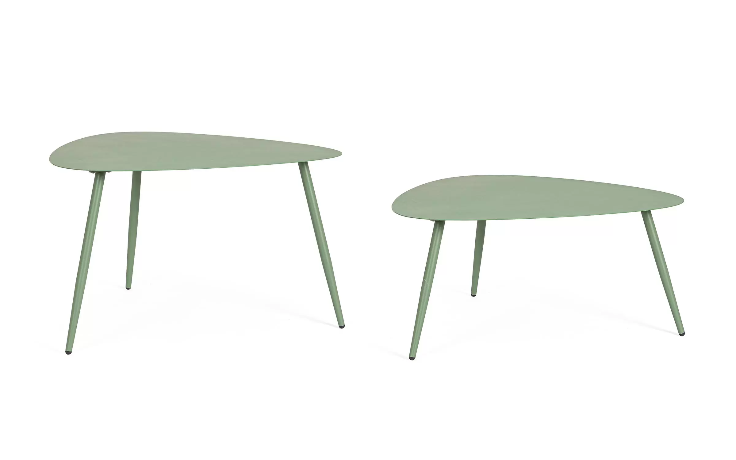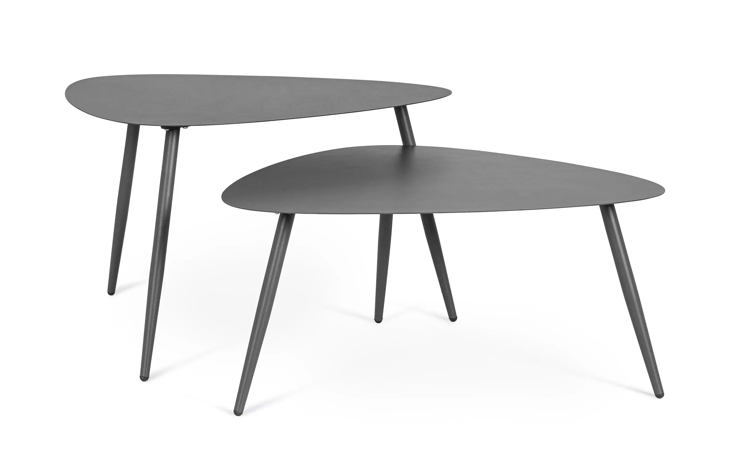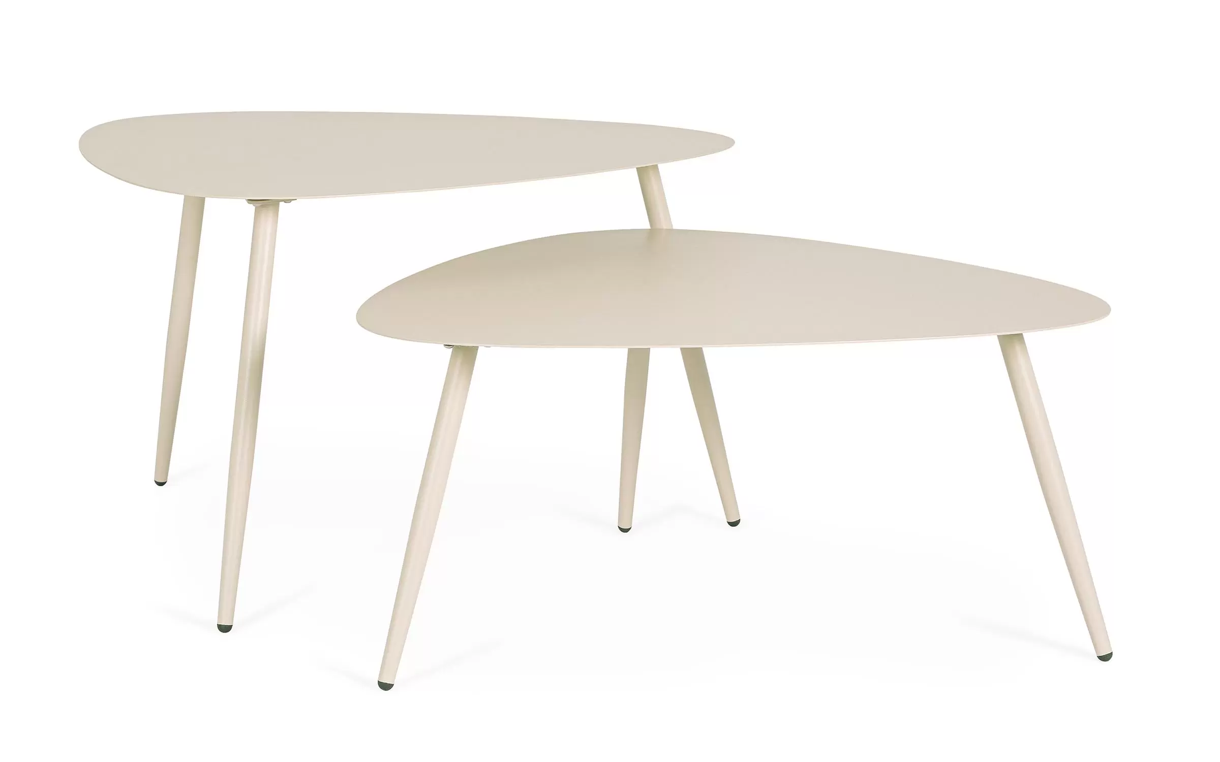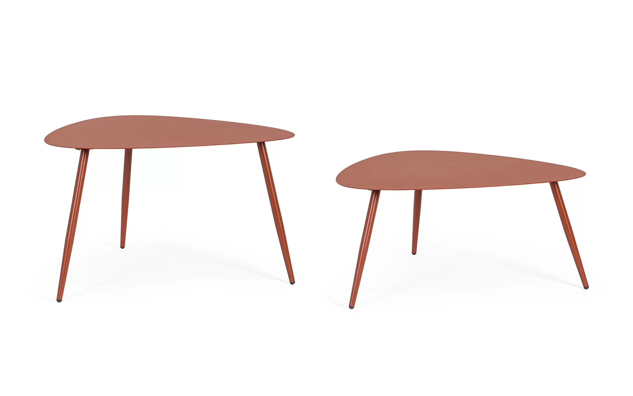 Zestaw 2 stolików kawowych do użytku na zewnątrz na 3 nogach z trójkątnymi blatami.