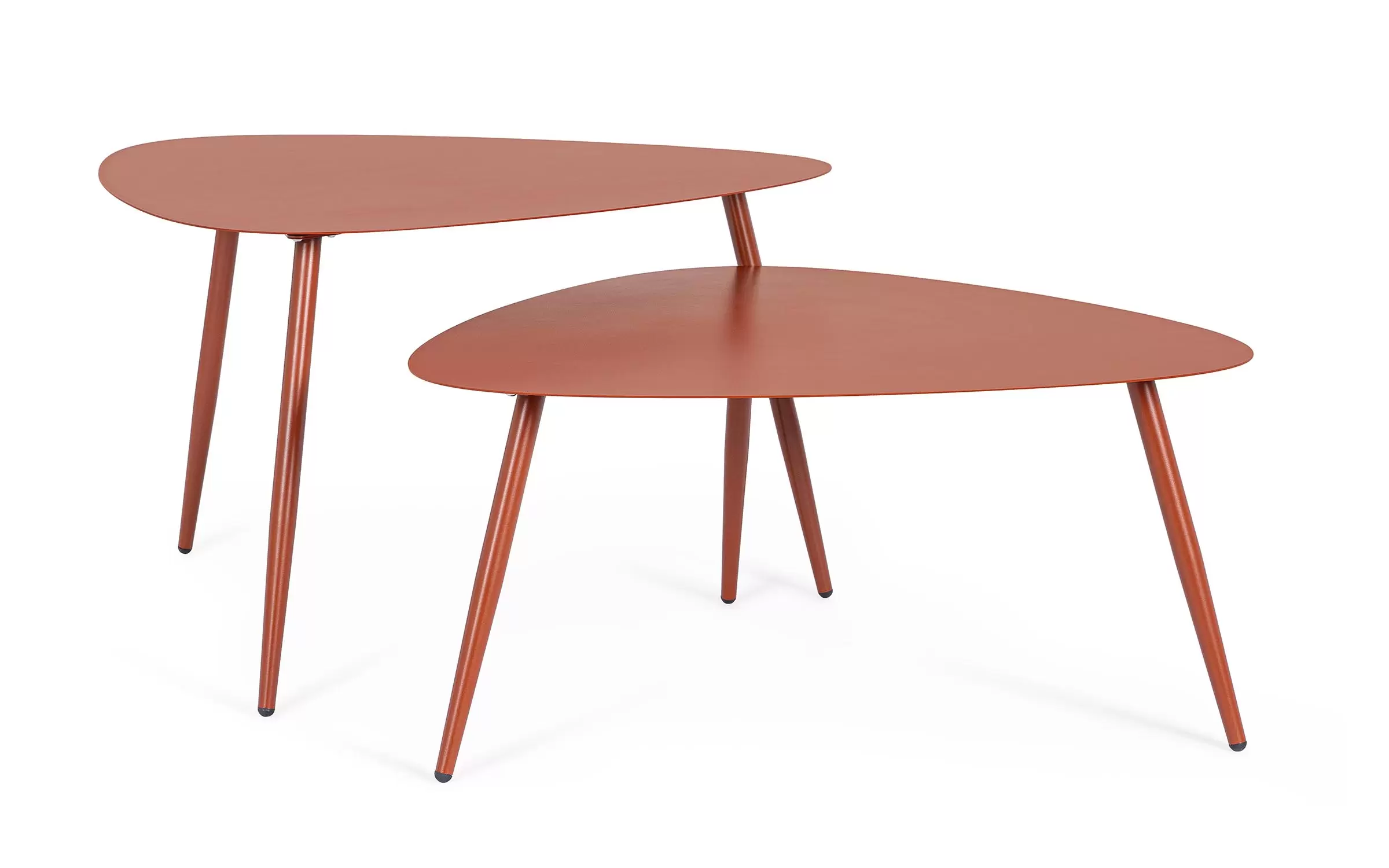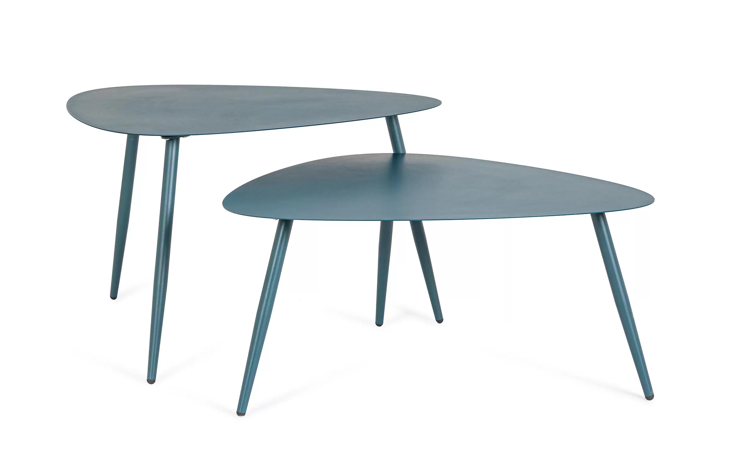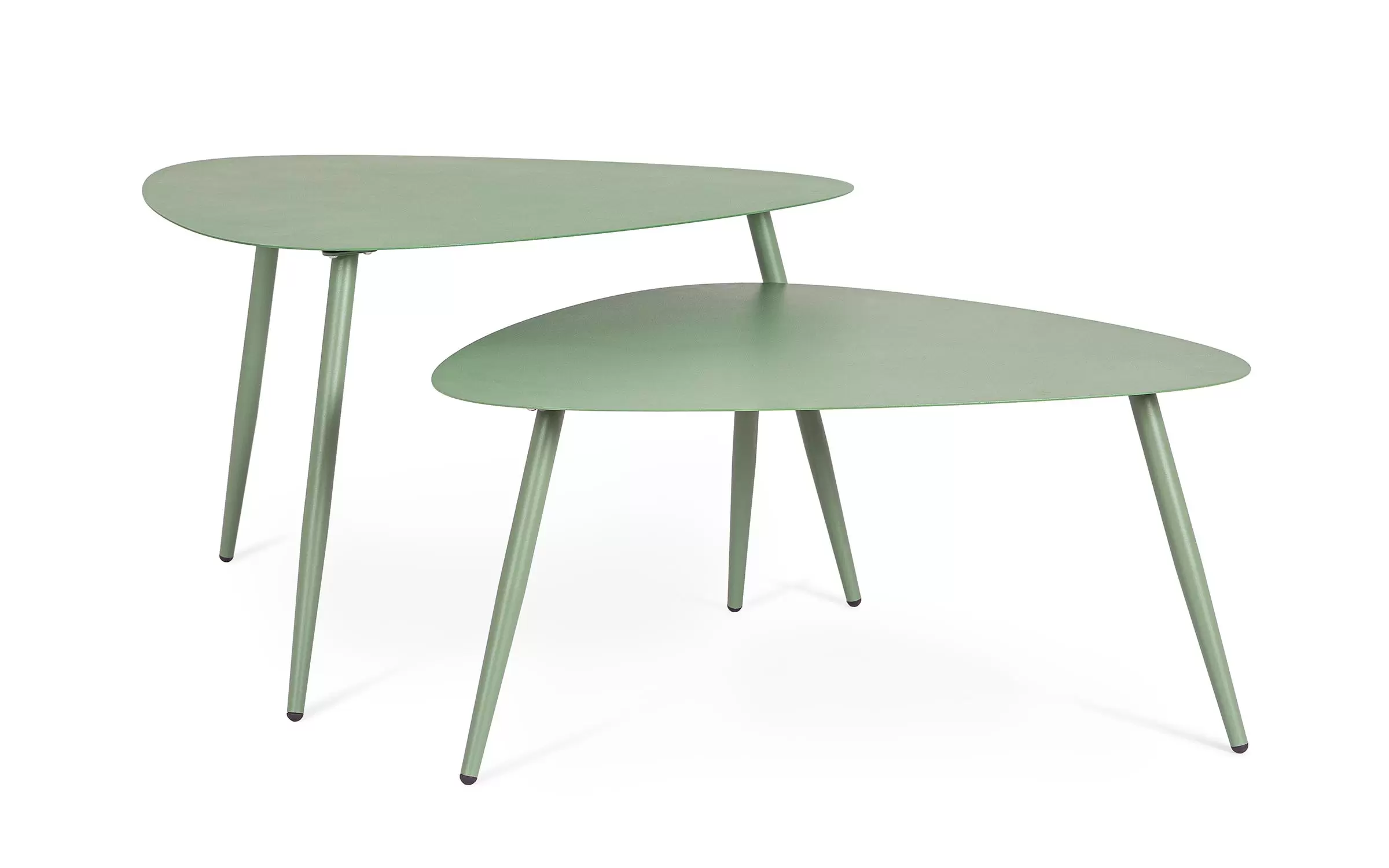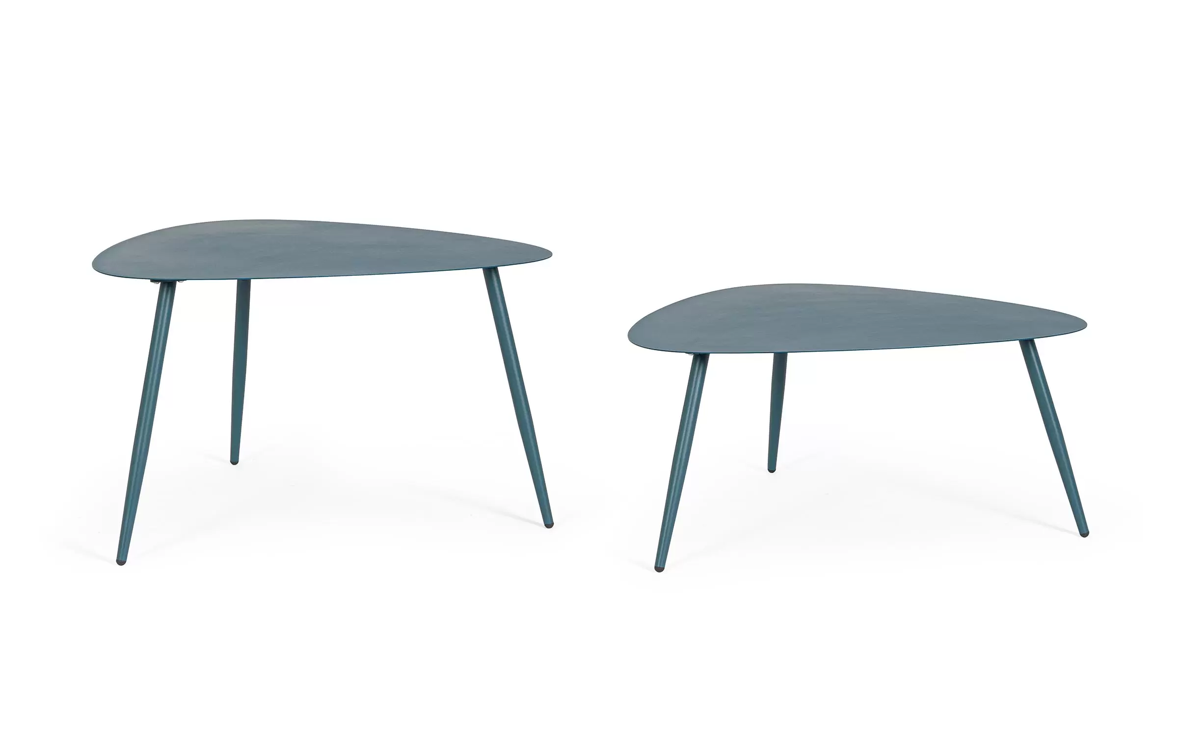 Zestaw 2 stolików kawowych do użytku na zewnątrz na 3 nogach z trójkątnymi blatami.