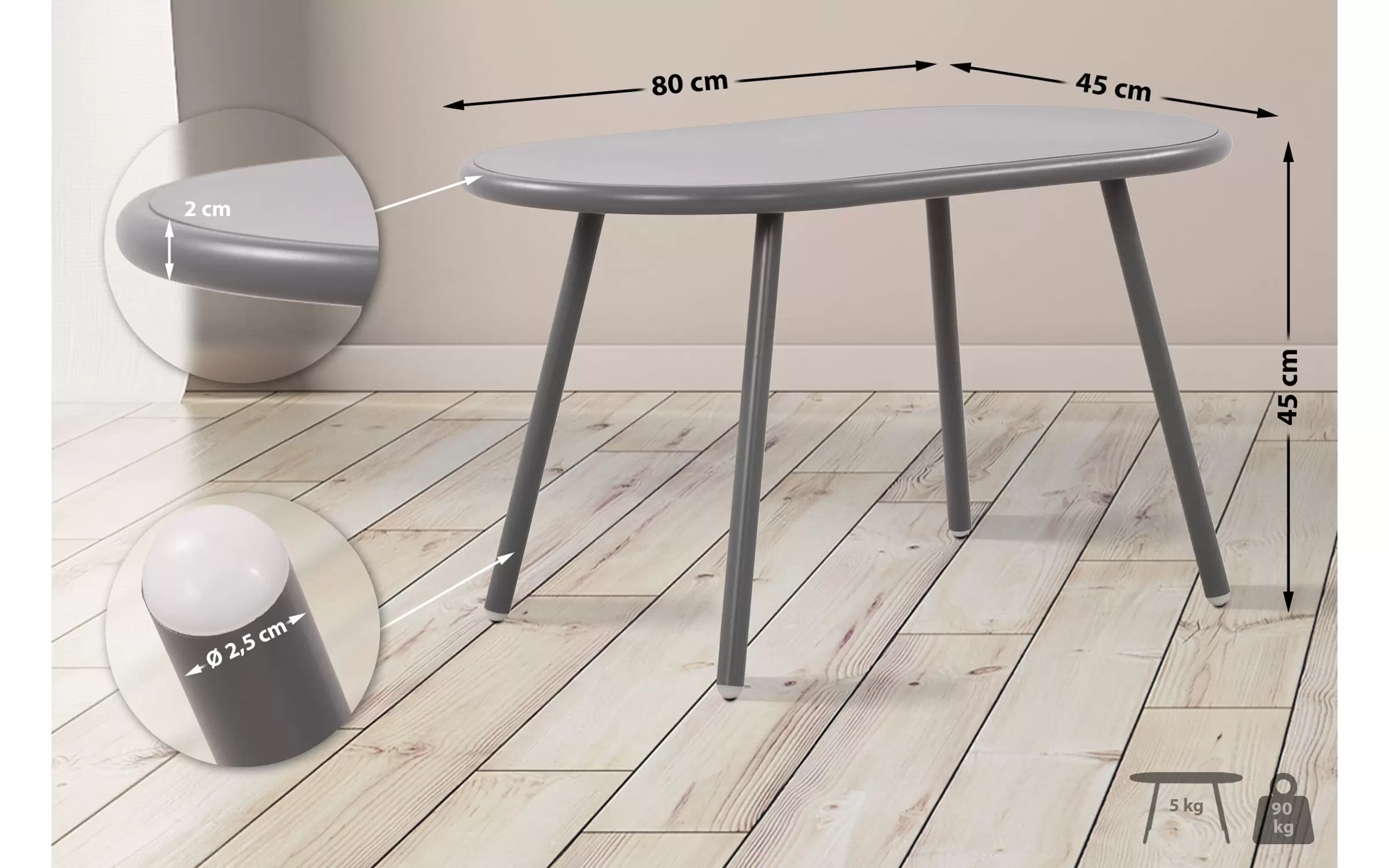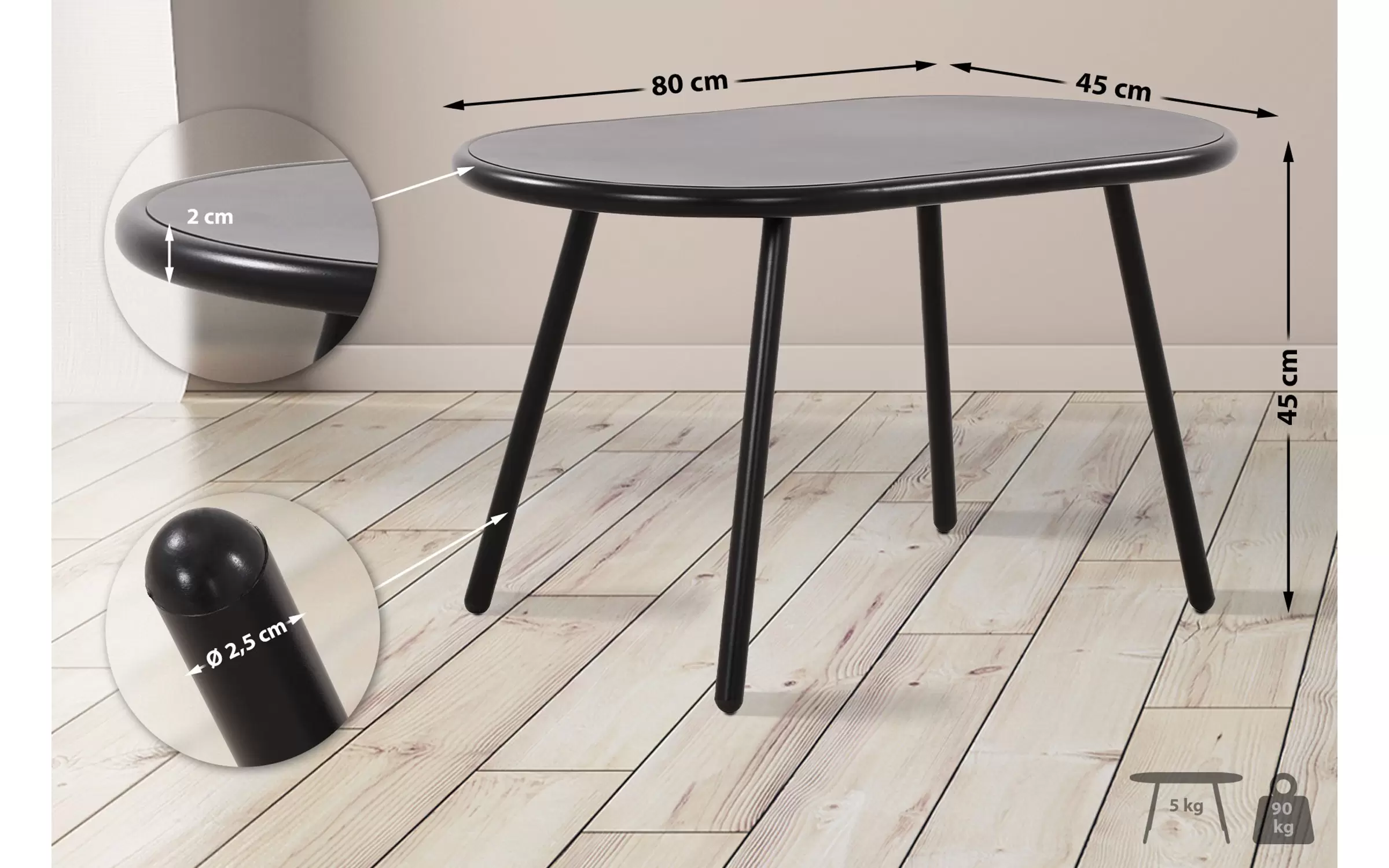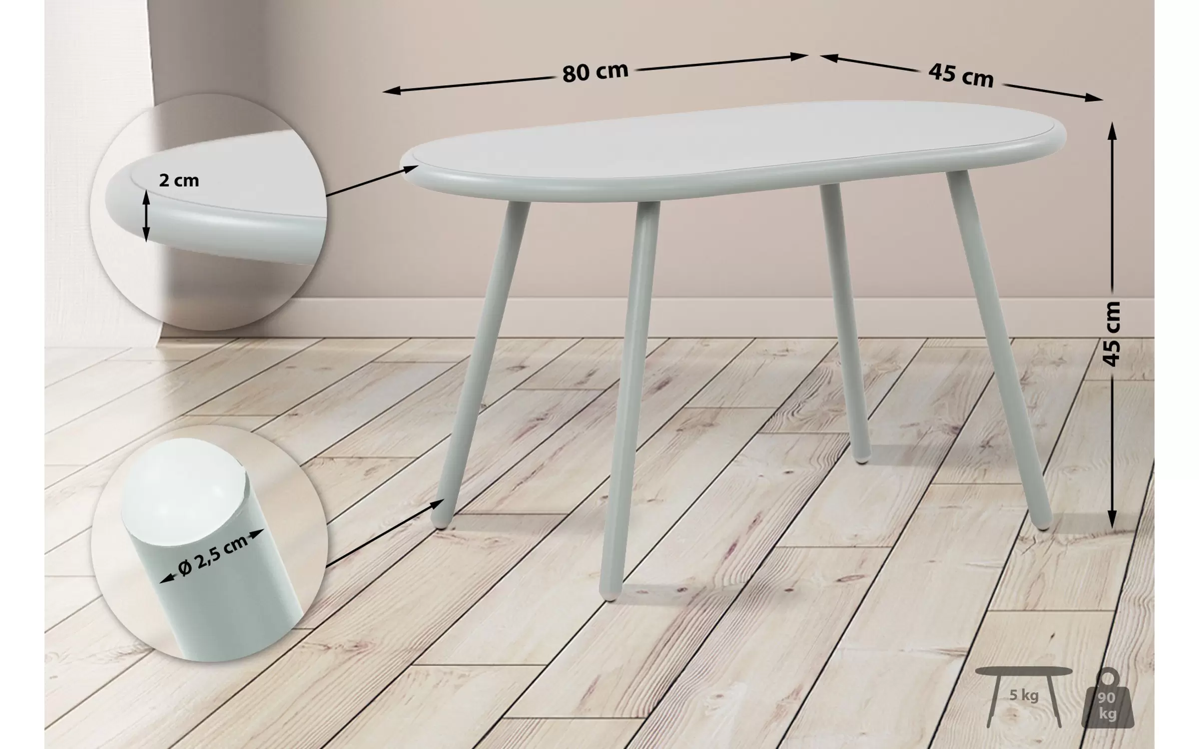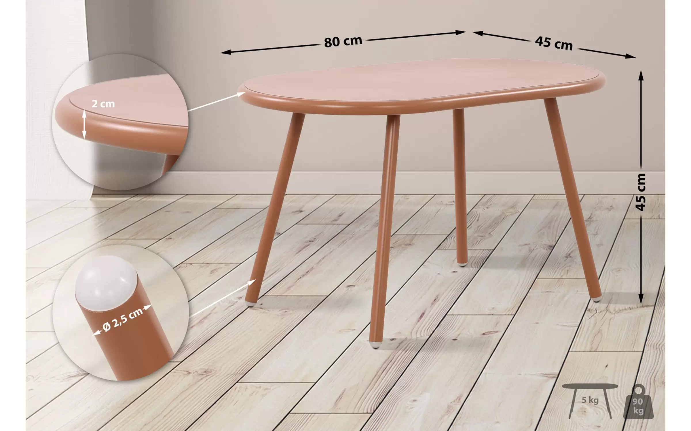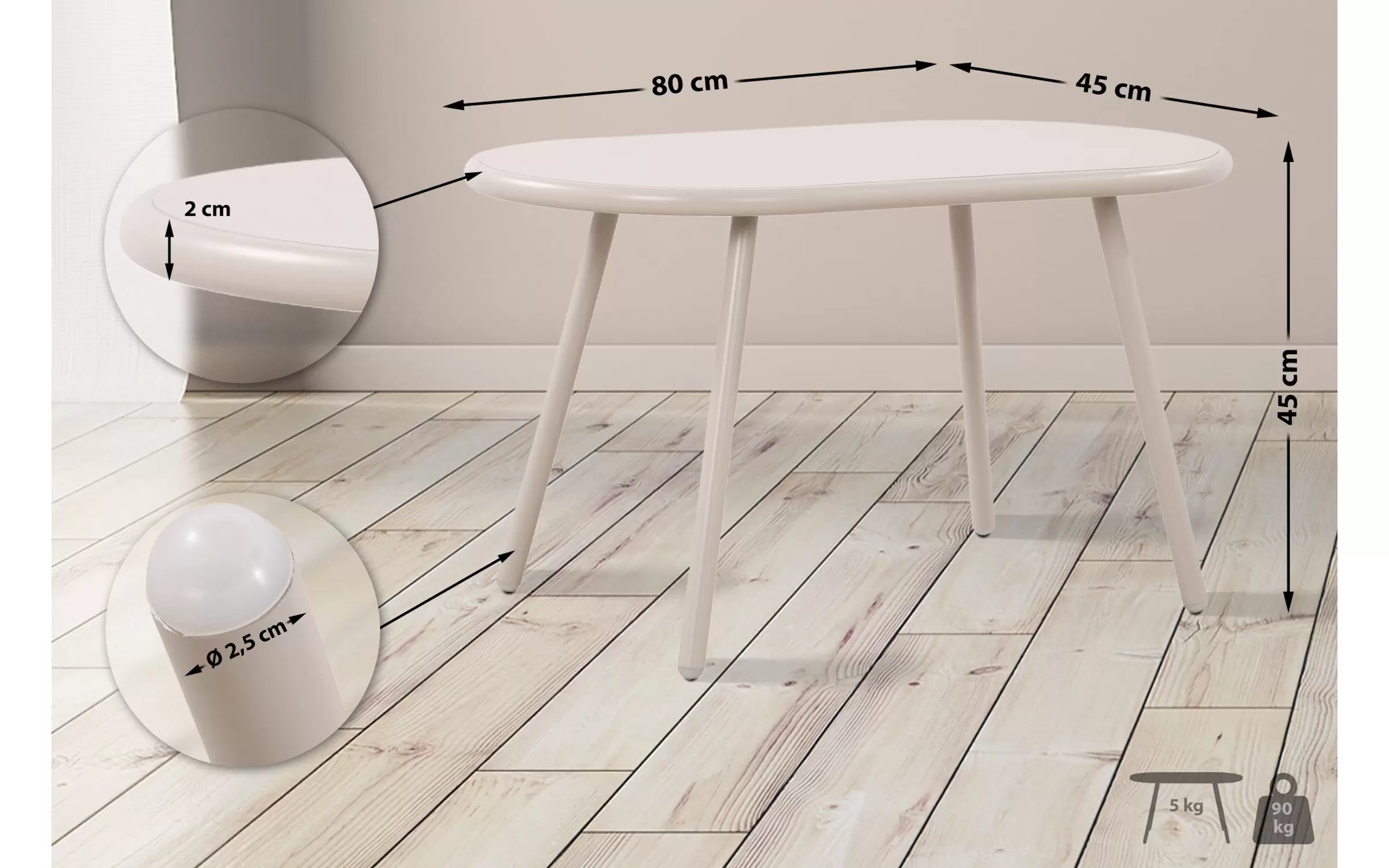 Nogi stołu wykonane są z metalu, który chroniony jest przed korozją dzięki procesowi E-Coating, co sprawia, że jest odporny na rdzewienie.