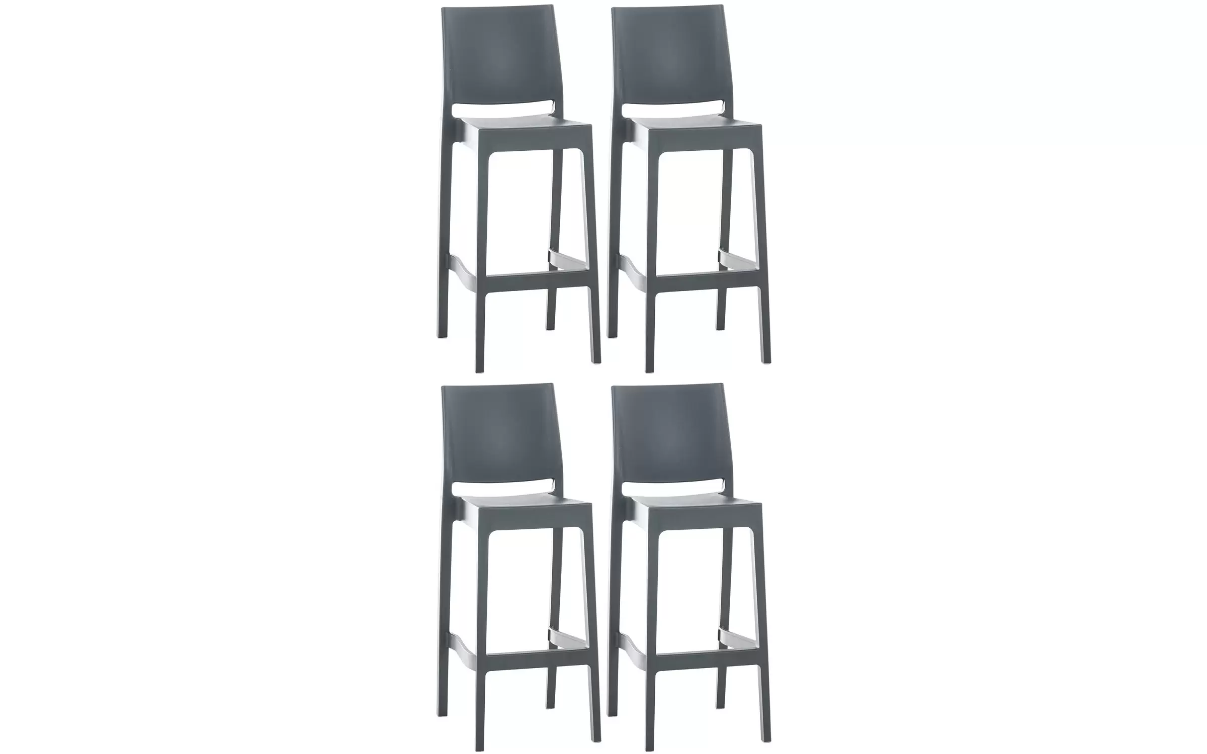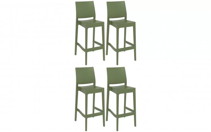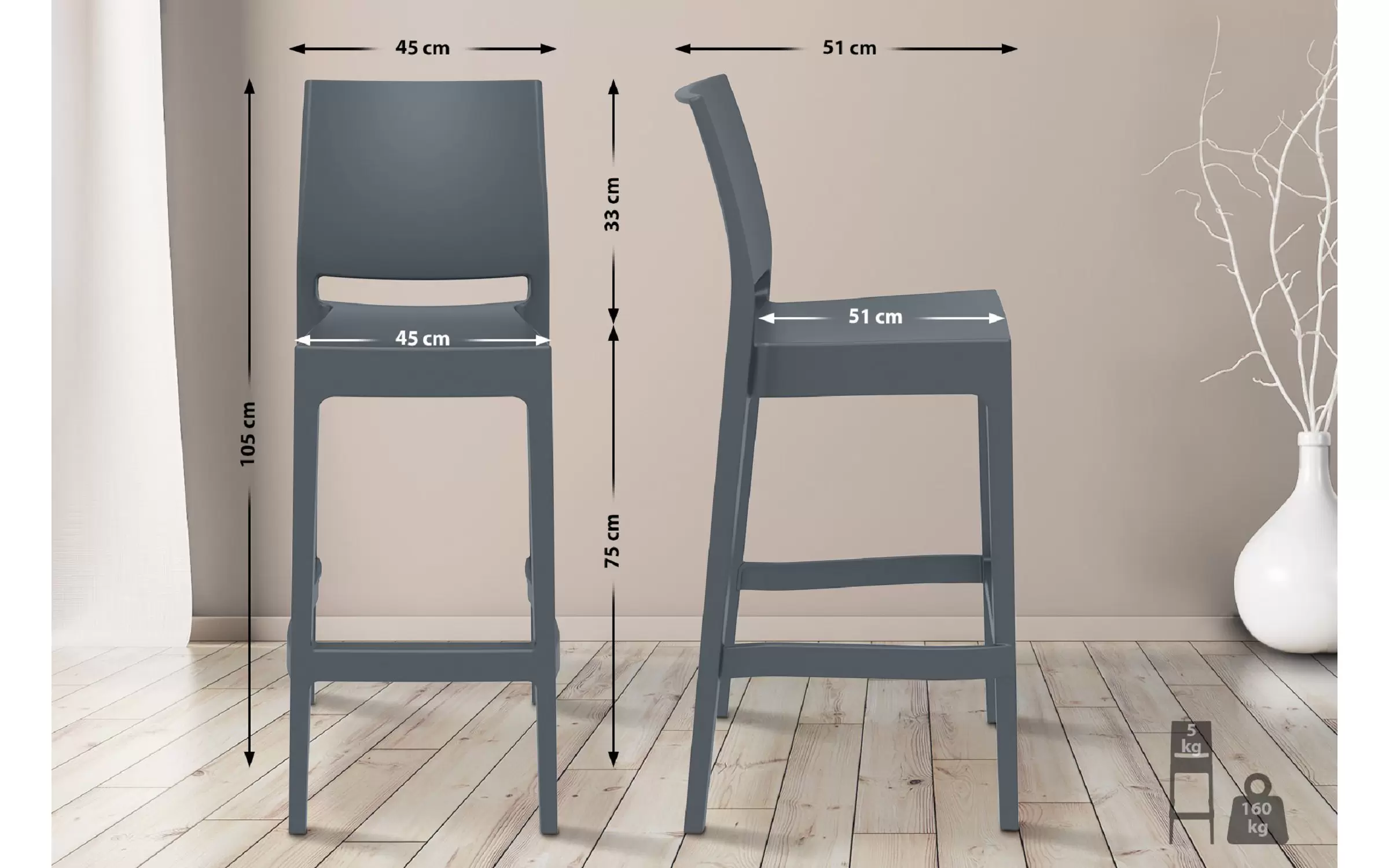 Stołki barowe wykonane są z wodoodpornego i odpornego na promieniowanie UV tworzywa sztucznego, dzięki czemu są całkowicie odporne na warunki atmosferyczne i plamy, brud i wilgoć. Nawet częste i intensywne światło słoneczne nie powoduje żółknięcia i blaknięcia plastiku. Głębia koloru stołków barowych zostaje zachowana na długo. Czteronożna rama posiada poprzeczki, które z jednej strony zapewniają stabilność, a z drugiej mogą pełnić funkcję podnóżka.