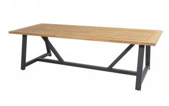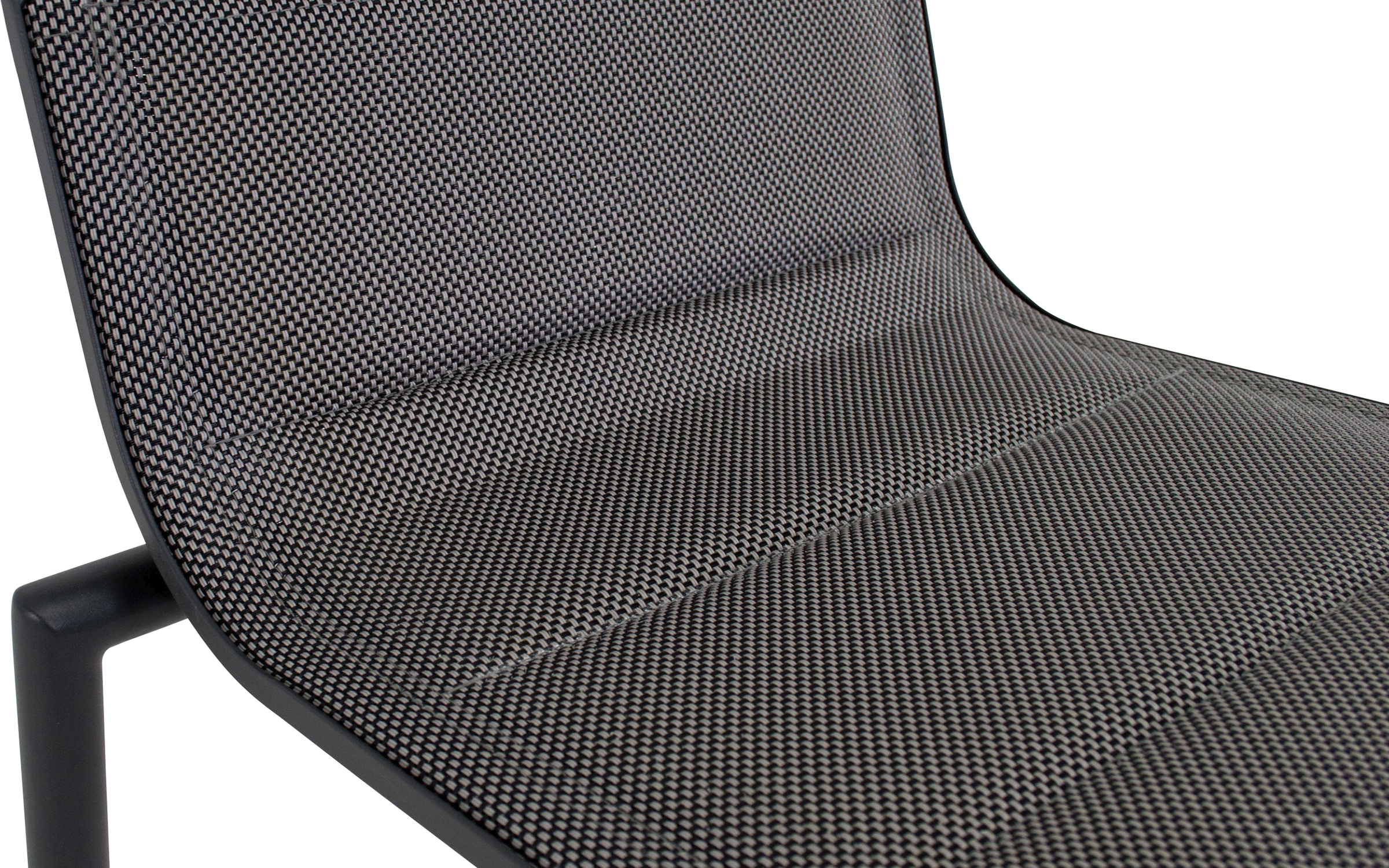 Rama z aluminium malowanego proszkowo w odcieniu matowego antracytu gwarantuje trwałość i odporność na czynniki atmosferyczne, a siedzisko z czarno‑szarej tekstyliny płynnie łączy się z niskim oparciem, nadając całości lekkości i nowoczesnego charakteru. Komfort użytkowania podnosi praktyczny podnóżek, a cztery stabilne nogi zapewniają pewne podparcie.