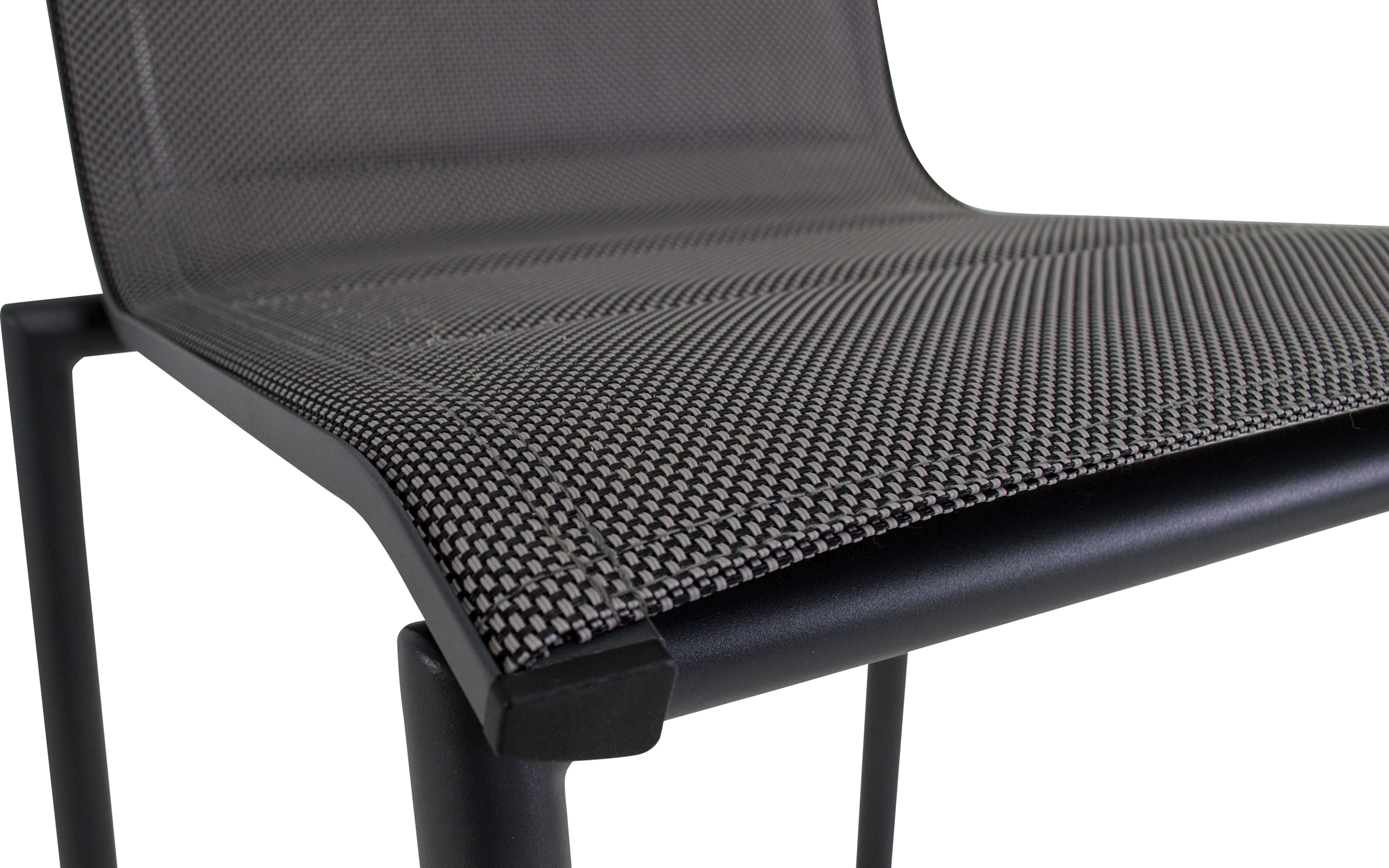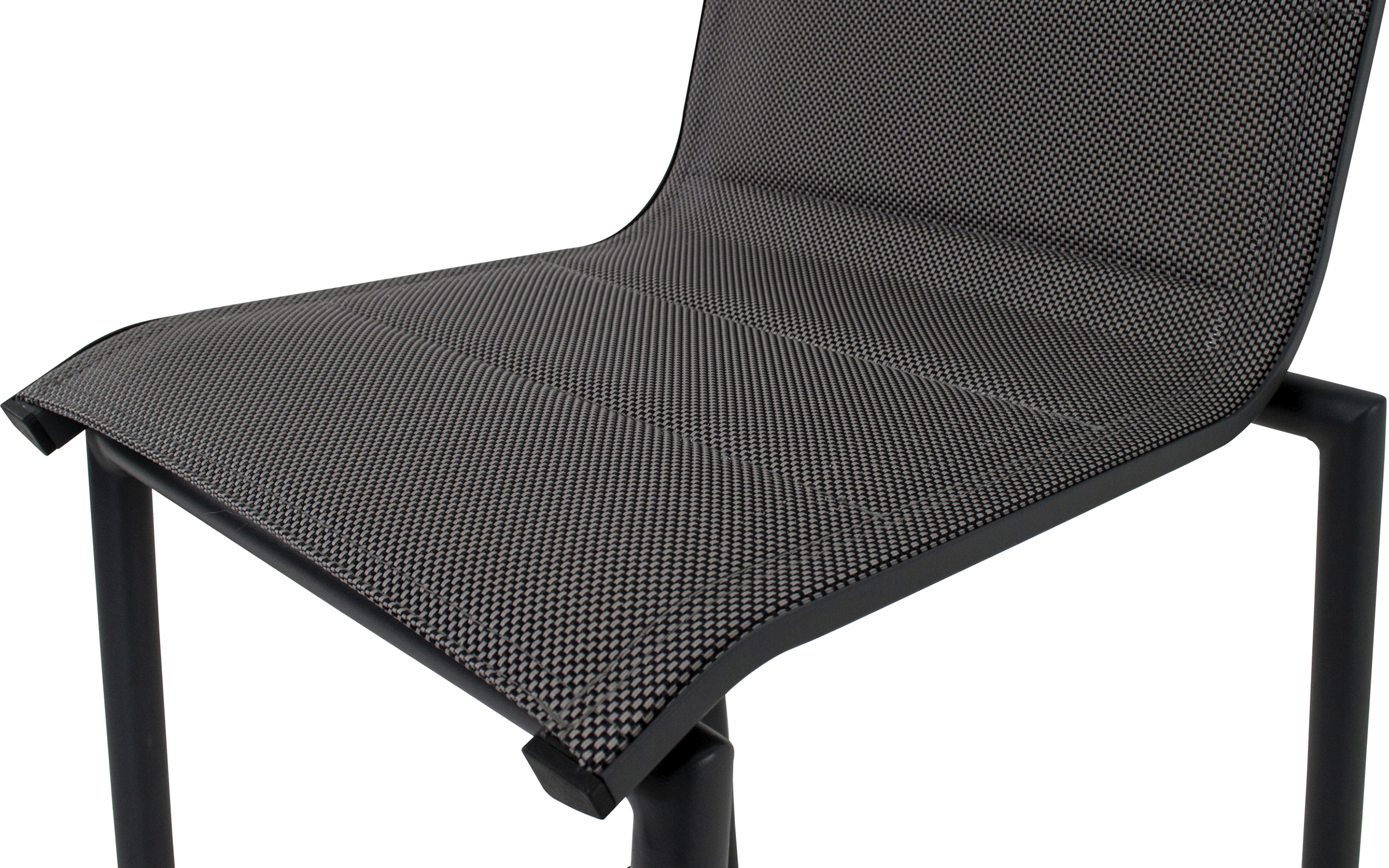 Siedzisko i oparcie: tekstylina czarno-szare, wytrzymała tkanina odporna na UV i wilgoć.