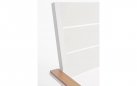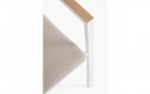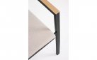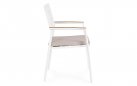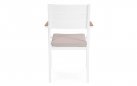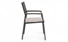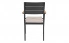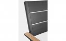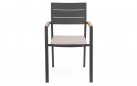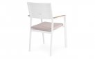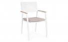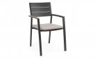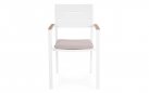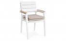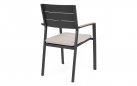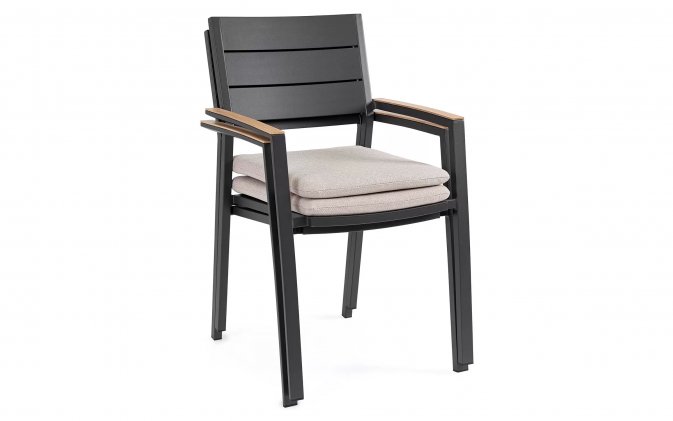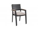 Aluminiowe krzesło ogrodowe z poduszką z podłokietnikami pokrytymi powłoką imitującą drewno. Można układać w stos w celu łatwiejszego przechowywania.