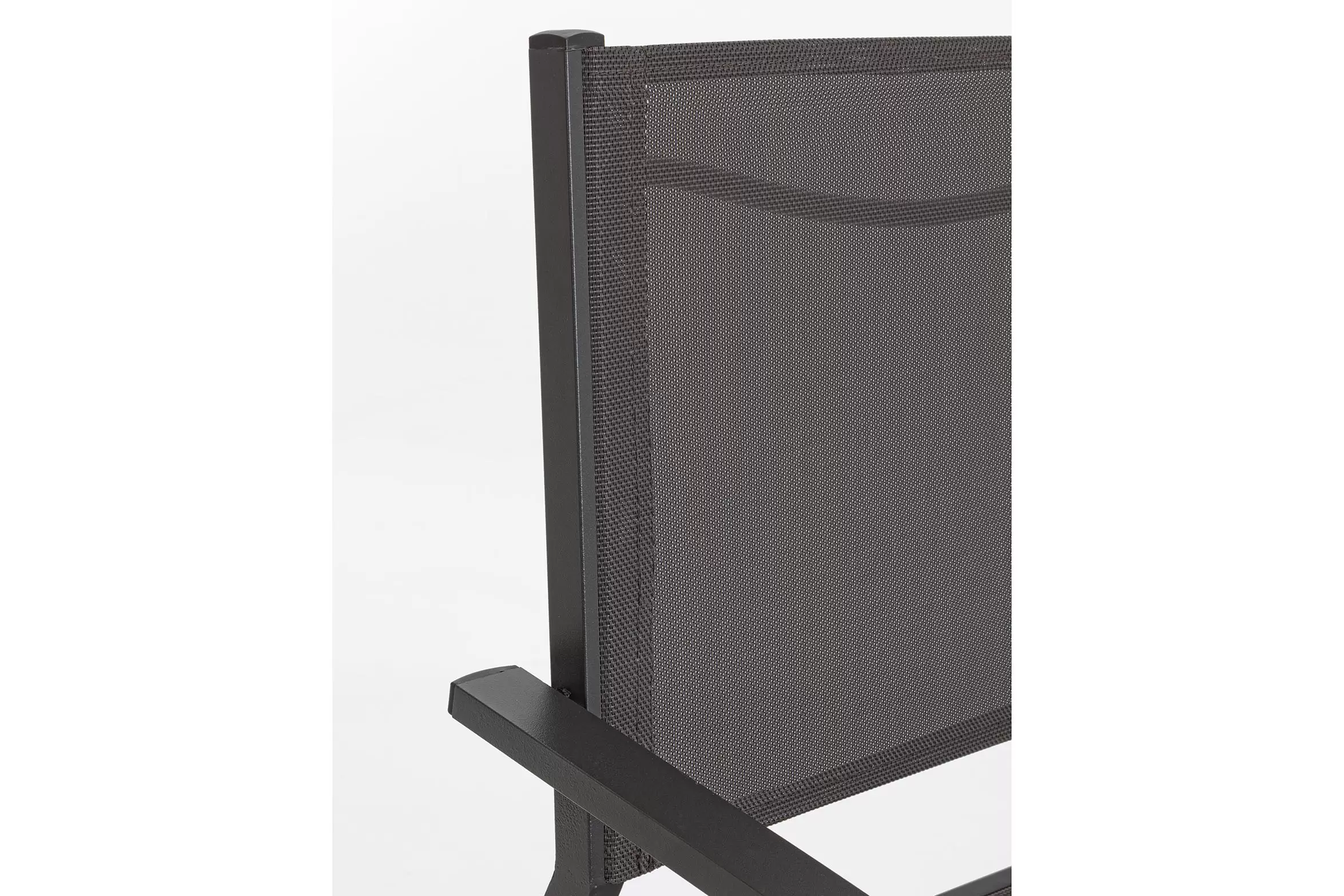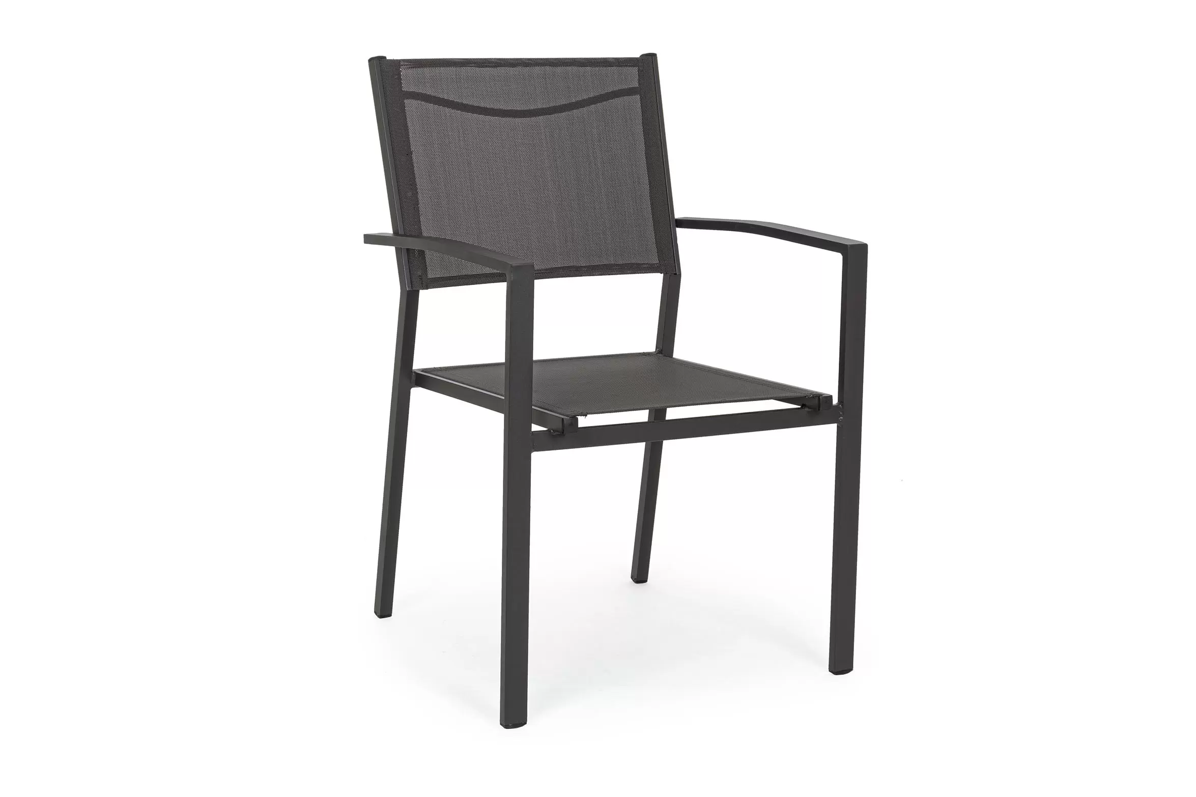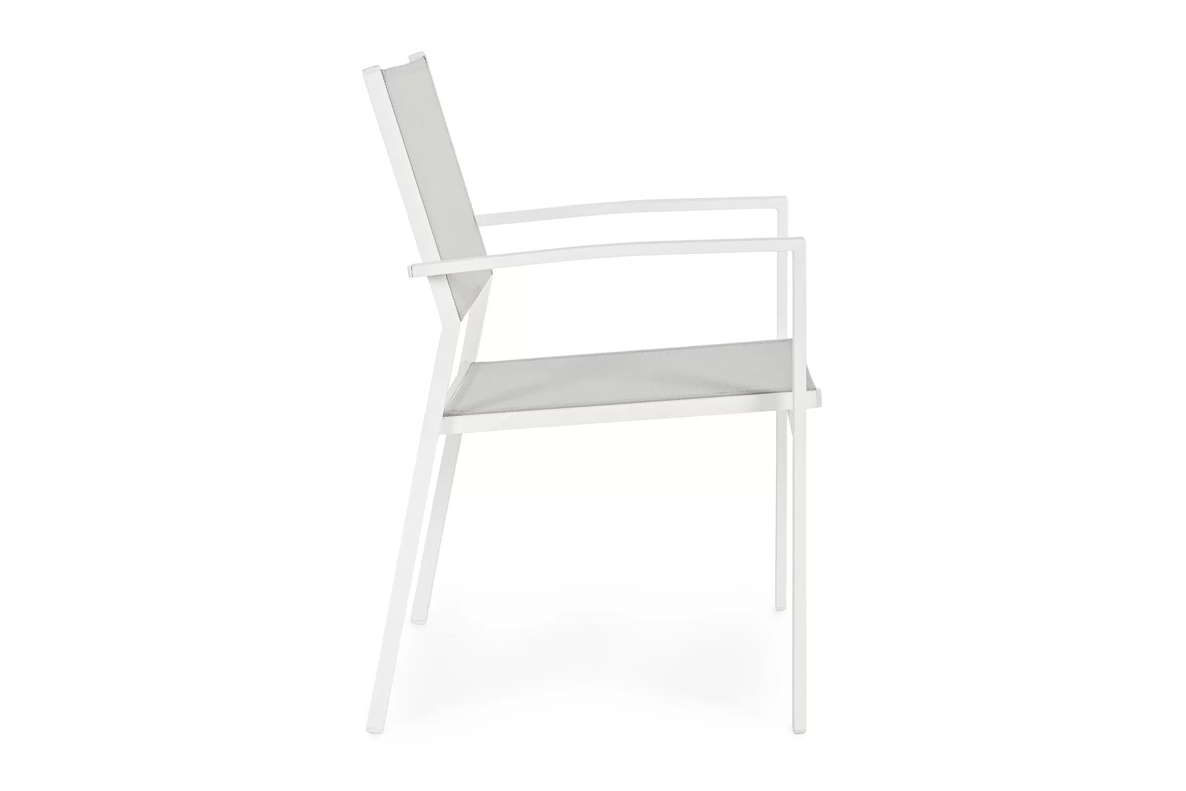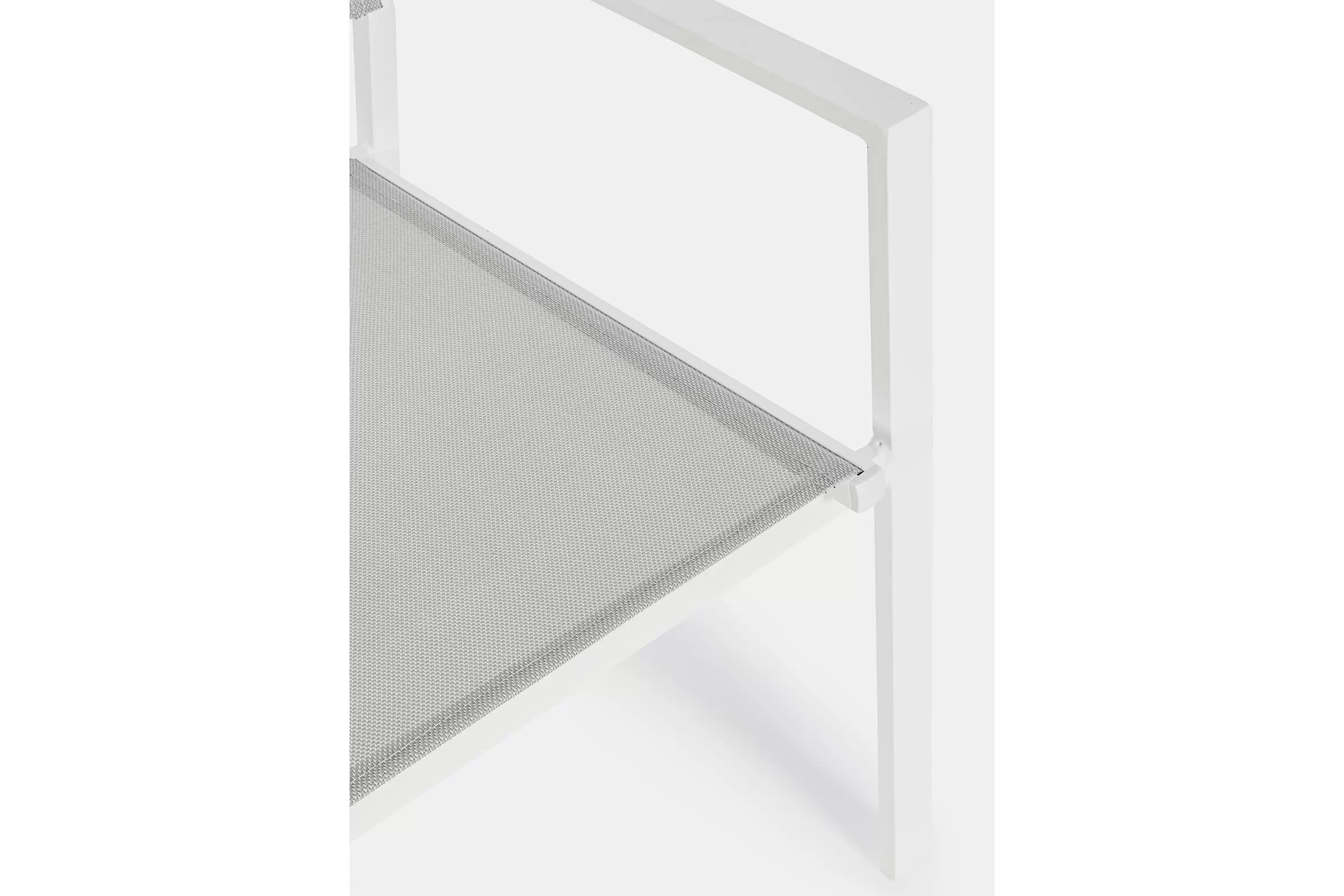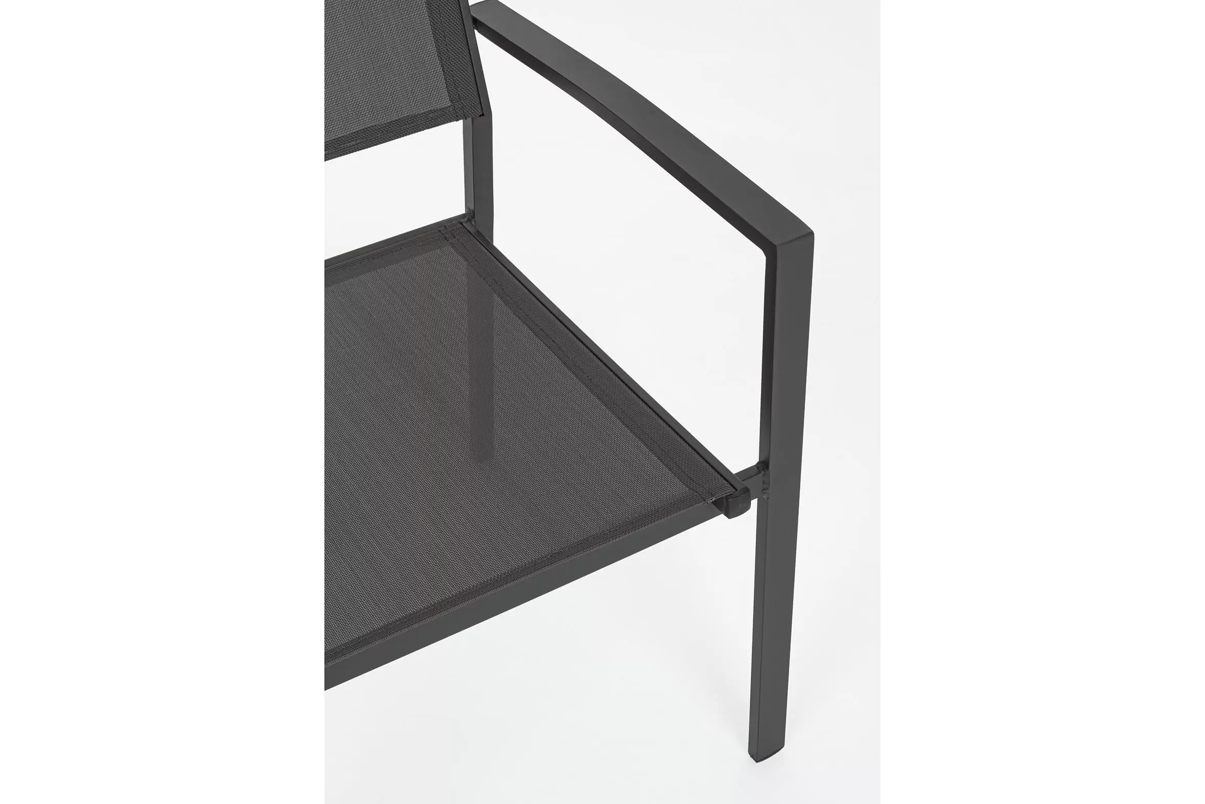 Lekkie aluminiowe krzesło z podłokietnikami z siedziskiem z tekstyliny. Sztaplowane.