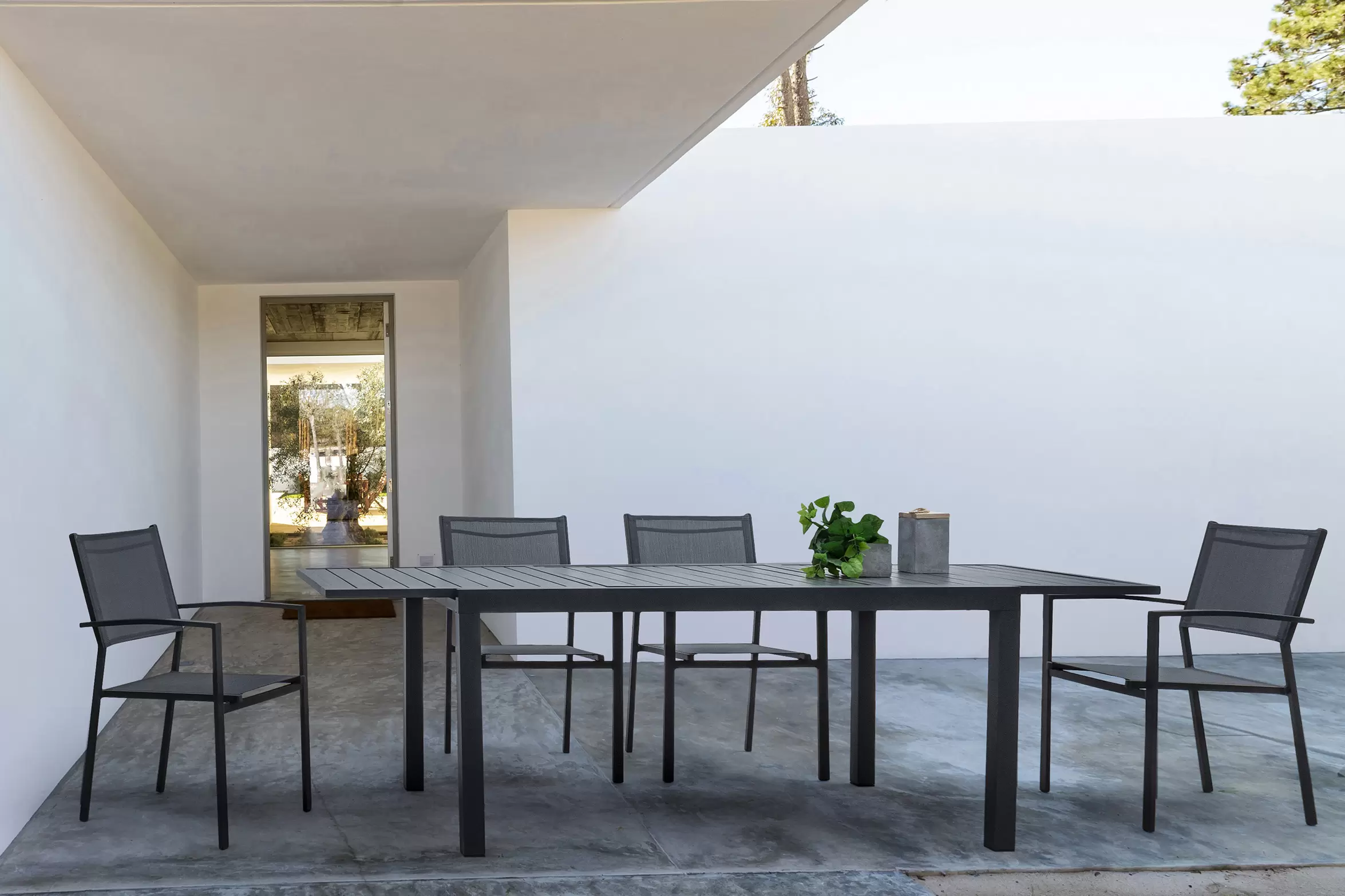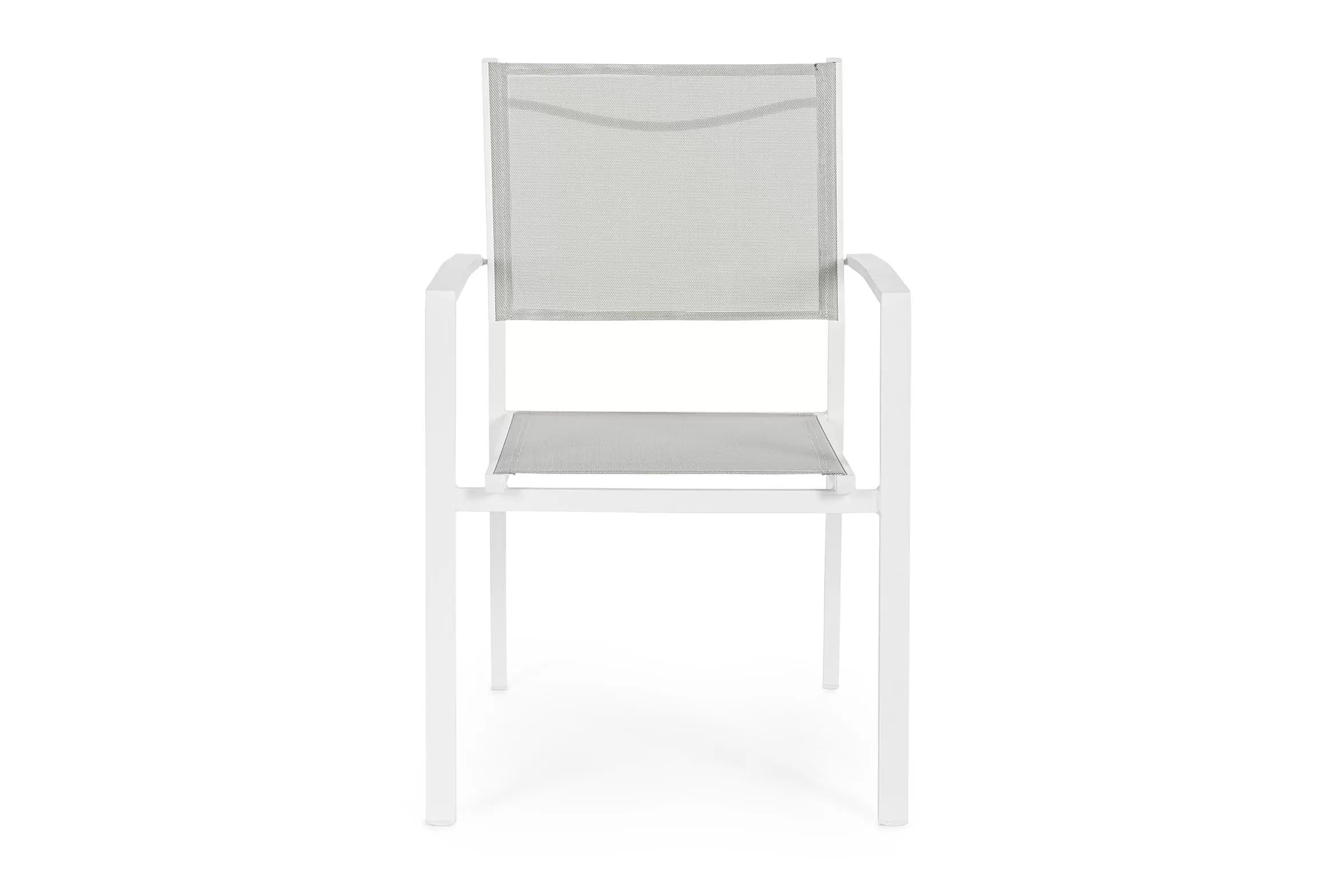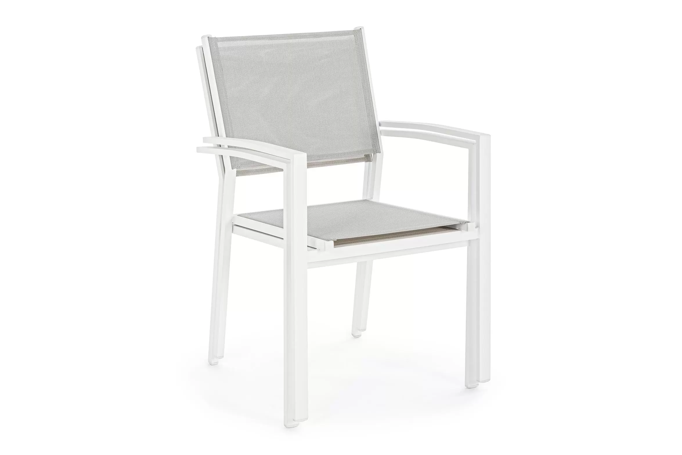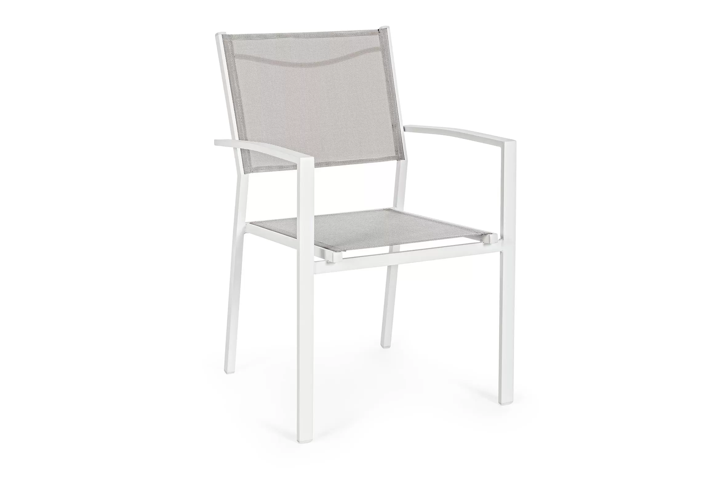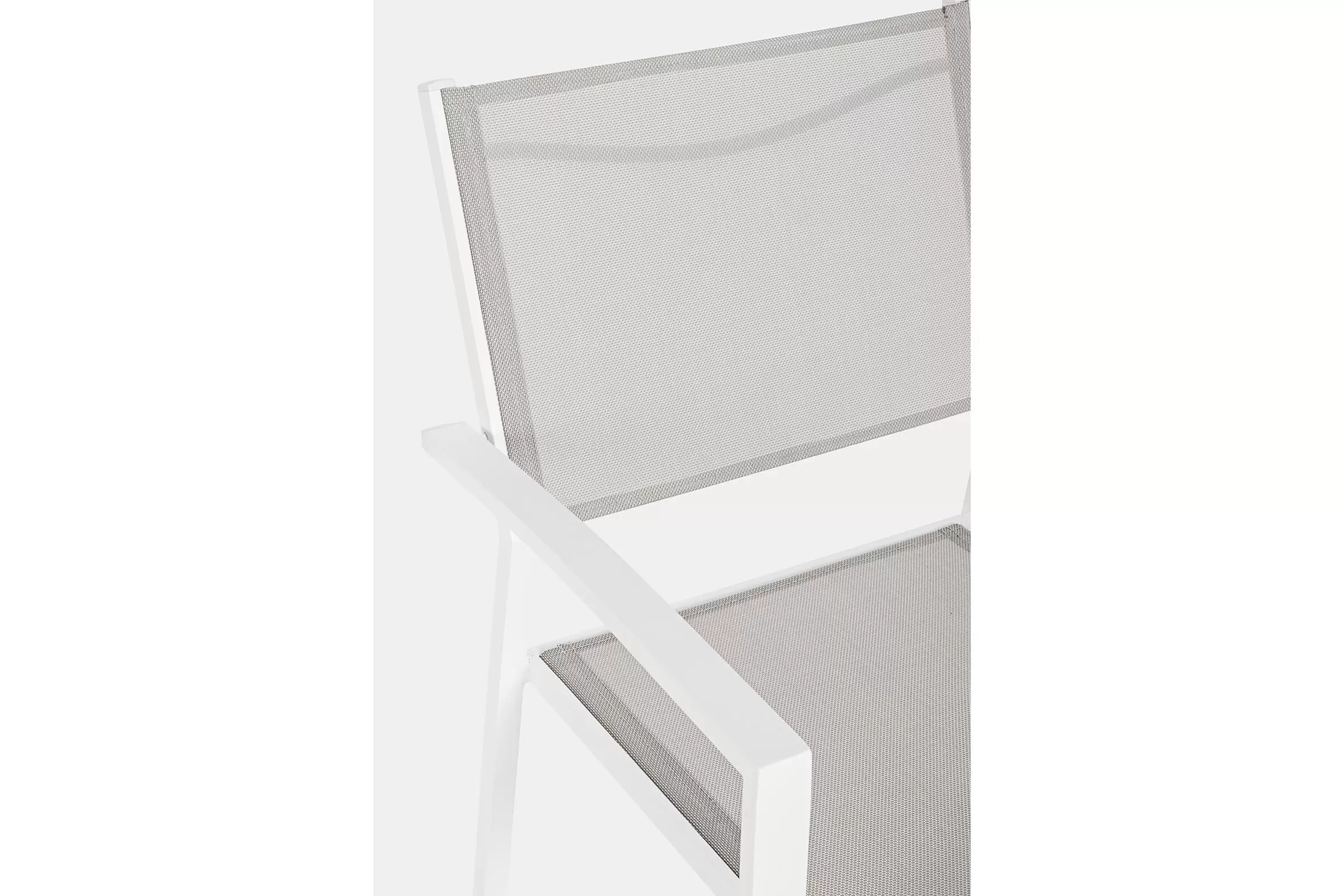 Lekkie aluminiowe krzesło z podłokietnikami z siedziskiem z tekstyliny. Sztaplowane.