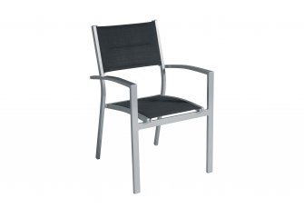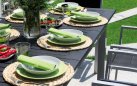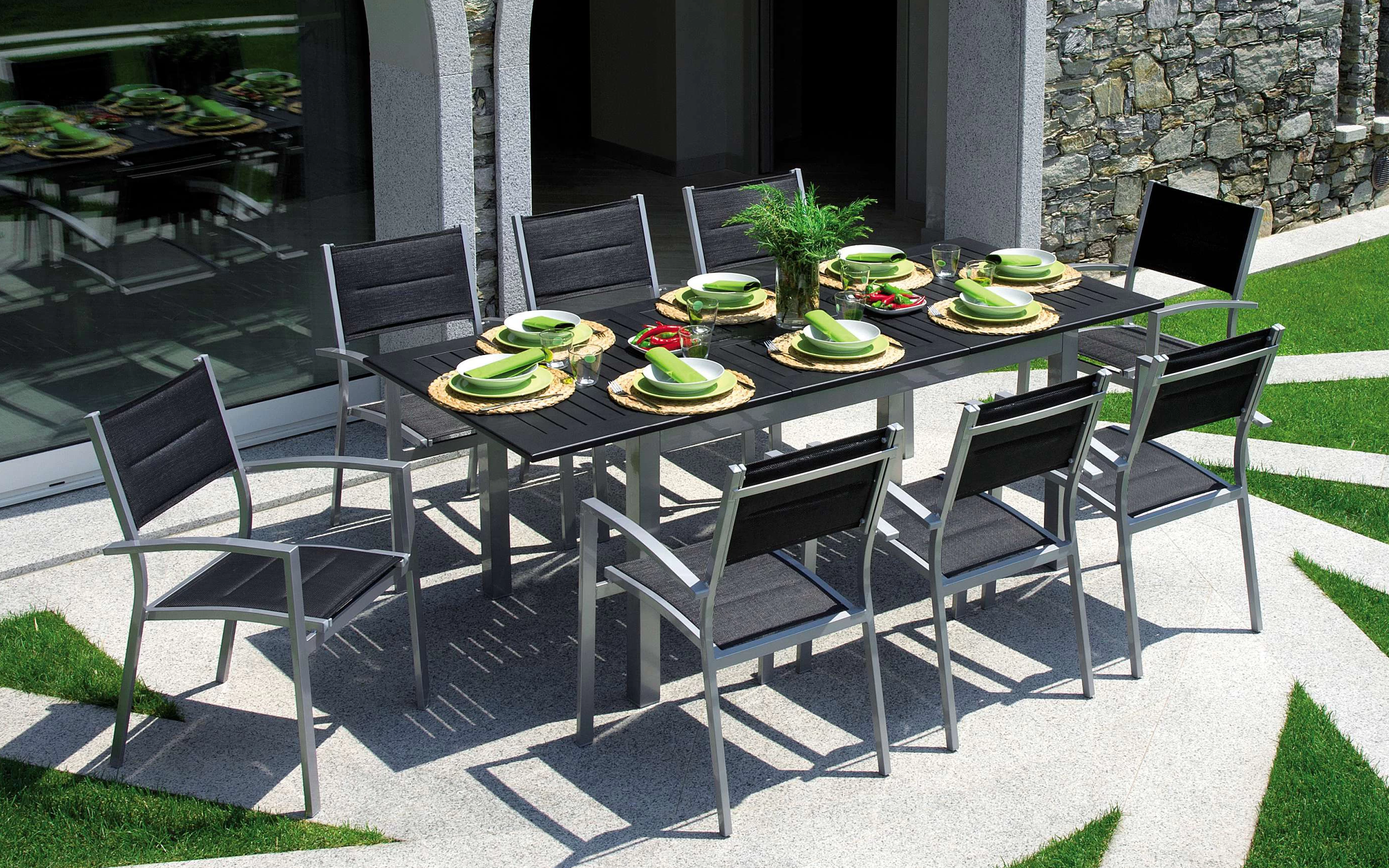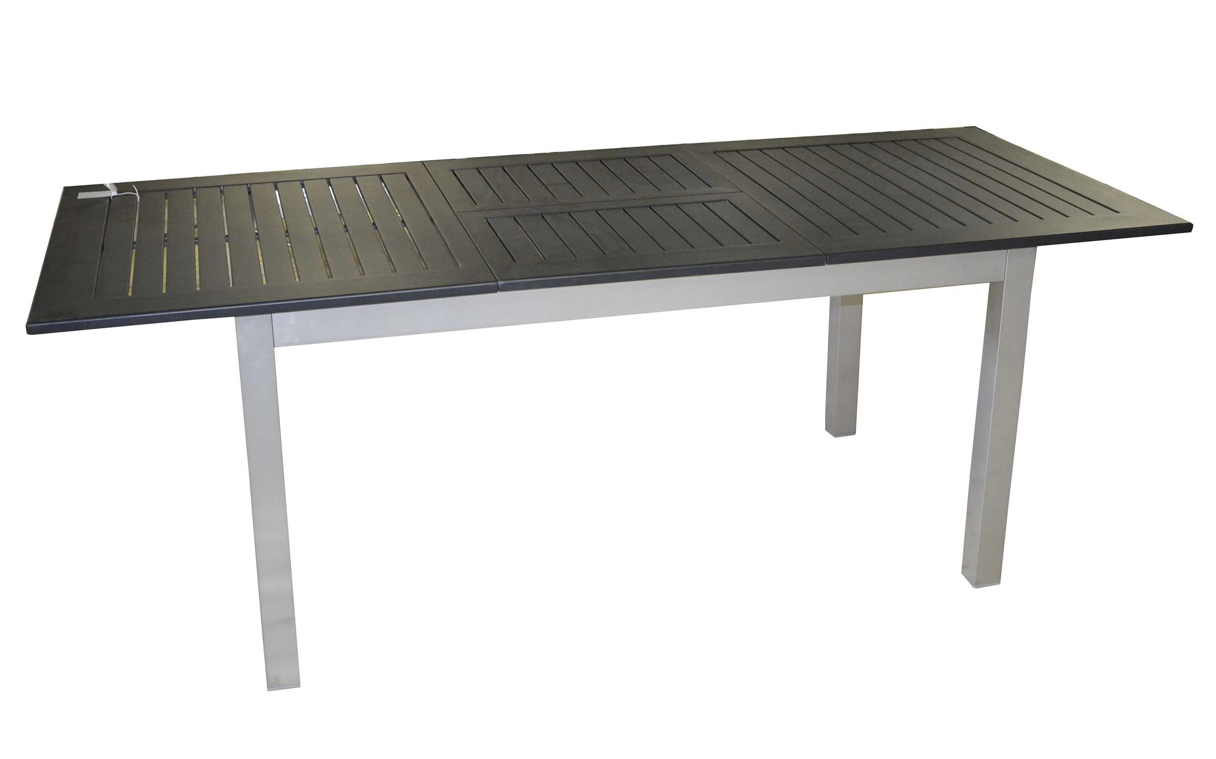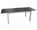 Stół obiadowy na nowoczesny taras. Nogi z satynowanego aluminium. Blat stołu aluminiowy malowany proszkowo na kolor czarny z system motylkowym wydłużania blatu.