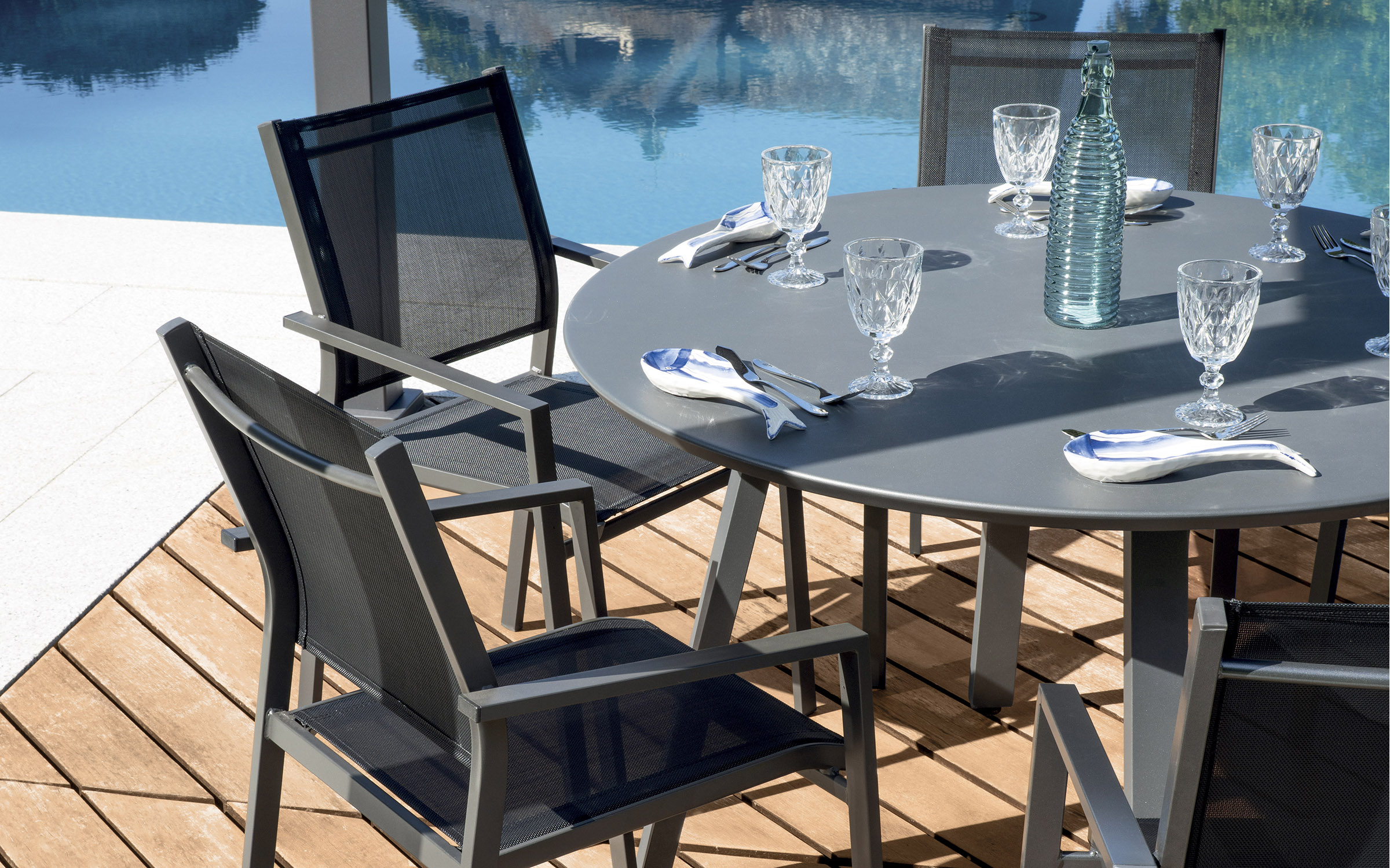 Elegancki okrągły stół ogrodowy o średnicy 120 cm, wykonany w całości z aluminium malowanego proszkowo. Idealny do użytku zewnętrznego – na taras, balkon lub do ogrodu. Stabilna konstrukcja i nowoczesny design. Dostępny w dwóch wersjach kolorystycznych: