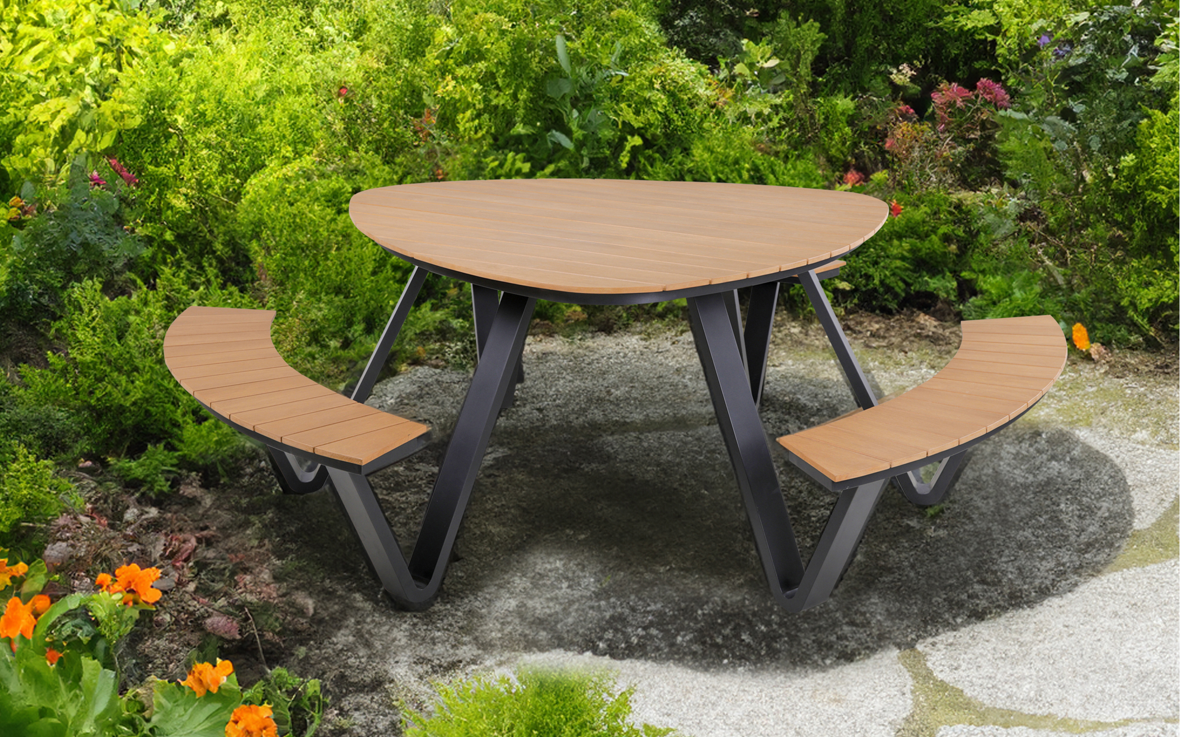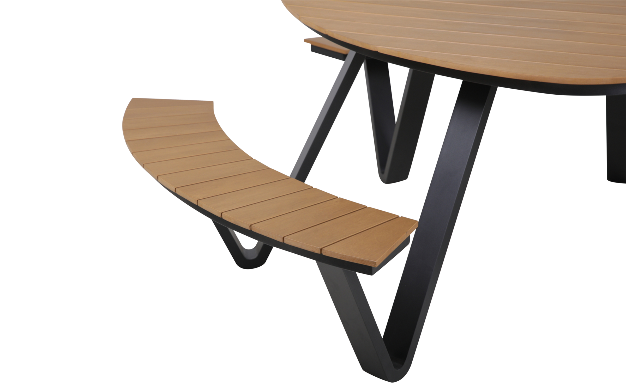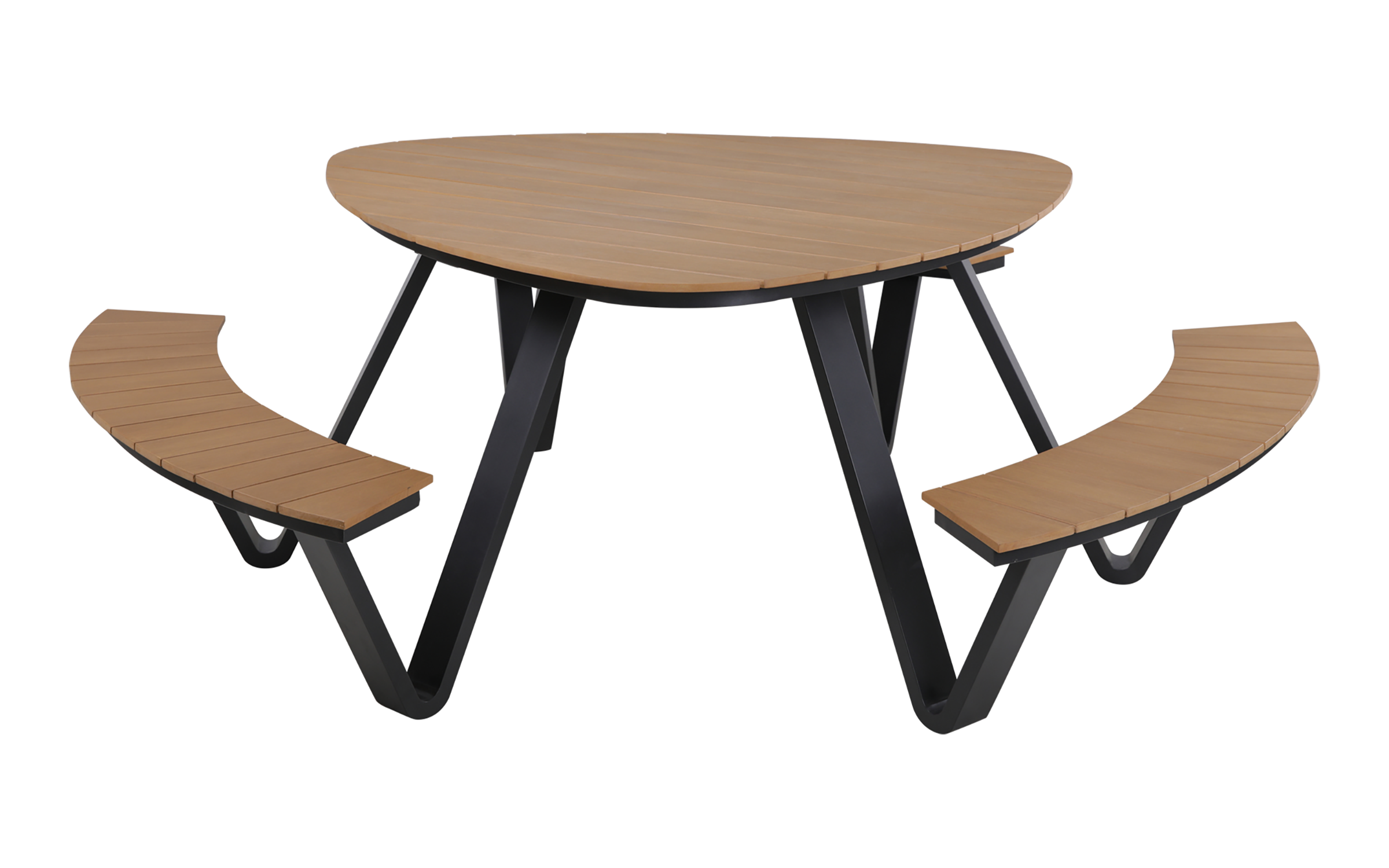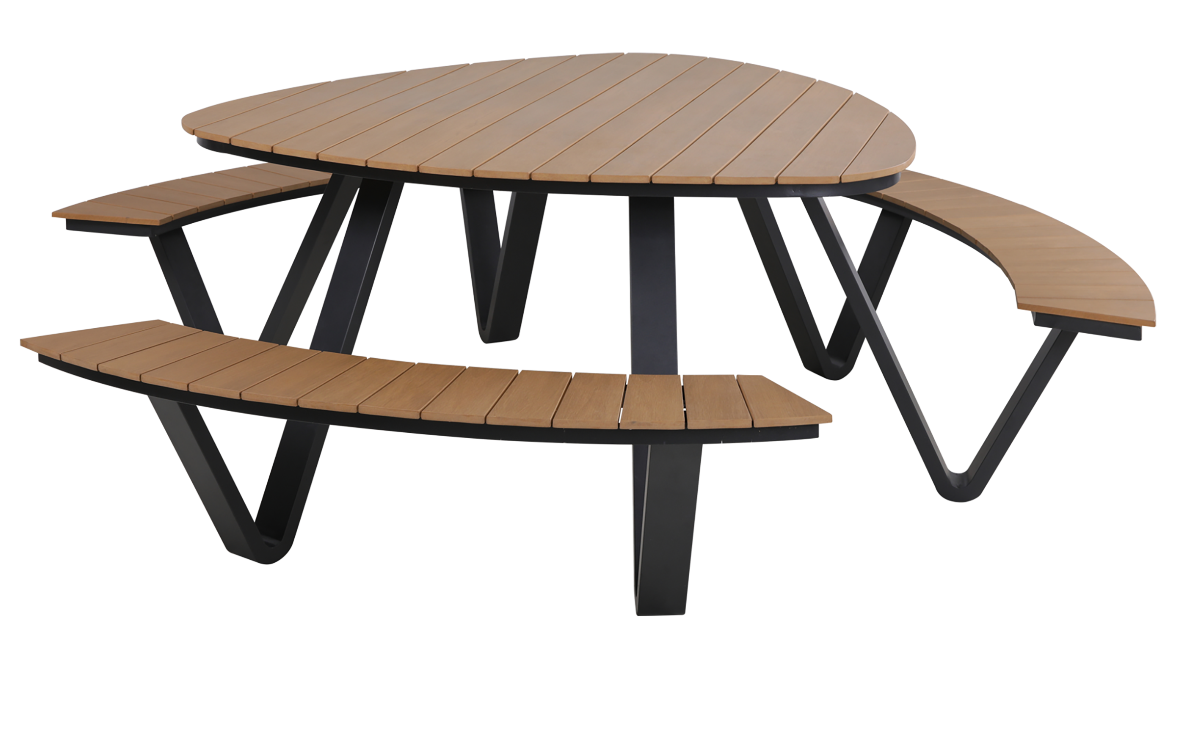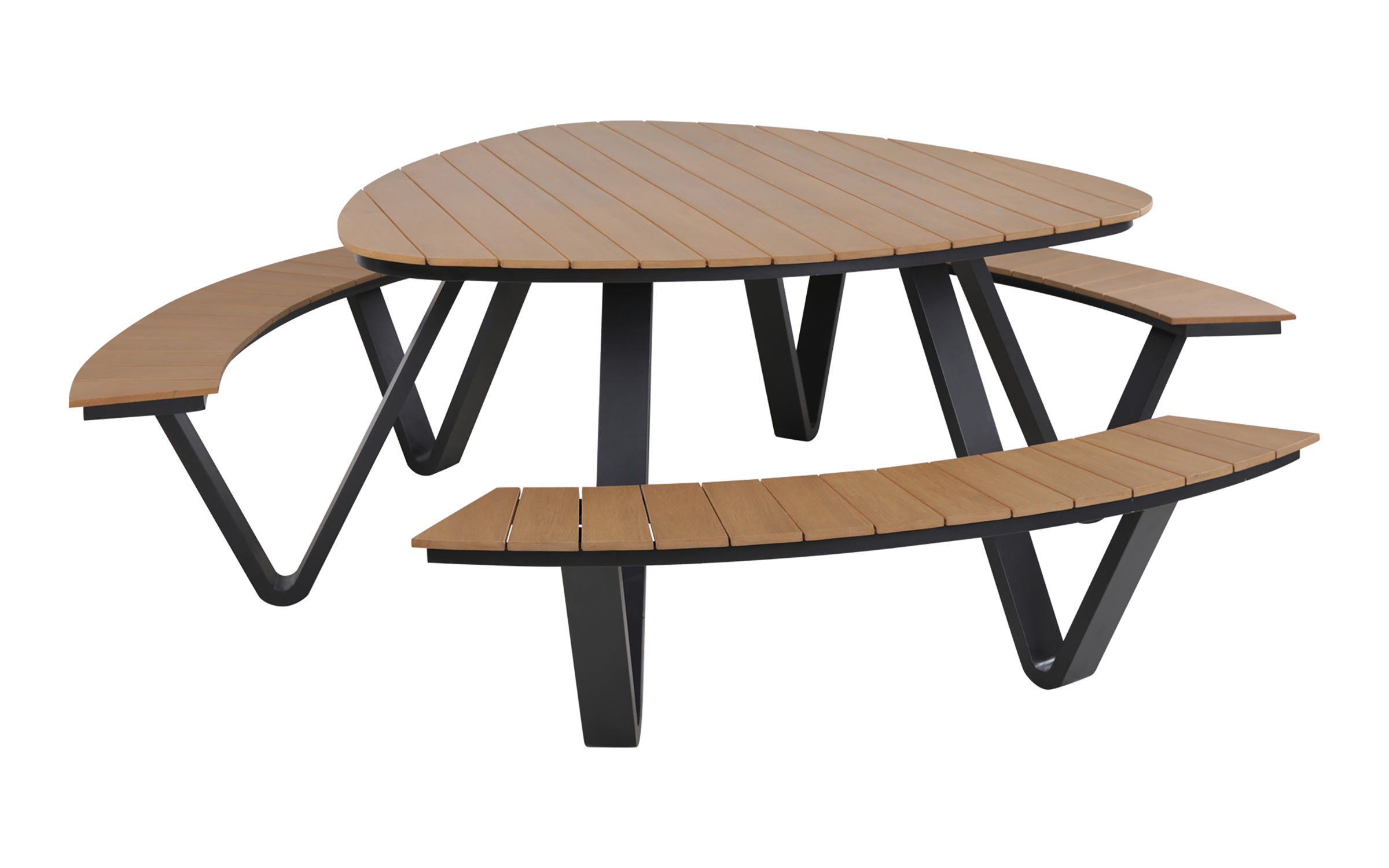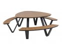 Aluminiowy zestaw obiadowy piknikowy ze zintegrowanymi ławkami. Blaty o wyglądzie drewna teakowego.