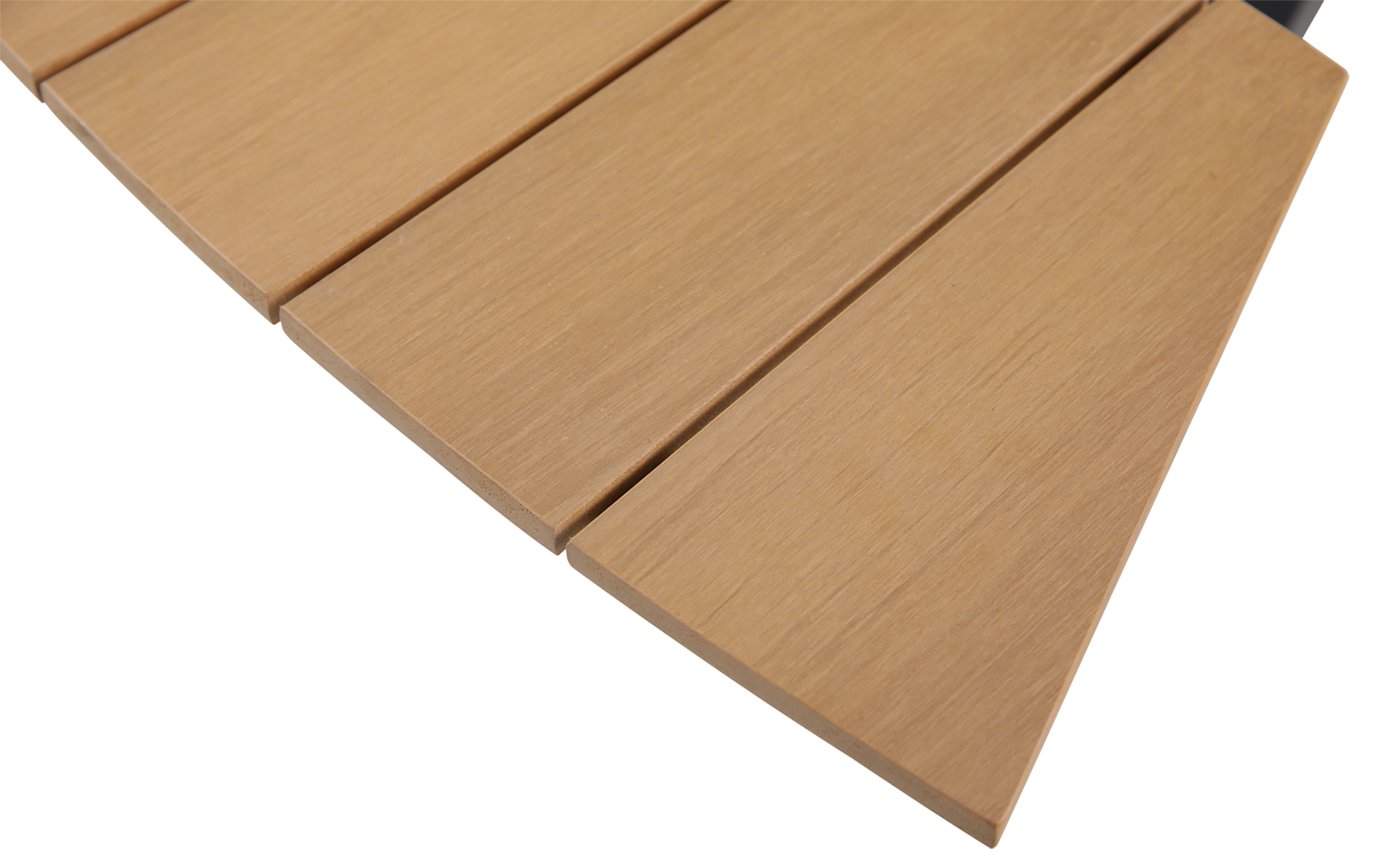 Blat stołu ogrodowego i ławki z kompozytu drewnianego o wyglądzie drewna teakowego.