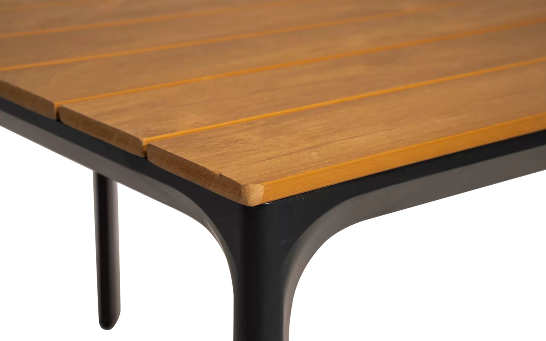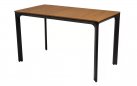Aluminiowy stół obiadowy prostokątny z ciemnoszarymi nogami. Blat kompozytowy o wyglądzie drewna teakowego.