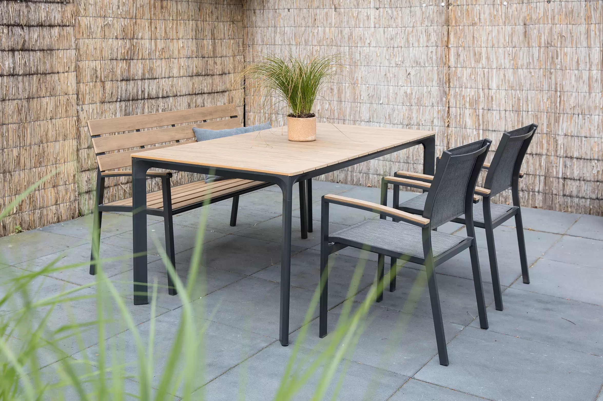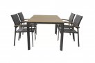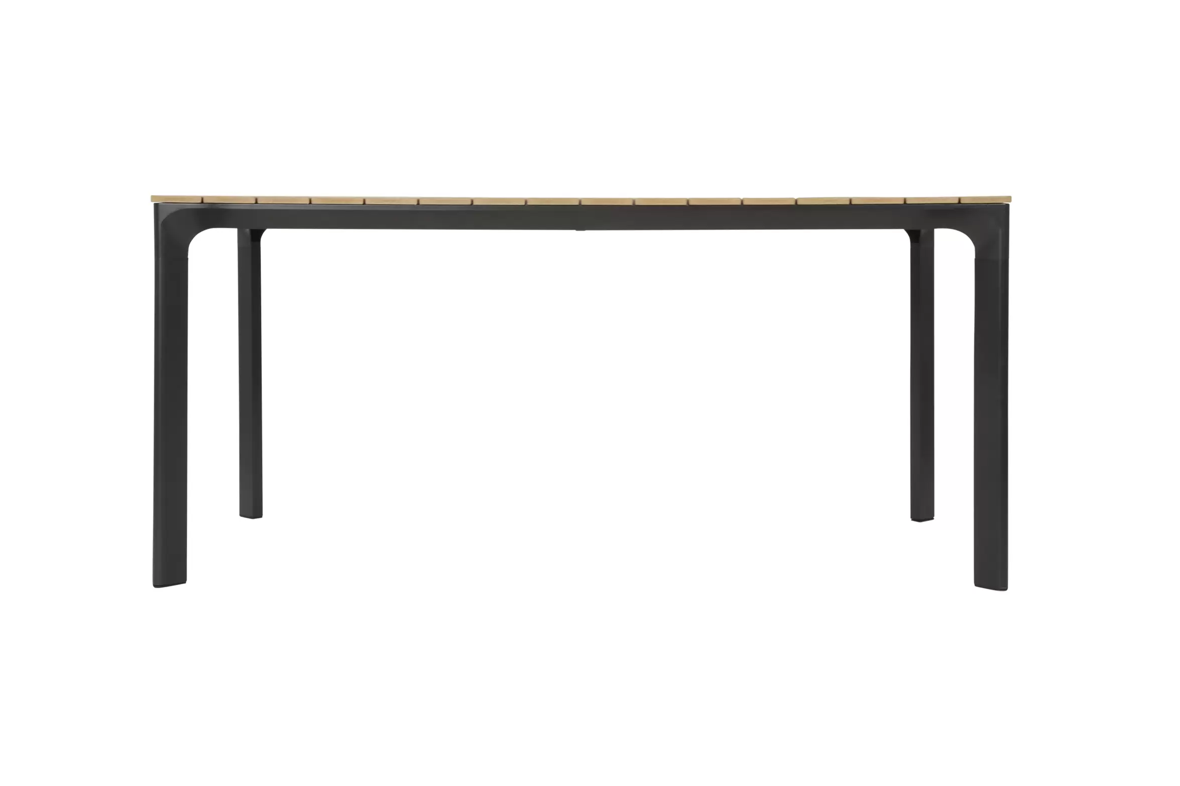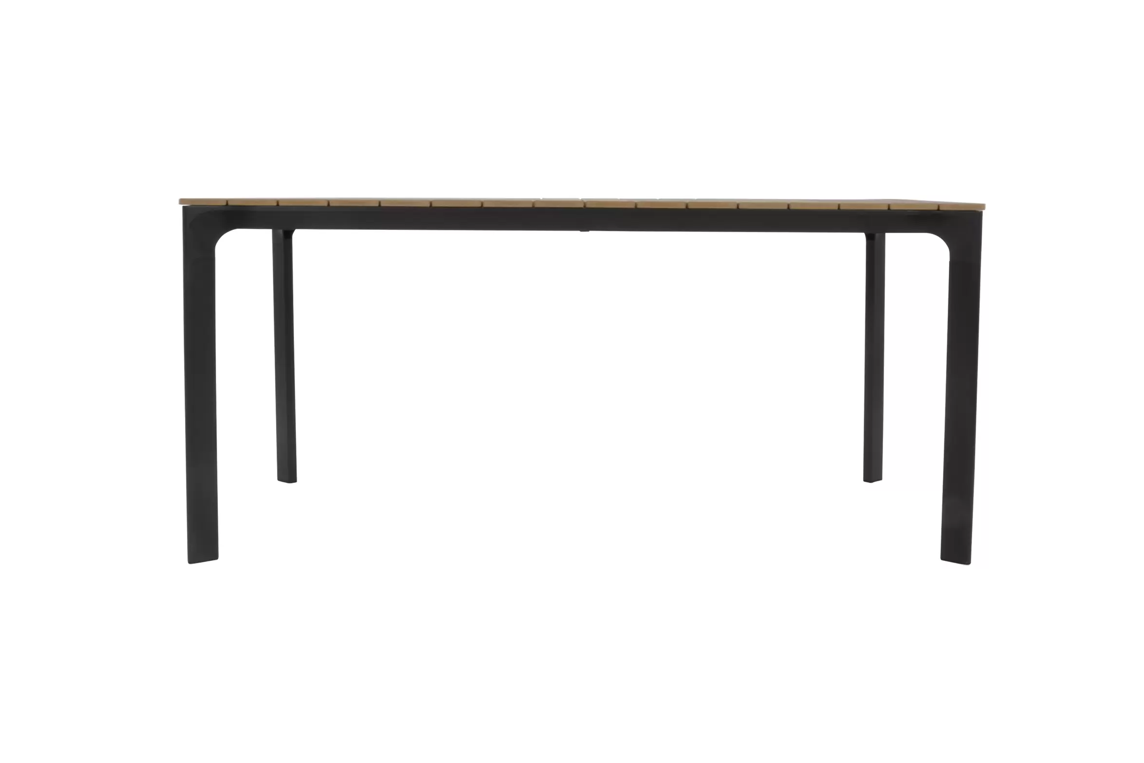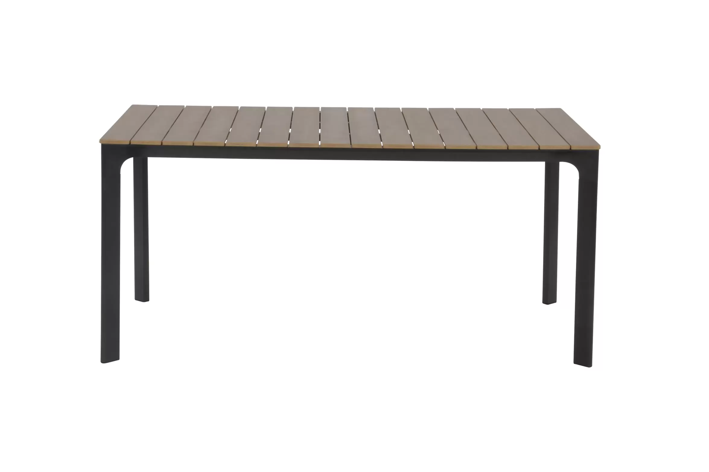 Aluminiowy stół obiadowy prostokątny ciemnoszary. Blat kompozytowy o wyglądzie drewna teakowego.