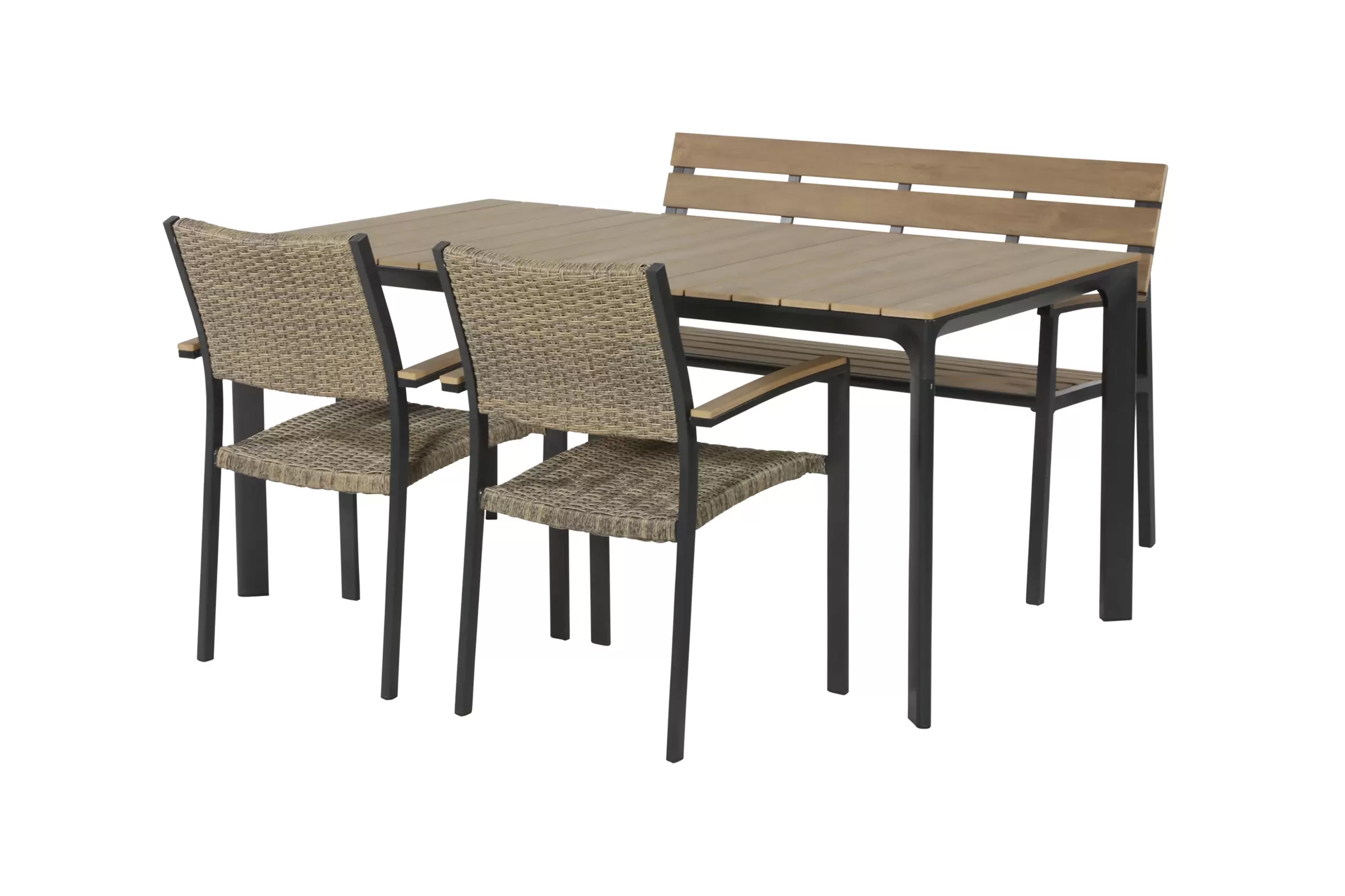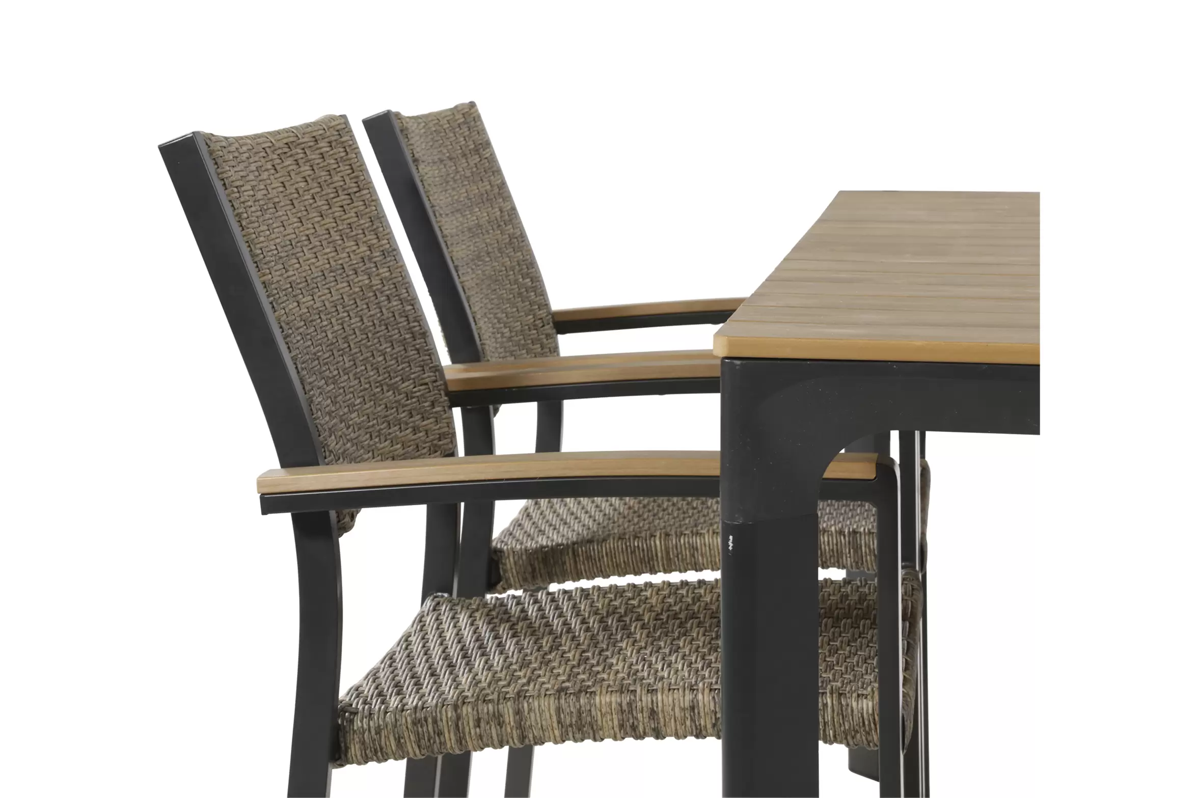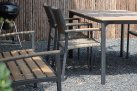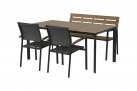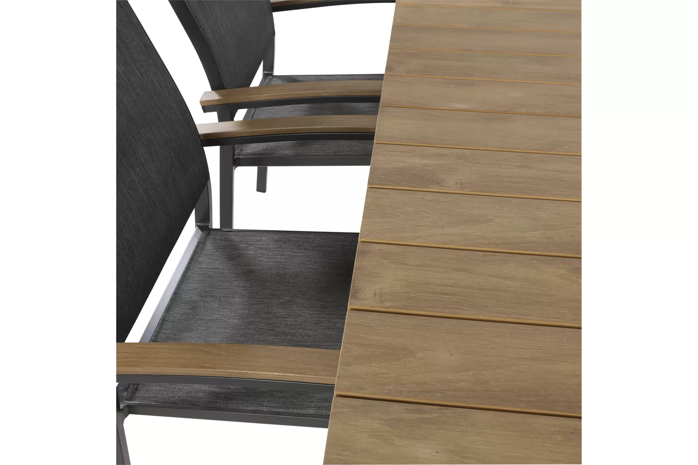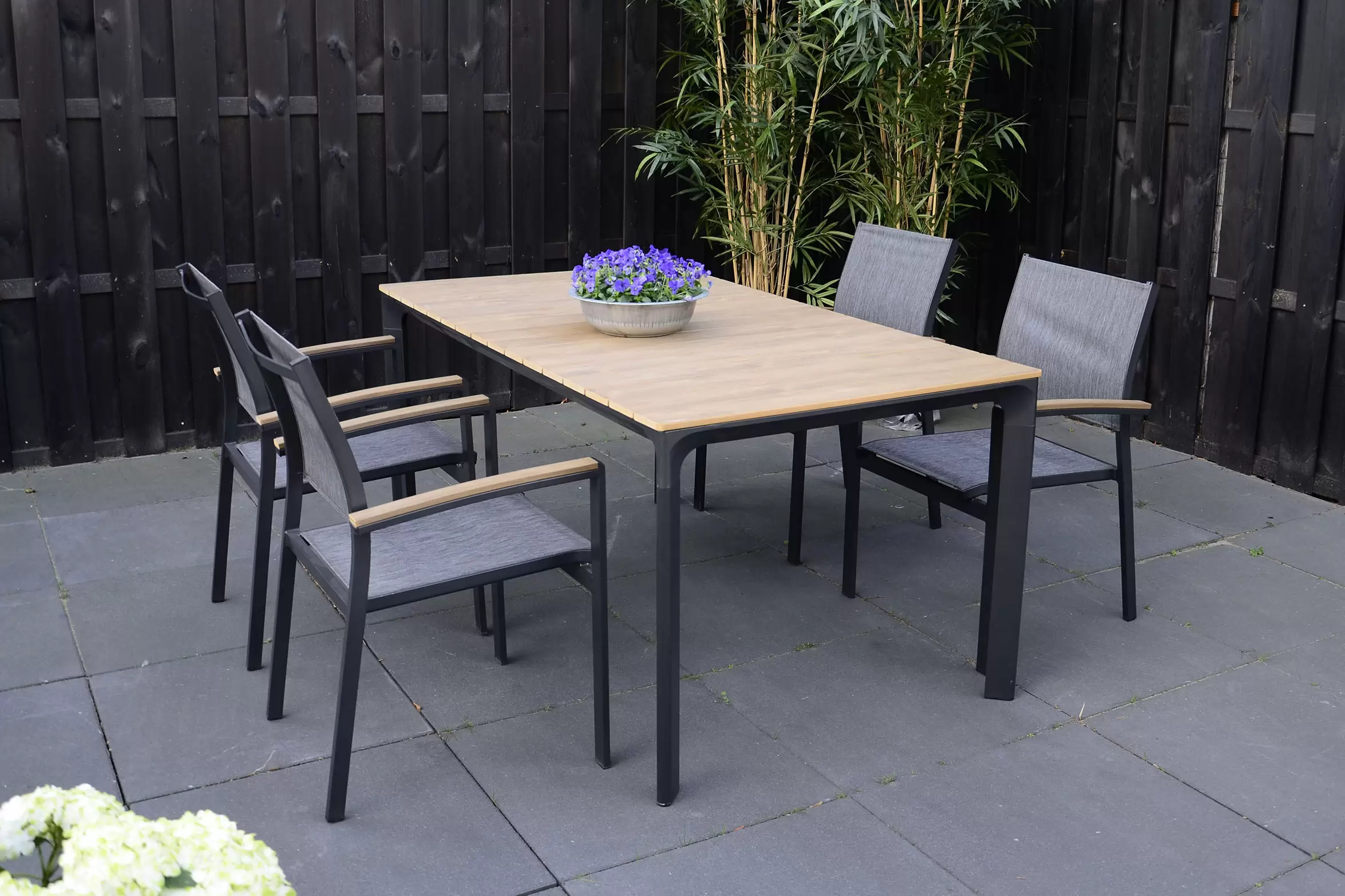 Aluminiowy stół obiadowy prostokątny ciemnoszary. Blat kompozytowy o wyglądzie drewna teakowego.