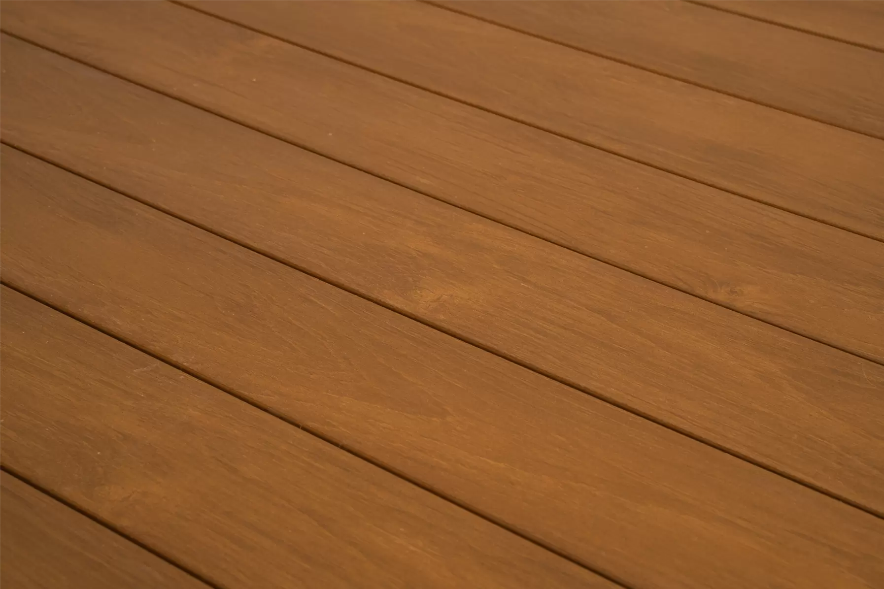 Blat stołu z kompozytu drewnianego o wyglądzie drewna teakowego.