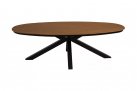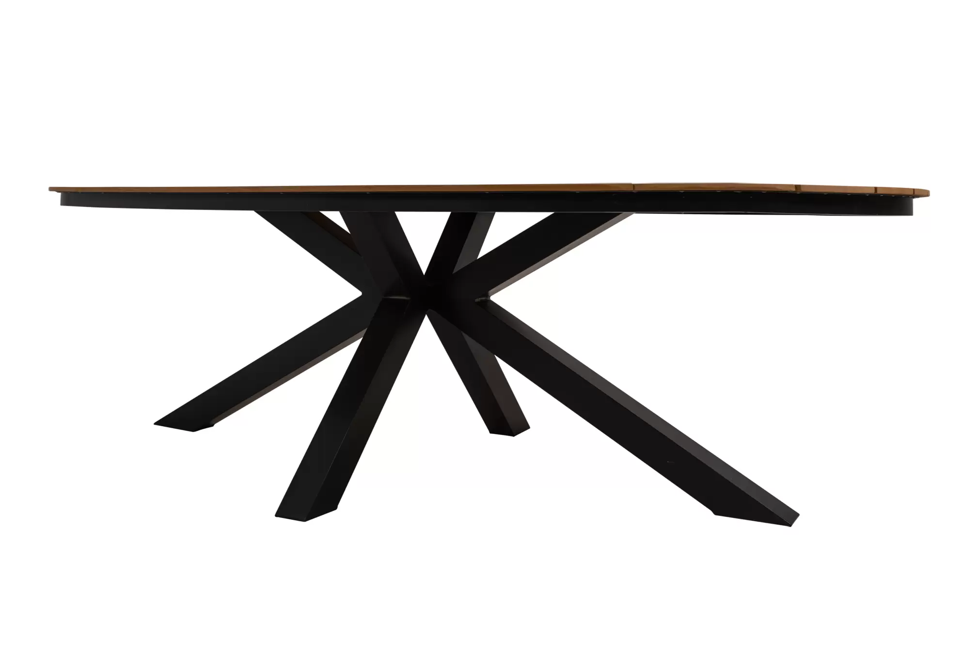 Aluminiowy stół obiadowy owalny o ciemnoszarych nogach. Blat kompozytowy o wyglądzie drewna teakowego.